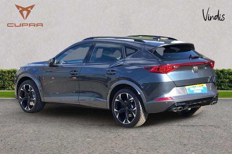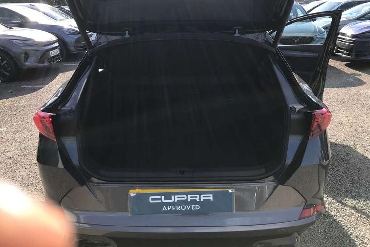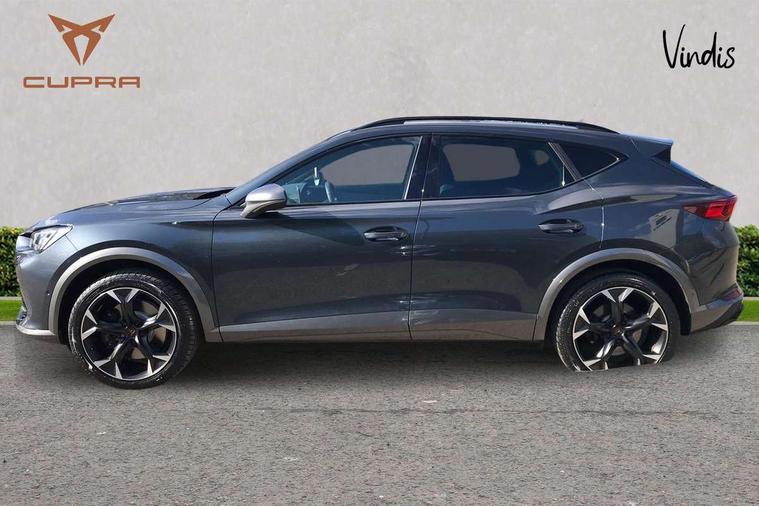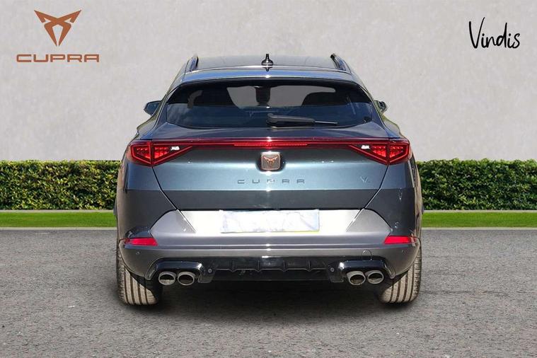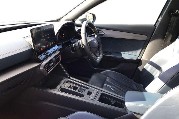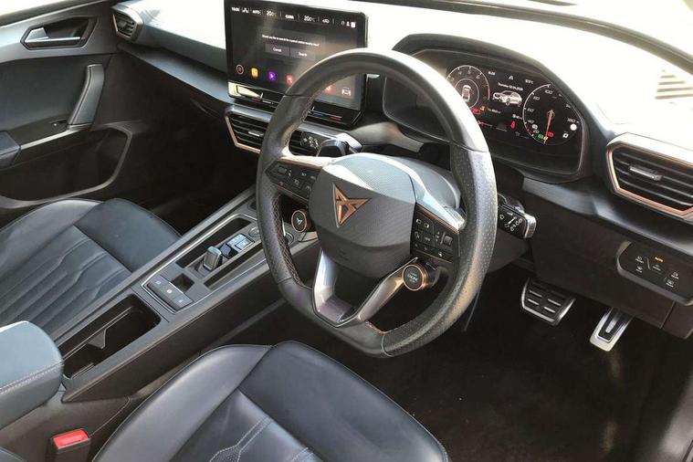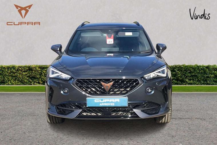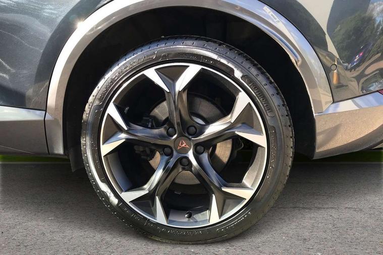 Digital cockpit and configurable dashboard, Driver alert system, Dynamic chassis control with driving profile selection (Comfort, Sport, CUPRA, Individual), Forward collision warning with automatic braking, Lane assist, Navigation system with 12'' Touchscreen Display, Park assist (inc front/rear parking sensors), Predictive adaptive cruise control with speed limiter, RPM, trip computer, outside temp gauge, instrument light brightness, low fuel warning light, lights on reminder, gearshift indicator, Service interval indicator, Speed sensitive power steering, Start/stop system with regenerative braking, Virtual pedal and electric tailgate, Voice control system, Wired Android Auto, Wireless apple carplay, Wireless phone charger, Electronic locking differential and dynamic traction support, Sports suspension with front shock absoption, 2 front and 2 rear USB type C sockets, Auxiliary input socket, DAB radio, Auto dimming rear view mirror, Body colour door handles, Body coloured bumpers, Dark grey wing mirror, Daytime running light with automatic headlight control and coming home feature, Dynamic headlight range control, Electric front/rear windows, Electrically adjustable heated and folding door mirrors with memory function, Front fog lamps with cornering function, Gloss black roof rails and window surrounds, LED Headlights, LED Taillights with dynamic indicator, Rain sensing wipers, Rear diffuser with twin exhaust pipe on each side, Rear side wing doors, Rear wash/wipe, Sports bumpers, Third brake light, Tinted rear windows, VZ logo rear badging, Welcome lights, 12v power supply in centre console, 12V socket, 12v socket in loadspace, 2 front and 2 rear reading lights, 230V socket, 3 seat bench in 2nd row, 60/40 split rear bench seat with armrest and mechanical seat release, Black headlining, Cupra sports pedals, Dust/pollen filter, Front and rear head restraints, Front centre armrest, Height/reach adjust steering wheel, Illuminated interior front door sills, Illuminated sunvisor with mirror, Isofix, Leather heated multi-function sports steering wheel with start stop, CUPRA mode button and gear shift paddles, Luggage tie-down hooks, Single front passenger seat, Three zone climate control with control panel in rear, Variable luggage/load compartment floor, Wraparound lighting, Genuine Nappa leather Pack - Cupra, Safety and driving pack (XL) - Formentor, 3 point seatbelts on all rear seats, ABS, Brake control system - ESC and brake booster, Child proof door locks, Driver and front passenger airbags with front passenger airbag de-activation, Electronic parking brake, Front and rear disc brakes, Front side curtain airbags, Hill hold control, Public e-call, Seat belt reminder for front and rear seats, Tyre pressure monitoring system, Anti theft alarm system, Keyless entry and start system (KESSY), Locking wheel bolts, Copper and aluminium interior detailing, 19" 'Exclusive' machined sport matte black and silver alloy wheels, Space saver spare wheel,