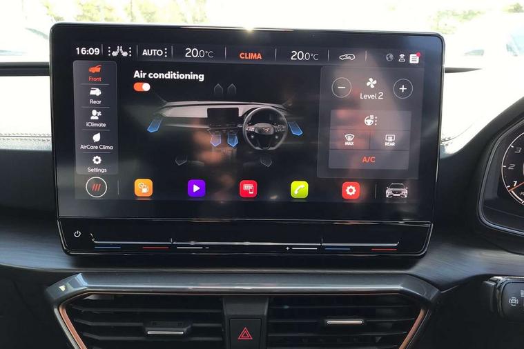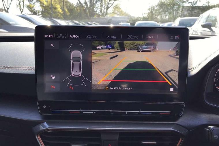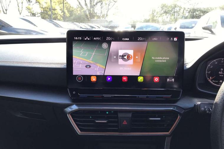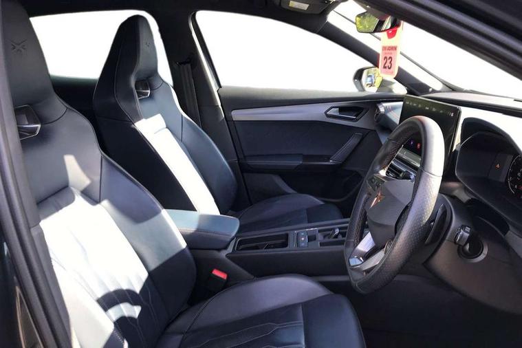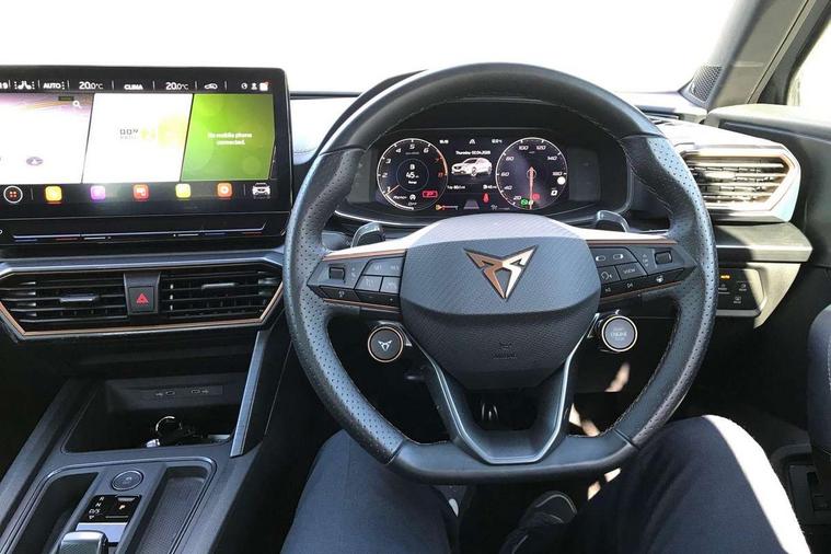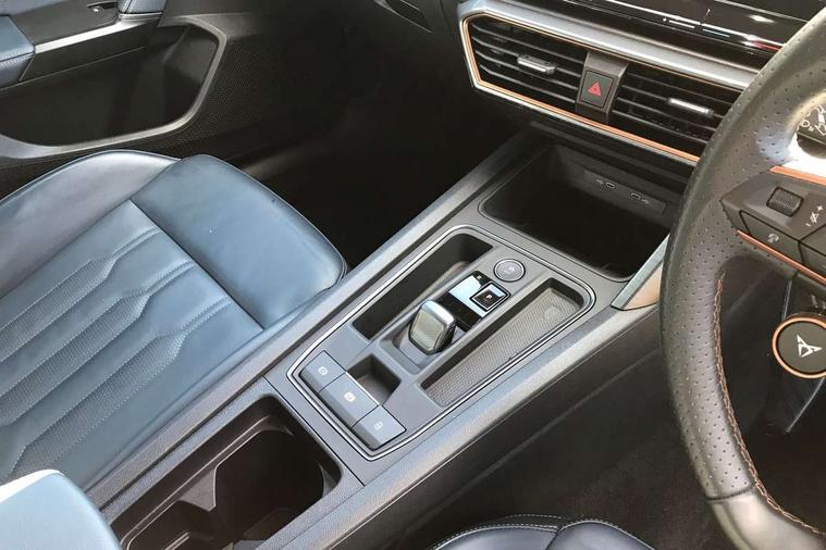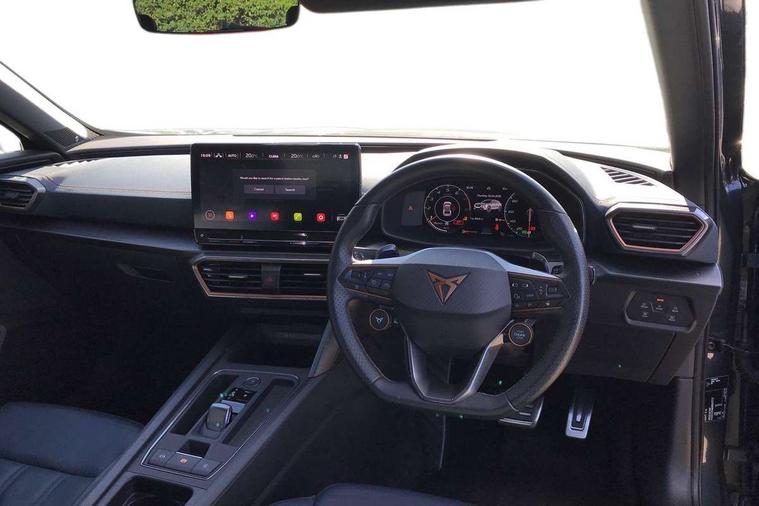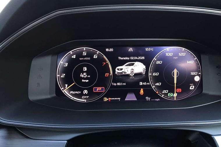 Digital cockpit and configurable dashboard, Driver alert system, Dynamic chassis control with driving profile selection (Comfort, Sport, CUPRA, Individual), Forward collision warning with automatic braking, Lane assist, Navigation system with 12'' Touchscreen Display, Park assist (inc front/rear parking sensors), Predictive adaptive cruise control with speed limiter, RPM, trip computer, outside temp gauge, instrument light brightness, low fuel warning light, lights on reminder, gearshift indicator, Service interval indicator, Speed sensitive power steering, Start/stop system with regenerative braking, Virtual pedal and electric tailgate, Voice control system, Wired Android Auto, Wireless apple carplay, Wireless phone charger, Electronic locking differential and dynamic traction support, Sports suspension with front shock absoption, 2 front and 2 rear USB type C sockets, Auxiliary input socket, DAB radio, Auto dimming rear view mirror, Body colour door handles, Body coloured bumpers, Dark grey wing mirror, Daytime running light with automatic headlight control and coming home feature, Dynamic headlight range control, Electric front/rear windows, Electrically adjustable heated and folding door mirrors with memory function, Front fog lamps with cornering function, Gloss black roof rails and window surrounds, LED Headlights, LED Taillights with dynamic indicator, Rain sensing wipers, Rear diffuser with twin exhaust pipe on each side, Rear side wing doors, Rear wash/wipe, Sports bumpers, Third brake light, Tinted rear windows, VZ logo rear badging, Welcome lights, 12v power supply in centre console, 12V socket, 12v socket in loadspace, 2 front and 2 rear reading lights, 230V socket, 3 seat bench in 2nd row, 60/40 split rear bench seat with armrest and mechanical seat release, Black headlining, Cupra sports pedals, Dust/pollen filter, Front and rear head restraints, Front centre armrest, Height/reach adjust steering wheel, Illuminated interior front door sills, Illuminated sunvisor with mirror, Isofix, Leather heated multi-function sports steering wheel with start stop, CUPRA mode button and gear shift paddles, Luggage tie-down hooks, Single front passenger seat, Three zone climate control with control panel in rear, Variable luggage/load compartment floor, Wraparound lighting, Genuine Nappa leather Pack - Cupra, Safety and driving pack (XL) - Formentor, 3 point seatbelts on all rear seats, ABS, Brake control system - ESC and brake booster, Child proof door locks, Driver and front passenger airbags with front passenger airbag de-activation, Electronic parking brake, Front and rear disc brakes, Front side curtain airbags, Hill hold control, Public e-call, Seat belt reminder for front and rear seats, Tyre pressure monitoring system, Anti theft alarm system, Keyless entry and start system (KESSY), Locking wheel bolts, Copper and aluminium interior detailing, 19" 'Exclusive' machined sport matte black and silver alloy wheels, Space saver spare wheel,