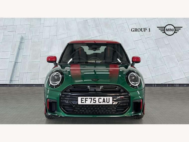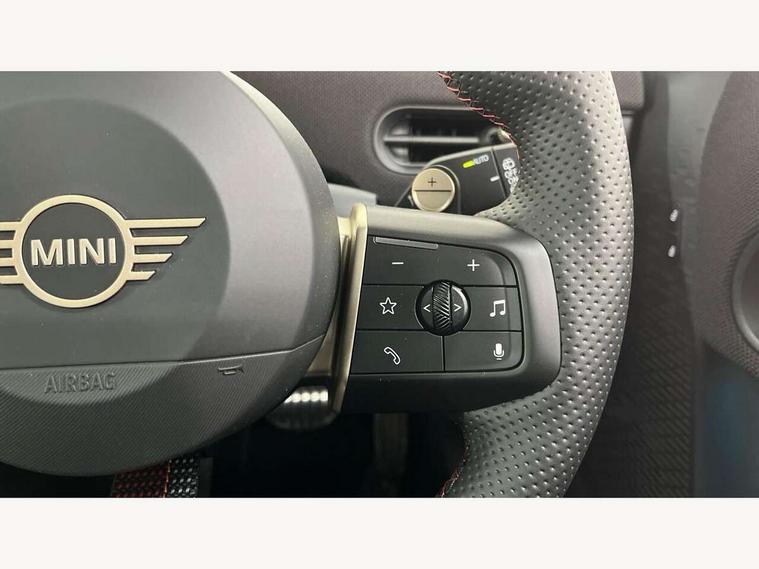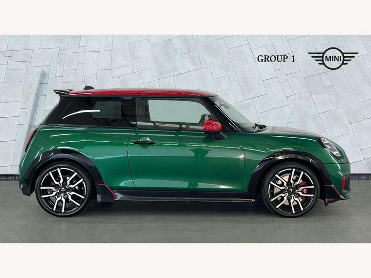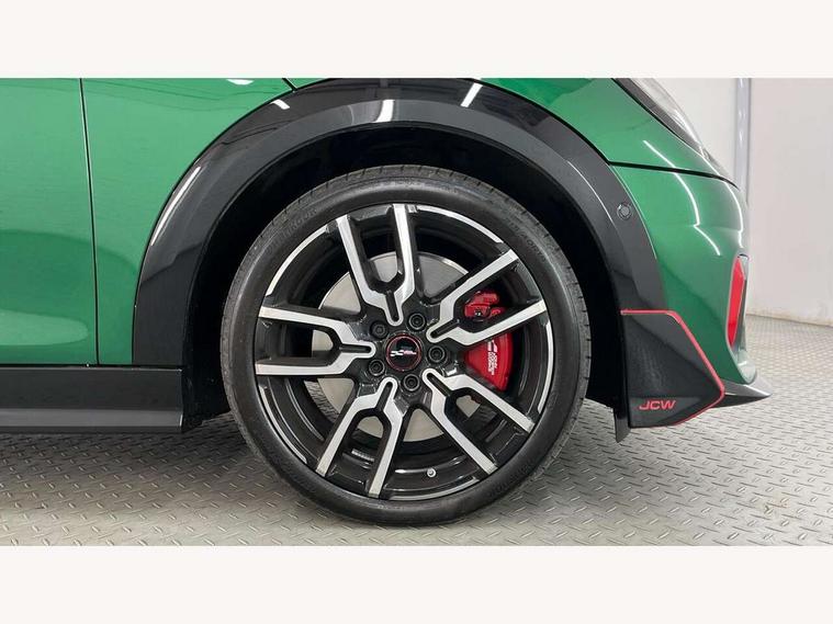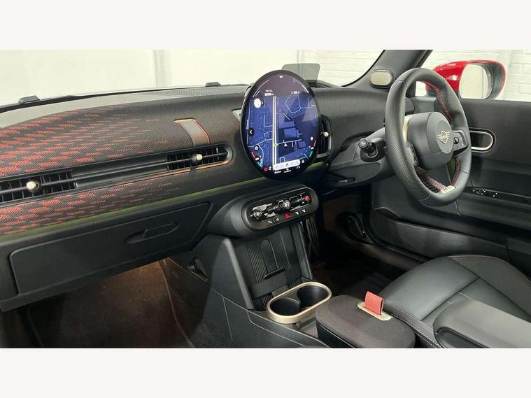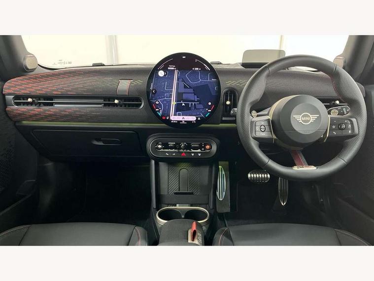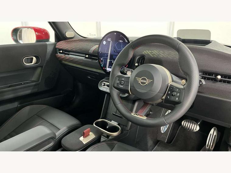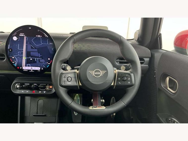 Central toggle bar, Circular OLED Screen, Compatible mobile phone bluetooth with audio streaming, Cruise control, Digital instrument cluster, Electro-mechanical speed dependant steering assistance, Emergency call service, Gaming controller with intelligent personal assistant voice update, JCW bespoke experience mode, Mini navigation system, On board computer, Service interval indicator, Tailgate, 7 speed sport transmission with double clutch, Adaptive suspension, JCW exhaust system, DAB Digital radio, Harman Kardon sound system, Personal eSim, Rear USB charger, Auto headlights, Electric adjustable heated door mirrors, Electric front windows, Front and rear apron, Heated rear window, Heated windscreen washer jets, High gloss black wheel arches, High gloss hexagonal patterned grille surround, JCW body kit, LED 3rd brake light, LED daytime running lights, LED indicator lights, LED rear lights, Rain sensor window wipers, Rear fog lights, Rear roof spoiler with airblades, Rear window wiper, 2 seat bench in second row, 2 zone automatic air conditioning, 60/40 rear seat bench, Ambient lighting, Black lower band in high gloss, Cupholders, Dark headliner, Floor mats, Front and rear head restraints, Front compact armrest, Heated steering wheel, Height adjustable passenger seat, Lidded storage box in Black/Red knit, Luggage compartment lighting, Partially perforated vescin steering wheel with red accent, black/red decorative strap, Single front passenger seat, Stainless steel pedals, Steering wheel paddle shift, Sunvisors with vanity mirrors, Driving assistant pack - Cooper Hatchback, Level 1 pack - Mini Hatchback, Park assistant pack - Cooper Hatchback, 3 point seatbelts on all four seats, 6 Airbags - front, side, head and seat belt tensioners, Anti-lock braking system (ABS), DSC - Dynamic Stability Control, Electronic parking brake, Front and rear disc brakes, Front ISOFIX (iSize), Front passenger airbag deactivation, JCW Sport Brakes, Red brake callipers with JCW badge, Traction control, Tyre pressure monitoring system, Alarm, Immobiliser, Remote central locking, Black/Red decorative dash strap, Tyre repair kit,