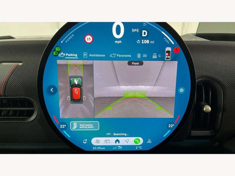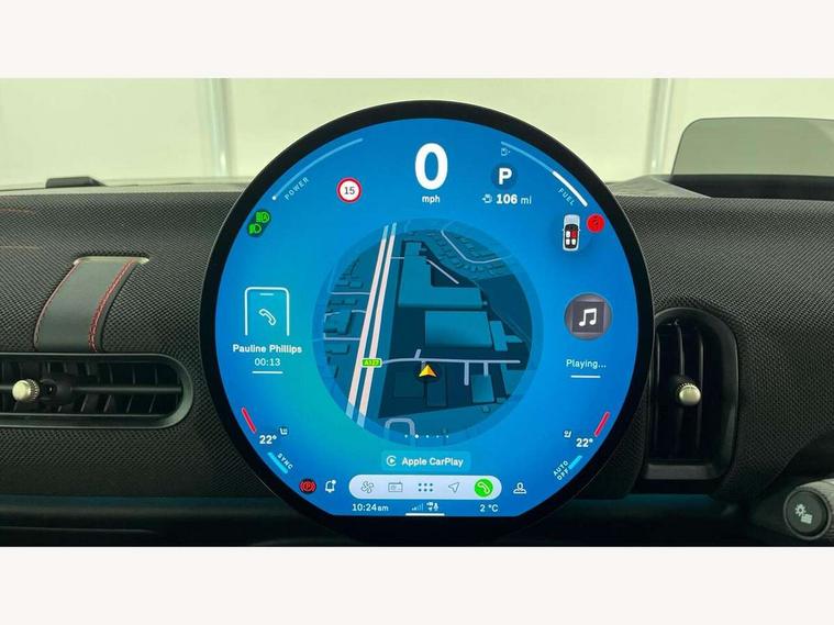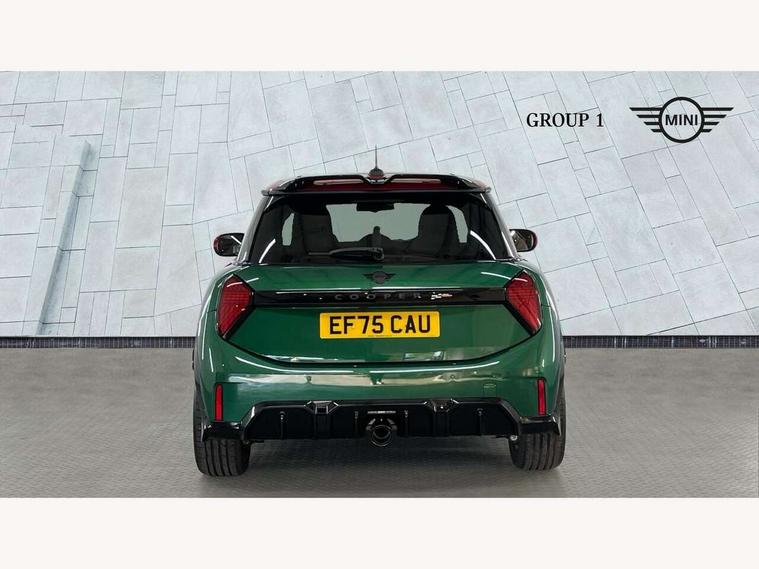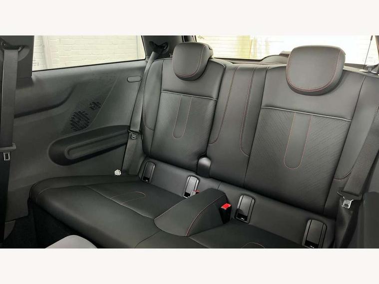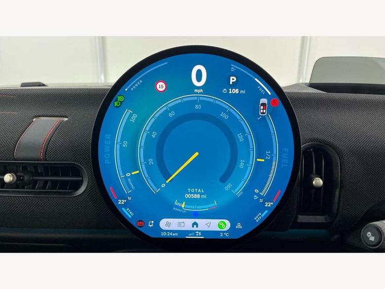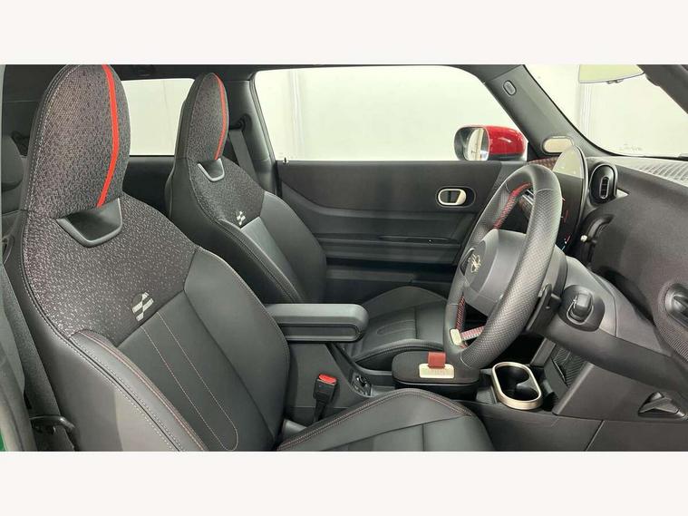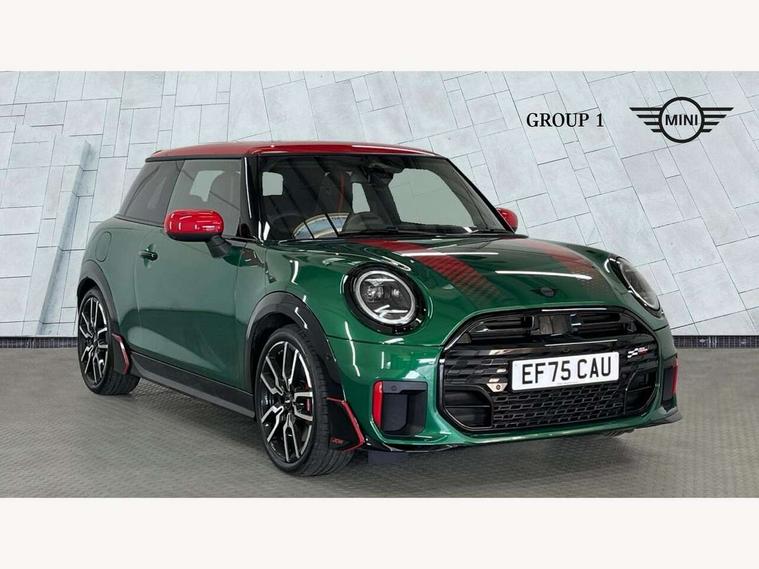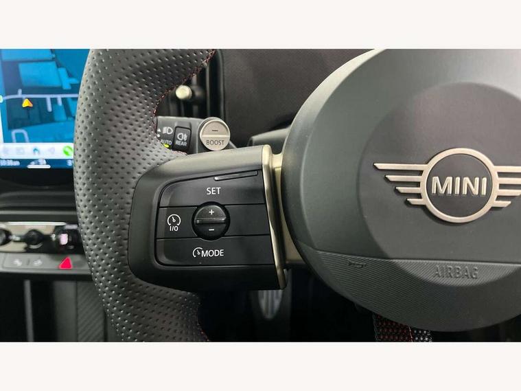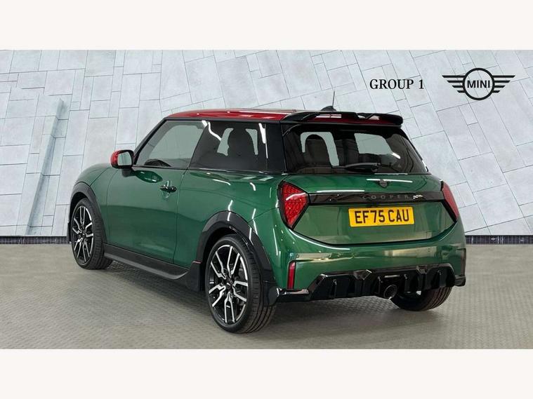 Central toggle bar, Circular OLED Screen, Compatible mobile phone bluetooth with audio streaming, Cruise control, Digital instrument cluster, Electro-mechanical speed dependant steering assistance, Emergency call service, Gaming controller with intelligent personal assistant voice update, JCW bespoke experience mode, Mini navigation system, On board computer, Service interval indicator, Tailgate, 7 speed sport transmission with double clutch, Adaptive suspension, JCW exhaust system, DAB Digital radio, Harman Kardon sound system, Personal eSim, Rear USB charger, Auto headlights, Electric adjustable heated door mirrors, Electric front windows, Front and rear apron, Heated rear window, Heated windscreen washer jets, High gloss black wheel arches, High gloss hexagonal patterned grille surround, JCW body kit, LED 3rd brake light, LED daytime running lights, LED indicator lights, LED rear lights, Rain sensor window wipers, Rear fog lights, Rear roof spoiler with airblades, Rear window wiper, 2 seat bench in second row, 2 zone automatic air conditioning, 60/40 rear seat bench, Ambient lighting, Black lower band in high gloss, Cupholders, Dark headliner, Floor mats, Front and rear head restraints, Front compact armrest, Heated steering wheel, Height adjustable passenger seat, Lidded storage box in Black/Red knit, Luggage compartment lighting, Partially perforated vescin steering wheel with red accent, black/red decorative strap, Single front passenger seat, Stainless steel pedals, Steering wheel paddle shift, Sunvisors with vanity mirrors, Driving assistant pack - Cooper Hatchback, Level 1 pack - Mini Hatchback, Park assistant pack - Cooper Hatchback, 3 point seatbelts on all four seats, 6 Airbags - front, side, head and seat belt tensioners, Anti-lock braking system (ABS), DSC - Dynamic Stability Control, Electronic parking brake, Front and rear disc brakes, Front ISOFIX (iSize), Front passenger airbag deactivation, JCW Sport Brakes, Red brake callipers with JCW badge, Traction control, Tyre pressure monitoring system, Alarm, Immobiliser, Remote central locking, Black/Red decorative dash strap, Tyre repair kit,