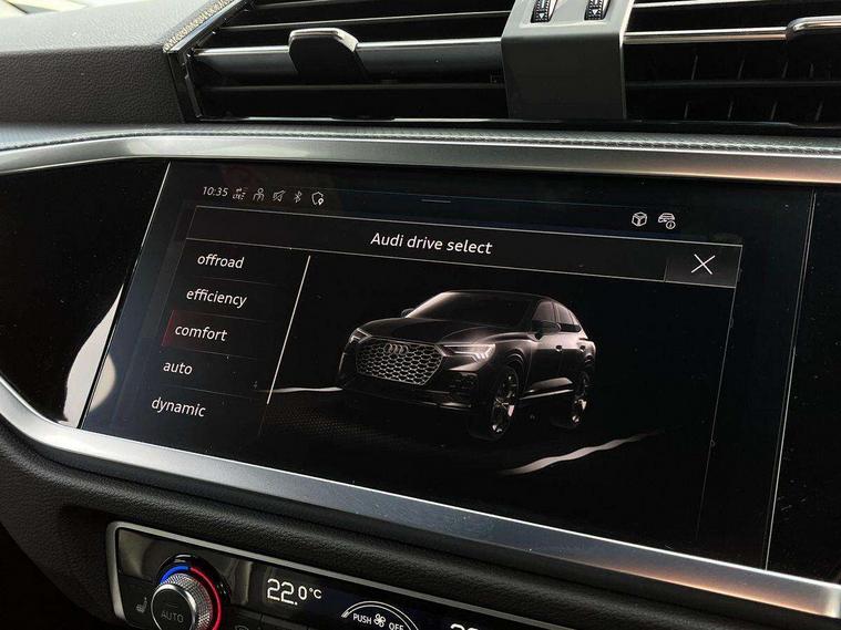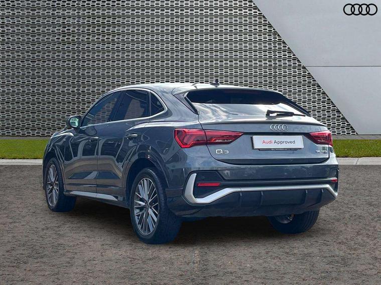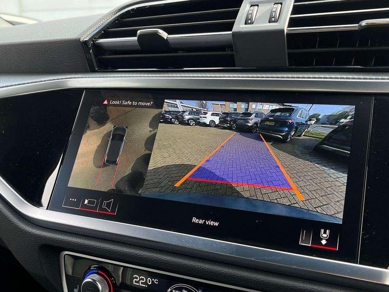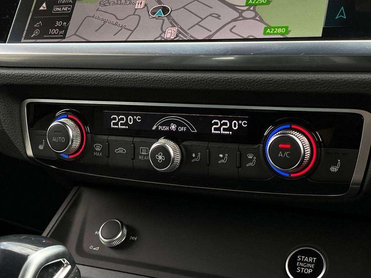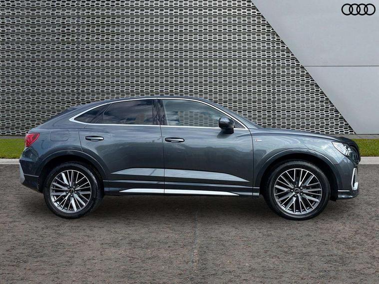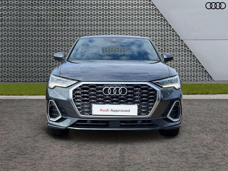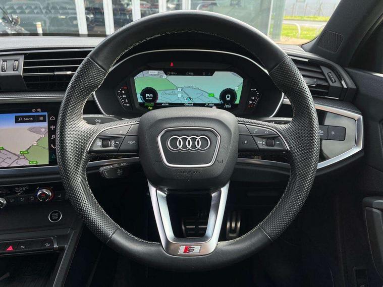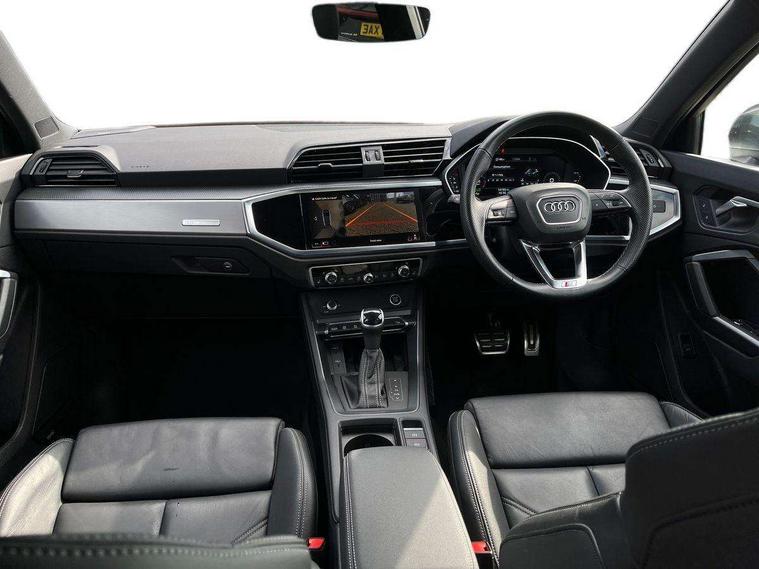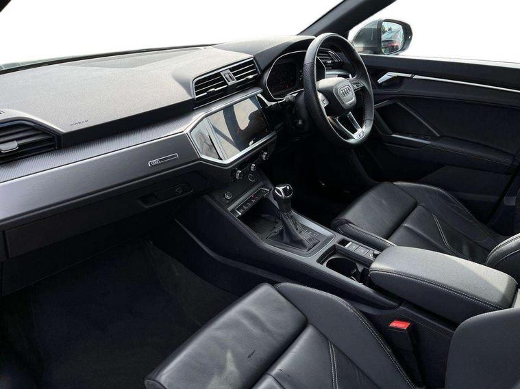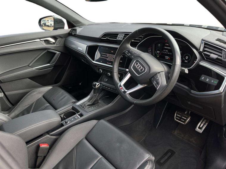 Audi connect safety and service, Audi drive select, Audi lane departure warning, Audi Virtual Cockpit - 10.25" display, Bluetooth interface, Camera based traffic sign recognition, Distraction and Fatigue warning, Legal emergency call, MMI Navigation Plus with high resolution 10.1 inch touchscreen colour display, Power operated tailgate, Progressive steering, Service interval indicator, Smartphone interface includes wireless Apple carplay/Android Auto, Start stop system with recuperation, Voice control system with natural language interaction, Sports suspension, 2 USB-C ports with charge and data functions, 6 passive loudspeakers, DAB digital radio module, Acoustic windscreen, Aluminium window trim, Auto dimming door mirrors, Auto dimming frameless rear view mirror, Diffuser grille in grained matt black, Diffuser trim in selenite silver, Electrically folding, adjustable and heated door mirrors with integrated LED side indicators and kerb view function for passenger side, Front and rear electric windows, Front fog lights, Front side air inlets in selenite silver, Front underbody protection in manhattan grey paint finish, Grille surround in aluminium silver matt, High gloss black finish B and C pillars, LED Dynamic rear indicators, LED headlights with LED daytime running lights, LED rear lights, LED third brake light, Privacy glass dark tinted rear and rear-side windows (from B-pillar backwards), Radiator grille in anthracite black with inlay in matt aluminium silver, Rain and light sensors, Rear side wing doors, Rear underbody protection in matt black, Rear wiper, S line badges on front wings, S line front and rear bumpers and side skirts in contrasting Manhattan grey paint finish, Side skirt insert in matt Platinium grey, Variable front intermittent wipers, 12V socket in rear centre console, 3 seat bench in 2nd row, 3 spoke leather multifunction steering wheel features S badging and grips in perforated leather with contrast stitching, 40:20:40 folding with manual adjustment for 60:40 forwards/backwards position and backrest angle, Adjustable rear seat bench/backrest with centre armrest and cupholder, Black cloth headlining, Dual zone electronic climate control, Electric lumbar support, Front and rear black floor mats with contrast stitching, Front and rear headrests, Front centre armrest, Height and reach adjustable steering wheel, Illuminated door sill trims with S logo, ISOFIX child seat mounting for front passenger with airbag deactivation and outer rear seat including top tether attachment point for outer rear seats, Luggage compartment sill protection in stainless steel, Manual front seats with height adjustment, Perforated leather gearknob, Single front passenger seat, Stainless steel pedals, Twin leather upholstery with front sport seats + S embossing, Non smoking pack - Q3, 3x3 point rear seatbelts, 6 airbags - Driver, front passenger, curtain and side windows, Audi pre-sense front with pedestrain and cyclist recognition, Electrically operated child locks on rear doors, Electromechanical parking brake, Electronic stabilisation control including ABS, ASR and EDL, Front seatbelt reminder, Hill descent control, Hill hold assist, Pre sense basic, Seatbelt monitoring, Tyre pressure warning, Warning triangle and first aid kit, Anti theft alarm, Anti theft wheel bolts, Immobiliser, Remote central locking, Aluminium look interior elements, Dark matt brushed aluminium inlay, Detail dashboard around MMI touch colour display in glass look, black with surround in aluminium look, Leatherette door armrest,