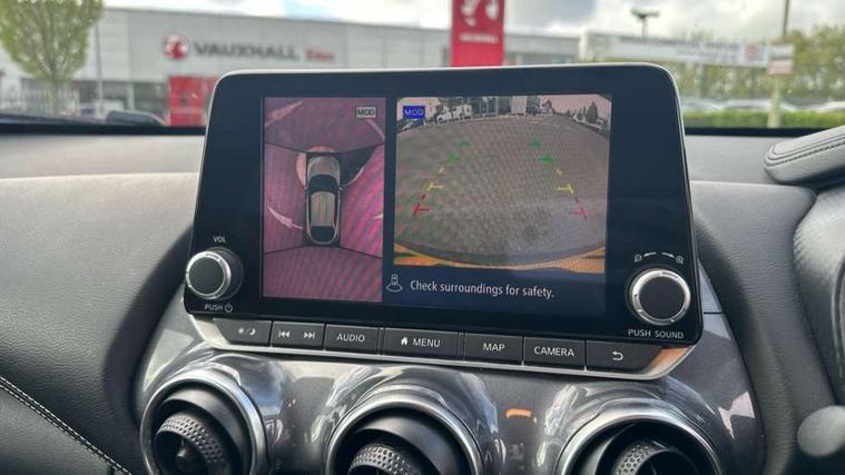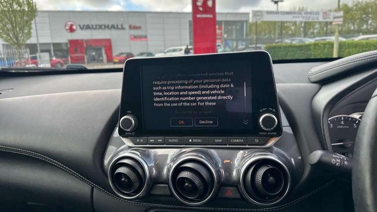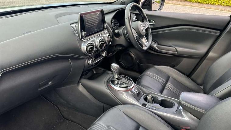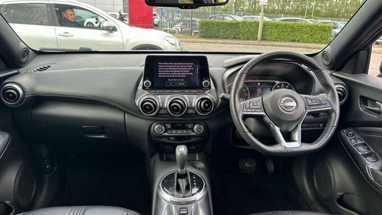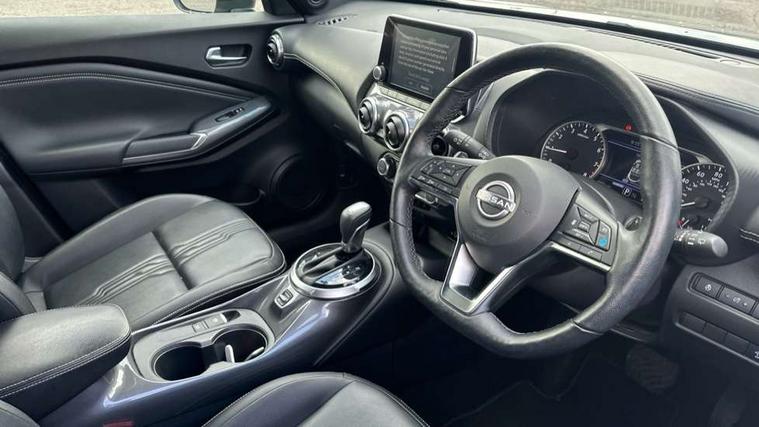 7" full colour TFT screen combimeter, Apple CarPlay and Google Android auto, Drive modes select (Eco, normal and sport), Emergency and breakdown call, Front parking sensor, Idle start/stop system, Intelligent lane intervention, Lane departure warning system, Nissan connect 8" touch screen entertainment system, Nissan connect nav with TomTom traffic, Nissan connect services and Wifi connection, Outside temperature sensor, Power Steering, Rear parking sensor, Traffic sign recognition, Trip computer, Voice recognition, Gasoline particulate filter, 10 Bose speakers 6 speakers and 2 headrest speakers for driver/passenger seats, Bluetooth system, USB, Aux-in and 12V socket, Bose personal sound stage control, DAB Digital radio, Rear console USB port, Auto dimming interior rear view mirror, Auto headlights, Automatic hazard signal with emergency stop signal, Body colour bumpers, Body colour door handles, Electrically adjustable door mirrors with integrated indicators, Follow me home headlights, Front and rear electric window with one touch driver window, Heated and auto folding door mirrors, High beam assist, LED daytime running lights, LED front fog lights, LED headlamps, LED rear fog lamp, LED rear lamps, Rain sensor windscreen wipers, Rear privacy glass, Rear side wing doors, Rear wiper, Thermaclear heated windscreen, Three blink turn signal, 3 height adjustable rear headrests, 3 seat bench in 2nd row, 60/40 split folding rear seat, Automatic climate control, Card holder on driver sunvisor, Door ambient lighting, Driver and passenger sliding and reclining seats, Driver seat back pocket, Driver side rear coat hanger, Driver/passenger sunvisors and vanity mirrors, Front and rear cabin lights, Front armrest, Front door pockets with bottle holders, Front head restraints, Front passenger isofix child seat anchorage point, Front/rear passenger grab handles, Gear console ambient circle lighting, Grey synthetic leather kneepad, Heated front seats, Height adjustable driver's seat, Height adjustable passenger seat, Internal chrome door handles, Leather gearshift knob, Leather steering wheel, Luggage board, Luggage space lighting, Monoform sporty seats, Multifunction steering wheel, Passenger seat back pocket, Rear door bottle holders, Single front passenger seat, Steering wheel mounted gearshift paddles, Synthetic leather upholstery, Telescopic steering wheel adjustment, Two cupholders in front centre console, Two rear isofix child seat anchorage points with top tether, Welcome light and console tray ambient lighting, ProPilot pack - Juke, ABS with EBD and brake assist, Active ride control, Active Trace Control, Driver and passenger airbags, Driver and passenger side airbags, Electric handbrake with auto hold function, Electronic Stability Programme (ESP), Front and rear curtain airbags, Height adjustable seatbelts, Hill start assist, Intelligent emergency braking with pedestrian and cyclist recognition, Rear door child safety locks, Seatbelt reminder for driver/front passenger and rear seats, Single tone horn, Three 3 point rear seatbelts, Traction control, Tyre pressure monitoring system, VDC Dynamic Vehicle Control, Ventilated rear brake discs, Alarm, Immobiliser, Intelligent key and start push button with walk away lock and approach unlock functions, Remote central locking,