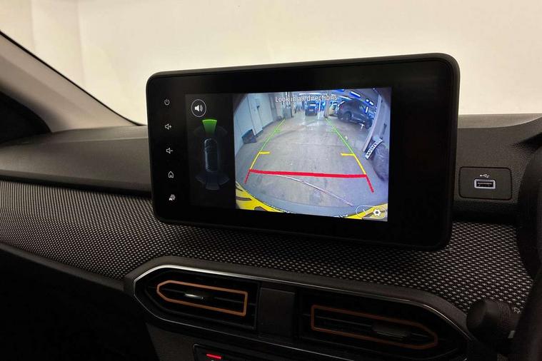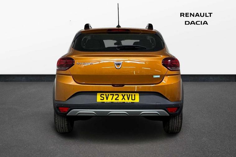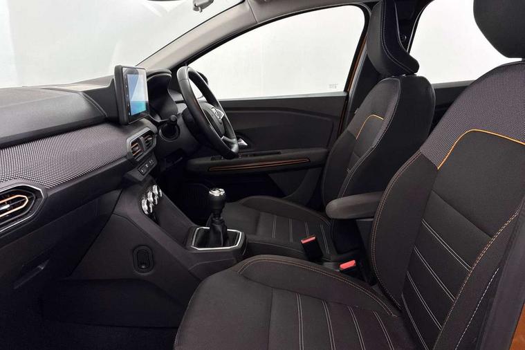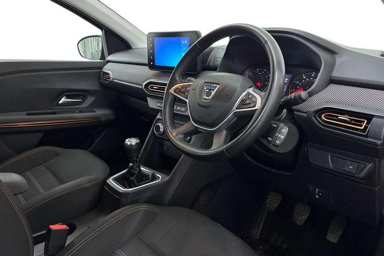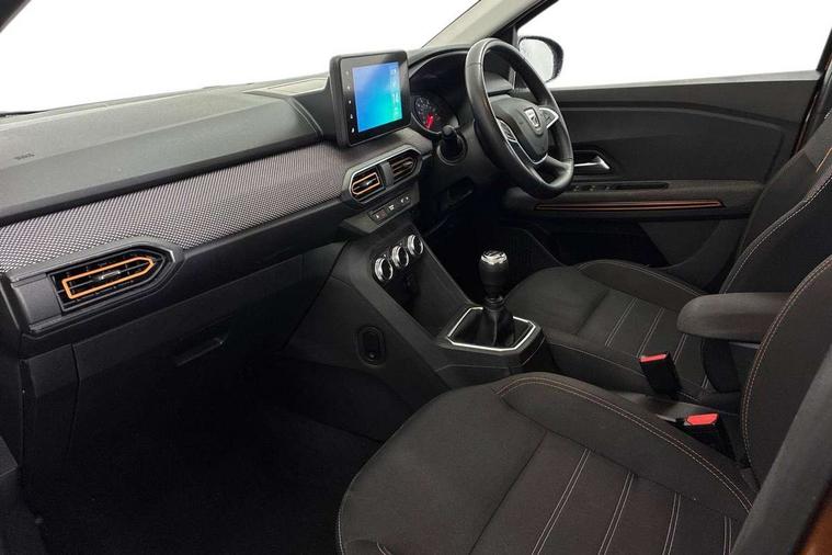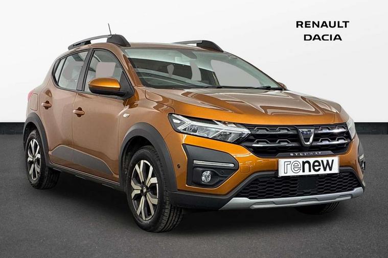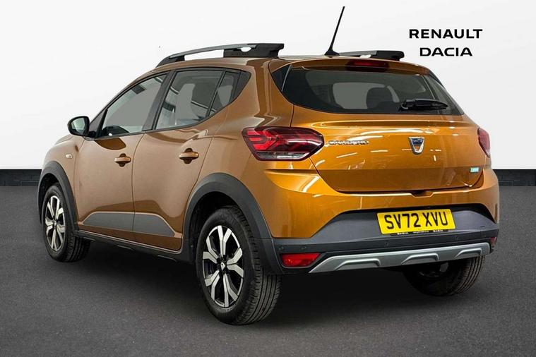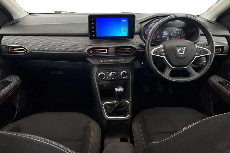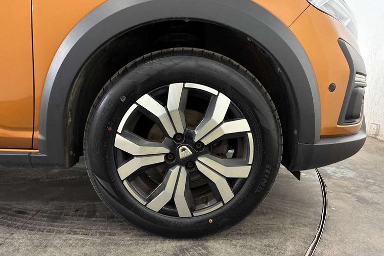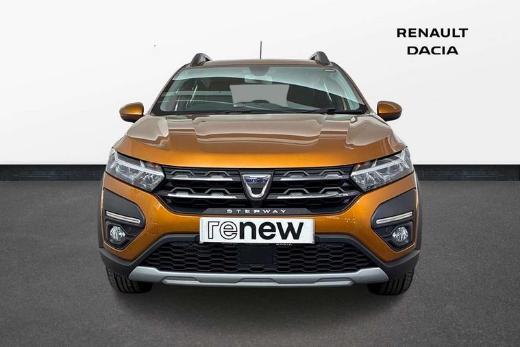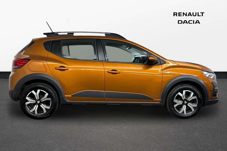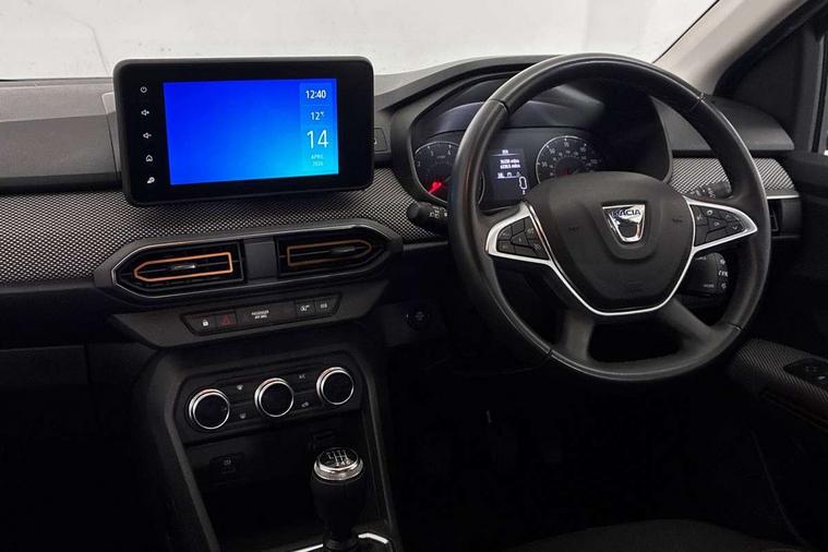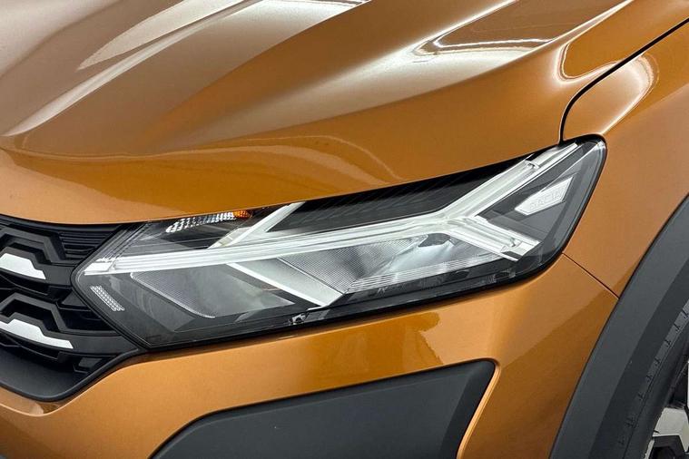 3.5" TFT instrument panel with on-board computer, Blind spot warning, Cruise control with speed limiter, eCall emergency call system, Eco mode, Electric power assisted steering, Front parking sensors, Rear parking sensors, Rev counter, Reversing camera, Stop/start system, 8" MediaNav - DAB Radio, Wifi smartphone replication, Bluetooth, 6 speakres, Apple CarPlay and Android Auto, USB connection for data transfer and charging, USB socket, 3 speed windscreen wipers, Auto lighting, Automatic wipers, Body colour door handles, Body colour door mirrors, Body coloured bumpers, Chrome longitudinal roof bars, Chrome radiator grille, Electrically adjustable and heated door mirrors, Front fog lights, Heated rear window, High level third brake light, LED automatic daytime running lights, LED Y-shape Dacia signature lighting, Modular roof bars, One touch electric front windows, Rear electric windows, Rear side wing doors, Rear wash/wipe, Stepway inscription on radiator grille and roof bars, Tinted windows, 1/3 to 2/3 split folding rear seats, 12 volt front socket, 12 volt rear socket, 3 height adjustable rear headrests, 3 seat rear bench, Automatic air conditioning, Driver + passenger vanity mirrors, Fabric upholstery, Fixed smartphone holder on dashboard, Gear shift indicator, Height adjustable driver seat, Height adjustable front headrests, Height/depth adjustable steering wheel, High central armrest with console storage, Isofix points for child seats in both outer rear seats, Satin chrome interior door handles, Satin Chrome/Copper orange air vents, Single front passenger seat, Soft feel steering wheel, Steering wheel controls, 3x3 point rear seatbelts, ABS and Emergency brake assist, Automatic emergency braking system, Child locks on rear doors, Door open warning, Driver airbag, Electronic parking brake, ESC (Electronic Stability Control), ESP + Hill Start Assist, Front curtain airbags, Front seatbelt pretensioners, Front side airbags, Height adjustable front seatbelts, Passenger airbag, Seatbelt reminder for driver and front passenger, Tyre pressure monitor, Automatic central locking, Immobiliser, Keyless entry, Remote central locking, Decopart on instrument panel and door with textile, 16" Diamond-effect alloy wheels, Tyre inflation kit,