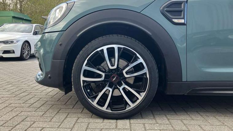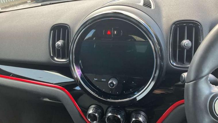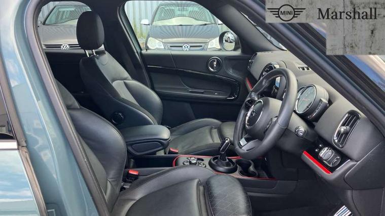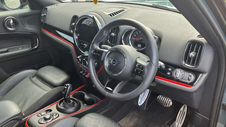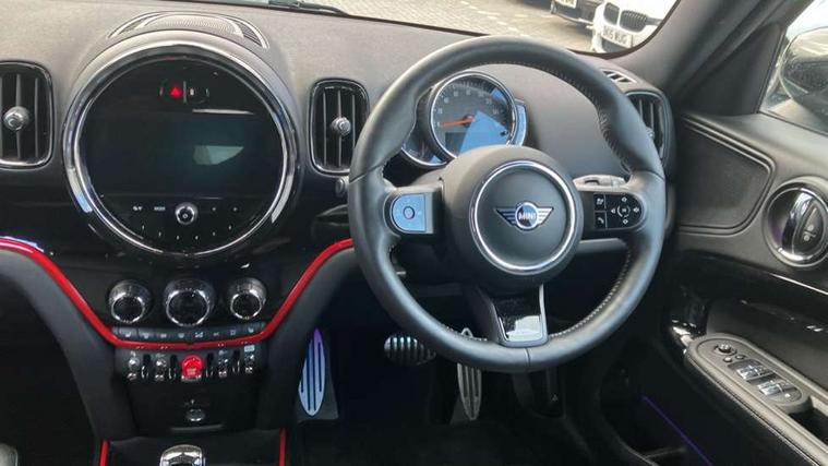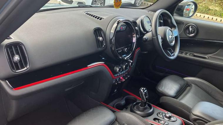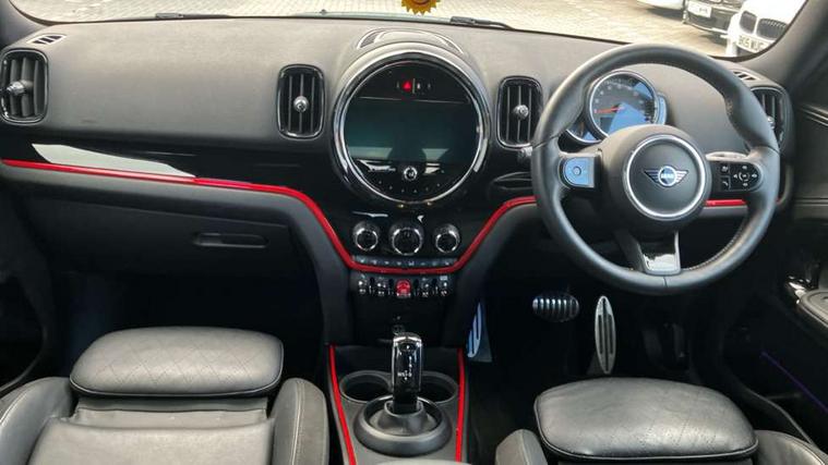 Active Guard incl speed limiting and lane departure functions with auto steering, and front collision warning with brake intervention, Automatic start/stop function with brake energy recuperation, Compatible mobile phone bluetooth with audio streaming, Cruise control with brake assist, Electro-mechanical speed dependant steering assistance, Instrument cluster, MINI Driving Modes - centre toggle switch to control driving setting (sport, mid and green), Mini E-call, On board computer, Rear parking distance control, 51 Litre fuel tank, Double Vanos system, Fully variable valve control, High precision injection, Performance Control, Steptronic transmission with double clutch, FM tuner and DAB digital radio, 3rd brake light, Body colour fuel filler cap, Day time driving lights, Door sill strips, Dynamic brake lights, Electric windows, Heated rear window, Heated windscreen washer jets, John Cooper Works - aerodynamic kit (front and rear apron, spoiler), front and rear sport bumpers and part-painted side sills with door sill finishers, John Cooper Works Logo, LED fog lights, LED Headlights, Model logo, Model logo on Tailgate, Rain sensor with auto headlights, Rear fog lights, Rear side wing doors, Rear window wiper, Side scuttle panel with integrated indicator, Split rear doors, Sun/heat protection glass, White indicator lenses, 12V socket in centre console, 3 seat bench in 2nd row, 360L luggage compartment capacity, 4 lashing eyes in luggage compartment, 40:20:40 split folding rear seats, Anthracite headlining with grab handles and clothes hooks, Chrome interior highlights, Colour line - Carbon black, Cupholders, English handbook, Floor mats, Front headrests, Glove compartment, Height and length steering column adjustment, Interior lighting with 12 basic colours selectable via toggle switch in roof, Isofix rear child seat preparation, LED reading lights, vanity mirror lights, front foot well light and spotlight on front seats, Manual air conditioning, Mini John Cooper Works leather gearshift lever and handbrake gaiters, Multifunction steering wheel, Nappa leather steering wheel with MINI Yours logo, Rear headrests, Single front passenger seat, Stainless steel pedals and foot rest, Storage compartments in doors, Sunvisors with vanity mirrors, Excitement pack - Countryman, Navigation pack - Countryman, Piano black exterior pack - Countryman, 2 tone horn, 3 point seatbelts on all seats, 6 Airbags - front, side, head and seat belt tensioners, Anti-lock braking system (ABS), DSC - Dynamic Stability Control, Electronic handbrake, Front and rear disc brakes, Hill start assist, Manual rear child locks, Tyre pressure monitoring system, Alarm system with tilt sensor, monitoring doors, bonnet interior and tailgate, Auto drive away locking, Deadlocking function, Electronic vehicle immobiliser, Locking wheel bolts, Start/stop toggle with keyless go, Piano black JCW interior trim, Tool kit,