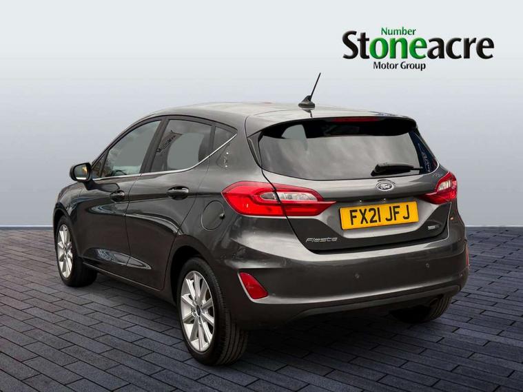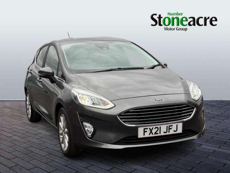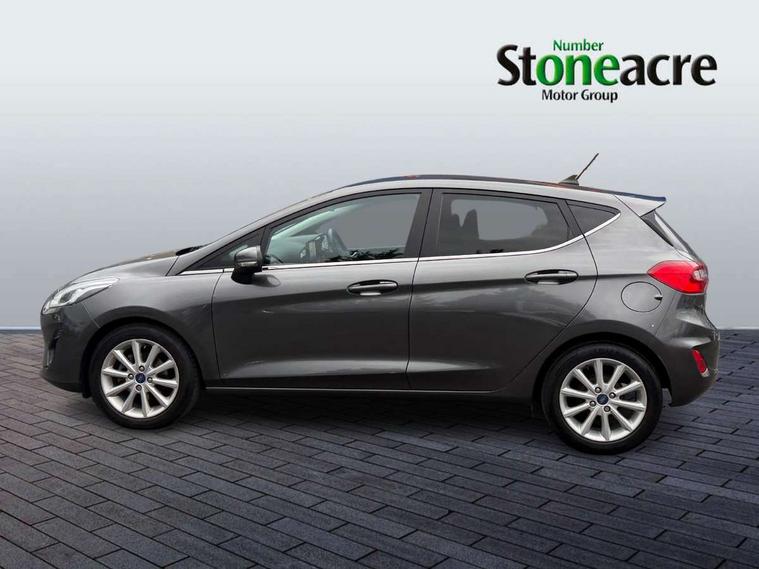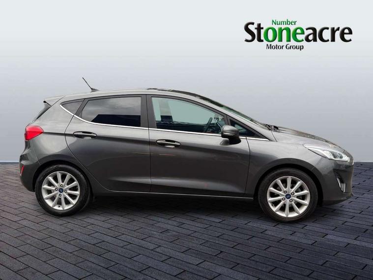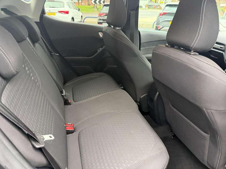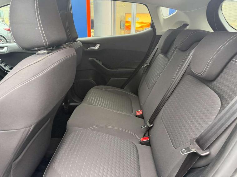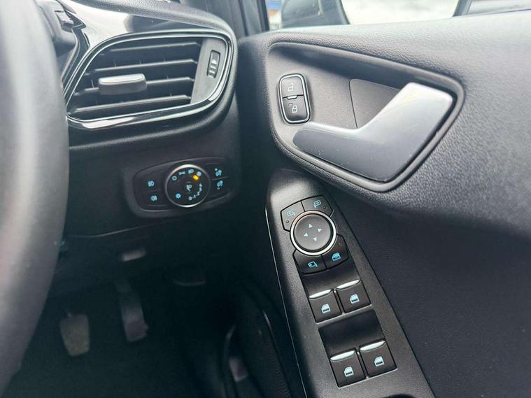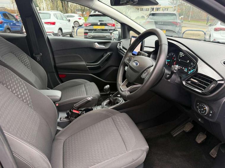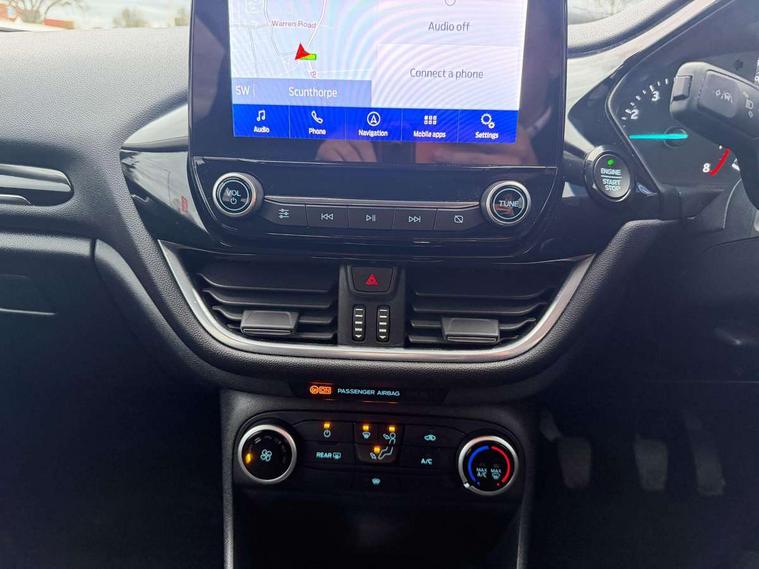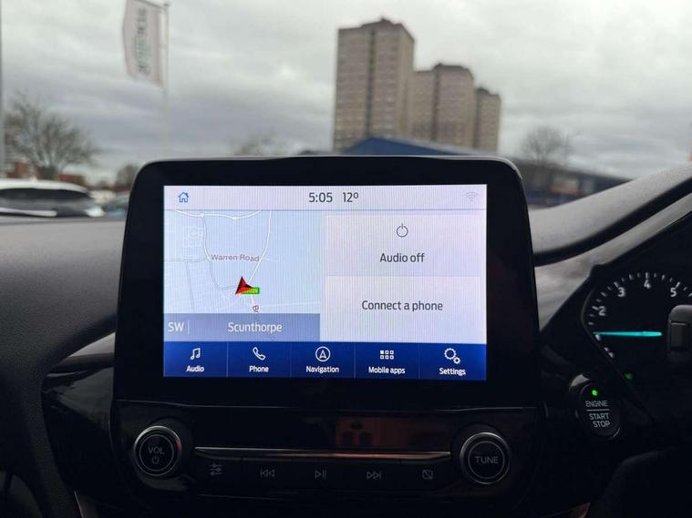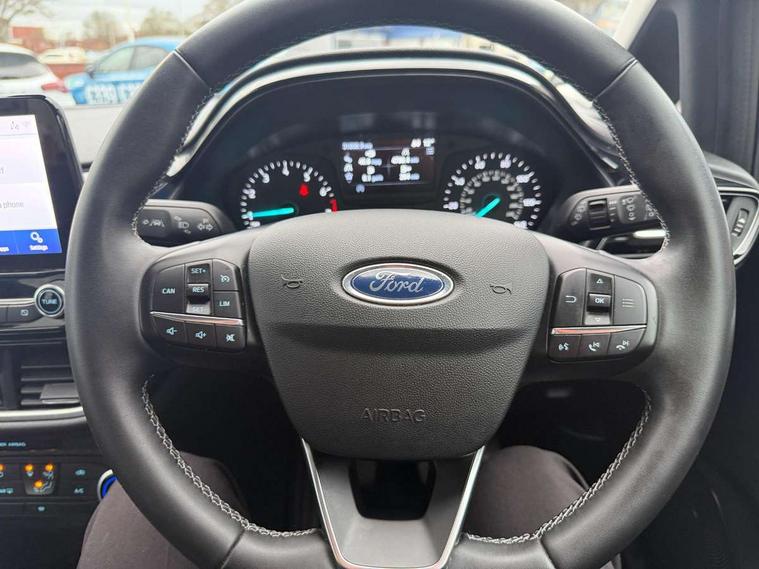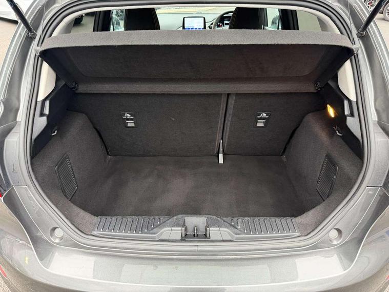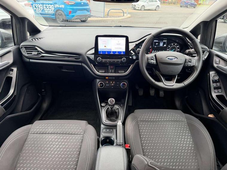 Bluetooth system, Electric power steering, Ford easy fuel, Ford SYNC 3 Navigation system incl 8" touchscreen, 7 speakers, FordPass connect, Apple carplay, android auto, voice control and emergency assistance, Rear parking distance sensors, Selectable drive modes (Normal, Sport, Track), Trip computer, 2 USB ports, Auxiliary input socket, DAB Digital radio, Steering wheel mounted controls, Body colour bumpers, Body colour door handles, Body colour rear spoiler, Body coloured electrically operated and heated door mirrors with side indicators, Chrome beltline trim, Chrome front grille, Chrome lower window surround, Cornering front fog lights, Electric front windows/one touch facility, Electric rear windows, Quickclear heated windscreen, Rain sensing wipers and auto dimming rear view mirror, Rear privacy glass, Rear wiper, 3 spoke leather trimmed steering wheel with audio control, 60/40 split folding rear seat, Adjustable head restraints, Boot carpet, Centre console with opening armrest, 2x cupholders, 12v and USB, Chrome inner door handles, Cloth upholstery, Footwell illumination, Front floor mats in velour, Front map reading lights, Front seat and rear pockets, Illuminated glovebox, Leather gaiter, Load area light, Luxury woven headliner, Manual 2 way passenger seat adjust, Manual 4-way driver seat adjust, Manual air conditioning, Overhead console with sunglasses holder, Pollen filter, Rake/reach adjustable steering wheel, Sensico wrapped steering wheel, NCAP Pack - Fiesta, 3 point seatbelts on all rear seats, ABS+EBA, Curtain airbags, Driver and passenger airbags, Drivers knee airbag, Electronic stability control with hill start assist, Front passenger airbag deactivation, Front side airbags, Seatbelt warning, Two tone horn, Tyre pressure monitoring system, Keyless start with 'Ford Power' starter button, MyKey system, Remote central locking & engine immobiliser, Thatcham Cat.1 alarm, 16" 10 spoke alloy wheels,