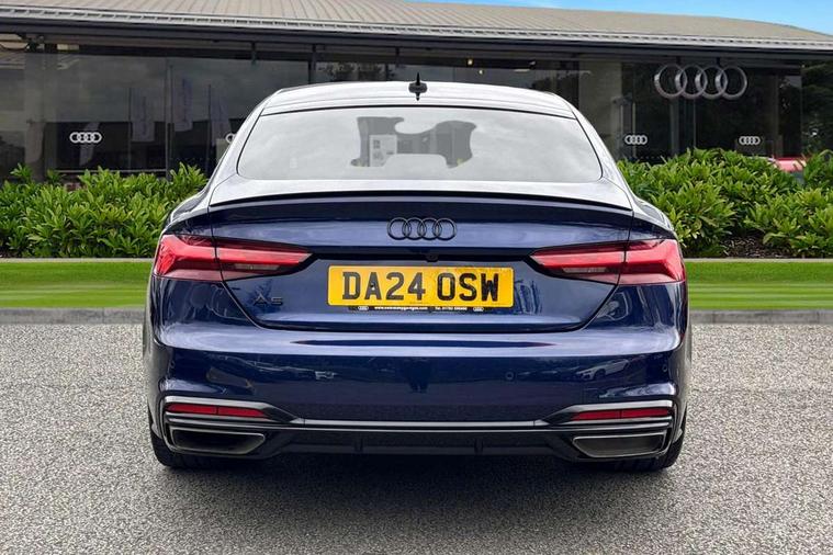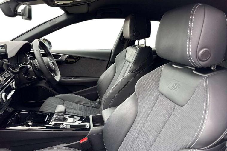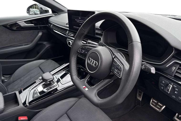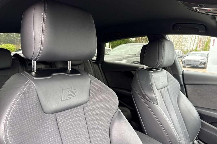 Audi connect safety and service (e-call), Audi drive select (Auto, Comfort, Dynamic, Efficiency and Individual), Audi smartphone interface, Audi virtual cockpit - 12.3" full colour digital instrument cluster, vehicle/engine speed, Radio/media information+Driver assistance systems, Automatic start-stop system with coasting functionality and efficiency programme, Bluetooth interface, Camera based traffic sign recognition, Electro-mechanical power steering, Email, calendar and text messages displayed via MMI, Front and rear parking sensors, Lane departure warning, MMI nav+ with MMI touch - 10.1" high resolution MMI display, touch sensitive, 3D map, route/country info, dynamic route guide, personal route assist, Power operated tailgate, Rear view camera, Service interval indicator, Voice control system, Diesel particulate filter, Sports suspension lowered by 23mm, 8 passive loudspeakers, CD player, DAB digital radio reception, Two additional USB ports for rear passenger in rear centre console, Two SDXC card slots, Audi Beam uses LEDs to project the Audi logo, Auto dimming door mirrors, Auto dimming rear view mirror, Badges on front wing, Black door mirror housings, Body colour door handles, Body colour front spoiler lip, Body colour side sill trim, Electric adjustable heated door mirrors, Electric folding door mirrors, Electric front windows, Exhaust tailpipe trims in dark chrome, Front and rear bumpers with side skirts, Front fog lights, Honeycomb structure radiator grille in grained matt black, Kerb-view function for passenger side, LED headlights and rear lights with LED daytime running lights, LED side indicator lights integrated into door mirrors, LED third brake light, Privacy glass, Rain and light sensors, Rear diffuser in matt anthracite black with trim strip in matt aluminium silver, Rear side wing doors, Rear wiper, S model rear spoiler in black, Side air inlets in grained matt black with matt aluminium silver inlay, Variable front intermittent wipers, Windscreen with acoustic glazing, 3 seat bench in 2nd row, 4 way electric lumbar support for driver and front passenger, 40/20/40 split folding 3 seater rear bench seat, Adjustable steering column, Black cloth headlining, Black perforated leather gearknob, Contrast stitching on seats, steering wheel and gear lever gaiter, Deluxe 3 zone electronic climate control, Front centre armrest, Front head restraints, Front/rear floor mats, Heated front seats, Illuminated door sill trim with S logo, ISOFIX child seat mounting and top tether, Luggage compartment mat, Manual seat adjustment, Rear centre armrest, Rear headrests, Single front passenger seat, Stainless steel pedals and footrest, Sunvisors with vanity mirrors, Black styling pack - A5 Coupe/Sportback, LED interior light pack - A5/RS5, 3x3 point rear seatbelts, 6 airbags - Driver, front passenger, curtain and side airbags, Attention and drowsiness assist, Electromechanical parking brake, Electronic Stabilisation Control (ESC) including ABS, ASR and EDL, Front passenger airbag deactivation, Height adjustable front seatbelts, Hill hold assist, Manual child lock in rear doors, Multi collision brake assist, Pop-up bonnet for pedestrian protection, Pre sense city, Seatbelt monitoring, Tyre pressure warning, Variable restraint system, Warning triangle and first aid kit, Anti theft alarm system, Anti theft wheel bolts, Immobiliser, Keyless Go, Remote central locking, Piano black finish inlay, Tool kit, Tyre repair kit,