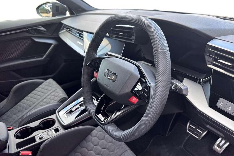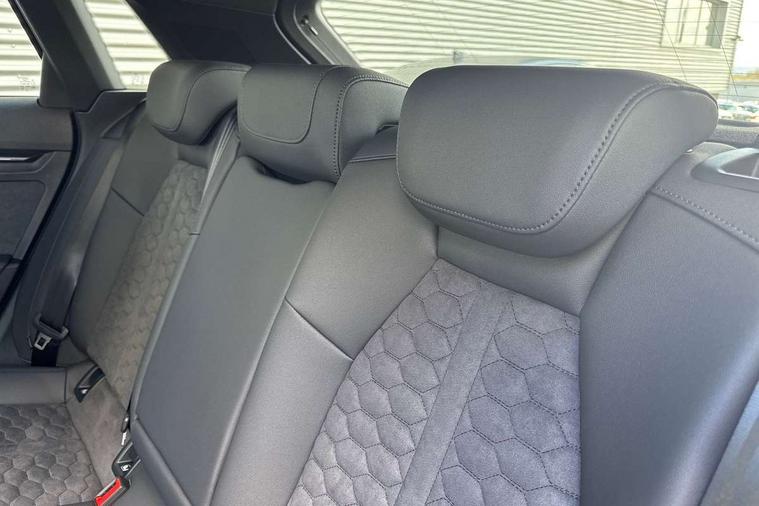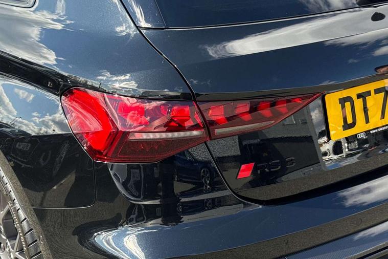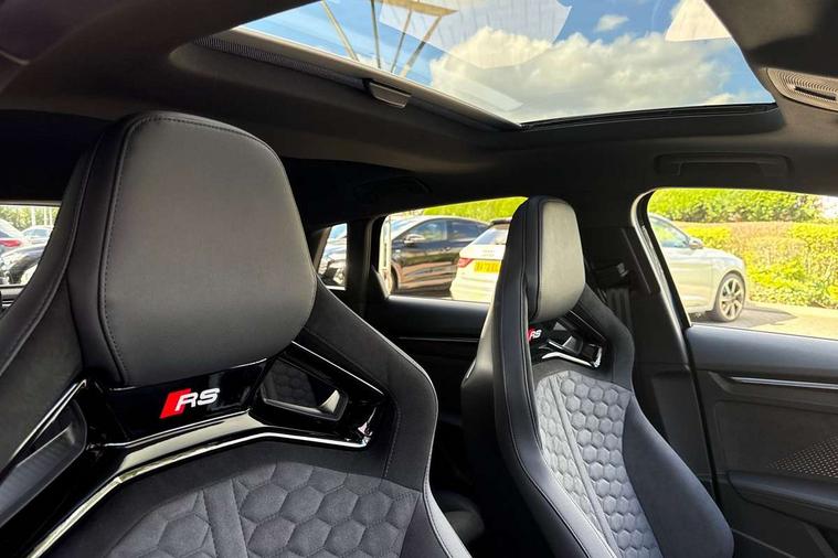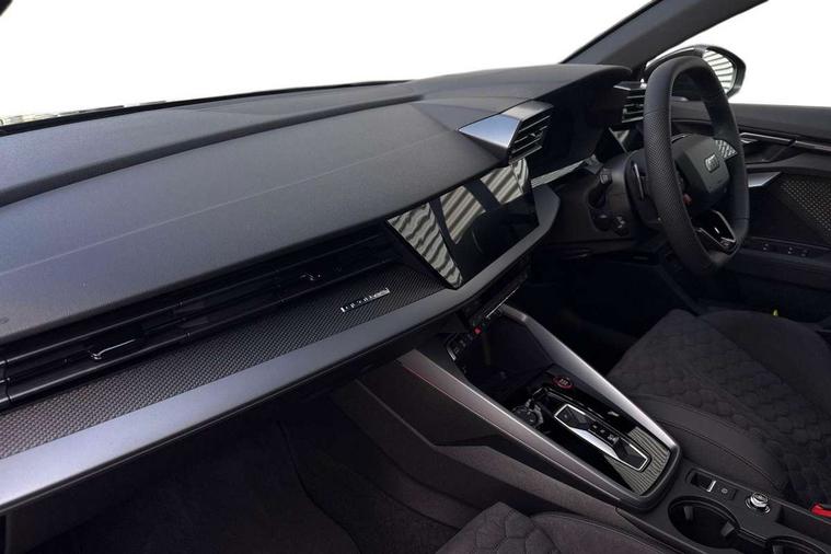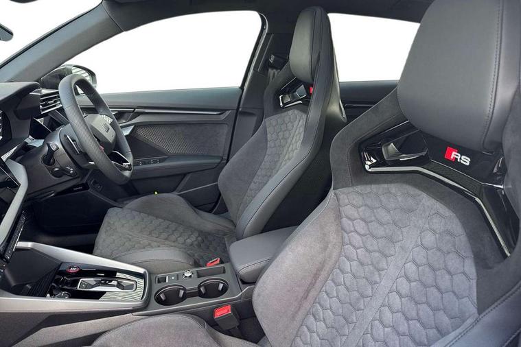 Adjustable speed limiter, Audi drive select comfort, auto, dynamic and efficiency, Audi virtual cockpit plus with RS specific design and 12.3" display with additional graphic display options, Automatic start/stop system with recuperation, Bluetooth interface, Camera based traffic sign recognition, Collision avoidance assistant, Driver attention and fatigue detection, e-Call (emergency call), MMI Navigation Plus with high resolution 10.1" colour touch screen display, Progressive steering, RS specific driving modes - RS Individual, RS Performance and RS Torque rear, Service indicator, Smartphone interface with app store includes wireless Apple carplay, Android auto and Amazon alexa integration, Trip computer, Voice control system with natural language interaction, Adaptive suspension, Increase of top speed to 174 mph, Quattro permanent four wheel drive, Audi Phonebox light with wireless charging, DAB Digital radio, USB ports with charging function in the rear, Audi beam LED projection of RS logo on ground as you exit, Auto dimming frameless rear view mirror, Carbon door mirror housings, Electrically adjustable/heated/folding/auto dimming door mirrors with integrated LED indications + kerb view function for passenger side, Engine compartment cover with carbon trim, Exterior model badging, Front electric windows, Heat insulating glass windscreen, LED 3rd brake light, Light and rain sensors, Privacy glass - dark tinted rear window, rear door and side windows, Rear electric windows, Rear side wing doors, Rear wiper, Roof edge spoiler in carbon, RS sport exhaust system - dual branch with flap control and gloss black oval tailpipe trims, 12V socket and storage compartment in front centre console, 3 seat bench in 2nd row, 3 Spoke flat top and bottomed black leather multi function steering and gear shift paddles, 3-zone deluxe automatic air conditioning, 40/20/40 split folding rear seat bench, Black cloth headlining, Black front and rear floor mats, Front and rear headrests, Front centre armrest, Front door sill trims with RS 3 logo, Heated front seats, Height and reach adjustable steering wheel, Manual boot compartment lid, Rear centre armrest with cupholder, Seat side bolsters, Single front passenger seat, Stainless steel pedals and front footrest in black, Vanadium look - Interior door handles, Door trim, power latching, Air vents, window controls, mirror adjust, rear door lock, Selector lever in centre console, Black Styling plus package - RS3, Extended ambient lighting package Pro with Multi-coloured contour lighting of instrument panel - RS3, RS exterior features pack in carbon and gloss black - RS3, Storage package - RS3 Sportback, 3x3 point rear seat belts, Driver and front passenger airbag with passenger airbag deactivation, Electronic Stabilisation Control (ESC) including ABS, ASR and EDL, First aid kit with warning triangle and 2 safety vests, Hill hold assist, Pre-sense front with pedestrian and cyclist detection, Seatbelt monitoring, Tyre pressure loss indicator, Anti theft alarm, Anti-theft wheel bolts, Electronically operated child locks, Immobiliser, Black dashboard, Inlays in carbon atlas structure, Tyre repair kit,