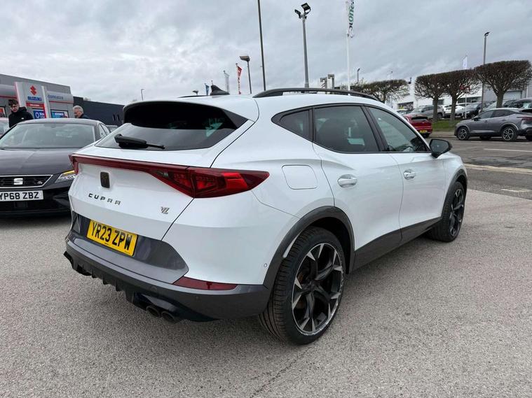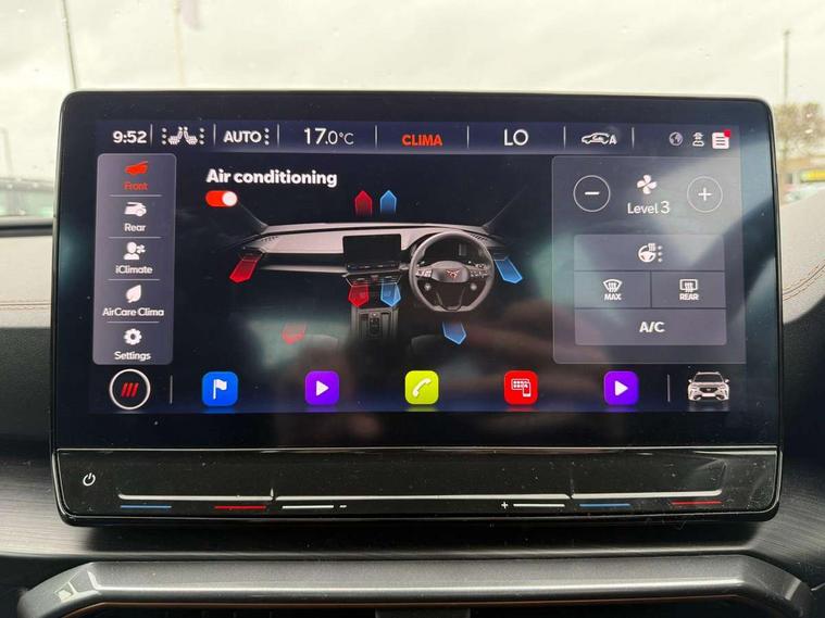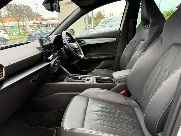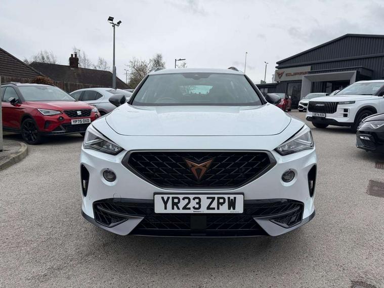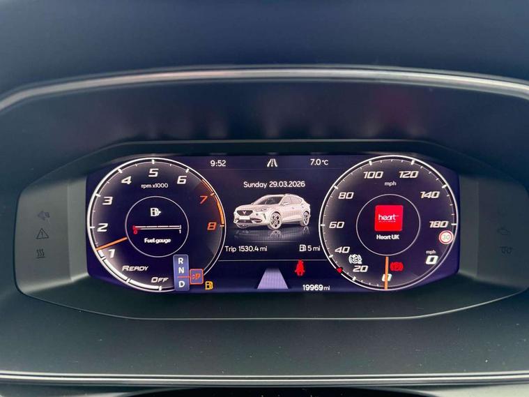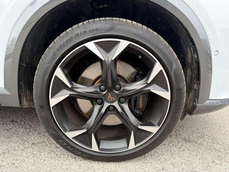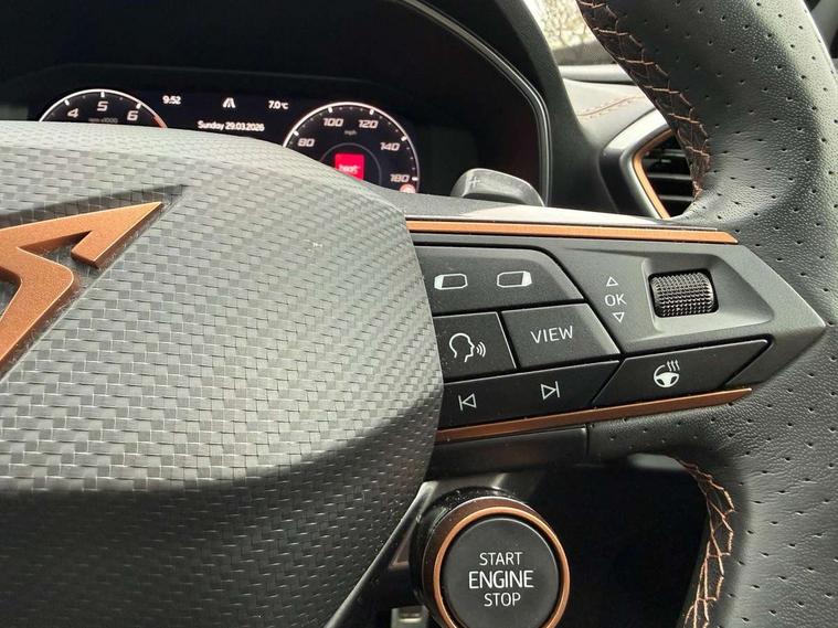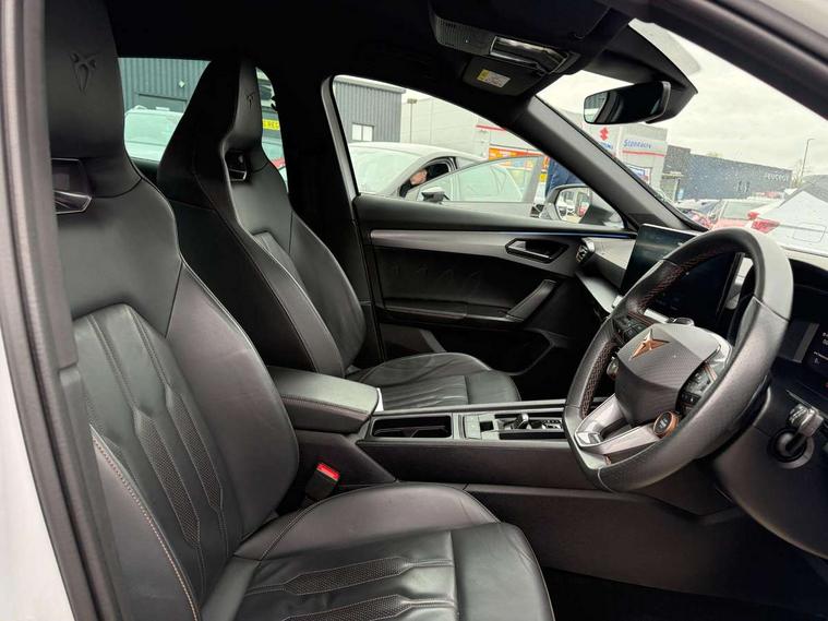 Digital cockpit and configurable dashboard, Driver alert system, Dynamic chassis control with driving profile selection (Comfort, Sport, CUPRA, Individual), Forward collision warning with automatic braking, Lane assist, Navigation system with 12'' Touchscreen Display, Park assist (inc front/rear parking sensors), Predictive adaptive cruise control with speed limiter, RPM, trip computer, outside temp gauge, instrument light brightness, low fuel warning light, lights on reminder, gearshift indicator, Service interval indicator, Speed sensitive power steering, Start/stop system with regenerative braking, Virtual pedal and electric tailgate, Voice control system, Wireless apple carplay, Wireless phone charger, Electronic locking differential and dynamic traction support, Sports suspension with front shock absoption, 2 front and 2 rear USB type C sockets, Auxiliary input socket, DAB radio, Auto dimming rear view mirror, Body colour door handles, Body coloured bumpers, Dark grey wing mirror, Daytime running light with automatic headlight control and coming home feature, Dynamic headlight range control, Electric front/rear windows, Electrically adjustable heated and folding door mirrors with memory function, Front fog lamps with cornering function, Gloss black roof rails and window surrounds, LED Headlights, LED Taillights with dynamic indicator, Rain sensing wipers, Rear diffuser with twin exhaust pipe on each side, Rear side wing doors, Rear wash/wipe, Sports bumpers, Third brake light, Tinted rear windows, VZ logo rear badging, Welcome lights, 12v power supply in centre console, 12V socket, 12v socket in loadspace, 2 front and 2 rear reading lights, 230V socket, 3 seat bench in 2nd row, 60/40 split rear bench seat with armrest and mechanical seat release, Black headlining, Cupra sports pedals, Dust/pollen filter, Front and rear head restraints, Front centre armrest, Height/reach adjust steering wheel, Illuminated interior front door sills, Illuminated sunvisor with mirror, Isofix, Leather heated multi-function sports steering wheel with start stop, CUPRA mode button and gear shift paddles, Luggage tie-down hooks, Single front passenger seat, Three zone climate control with control panel in rear, Variable luggage/load compartment floor, Wraparound lighting, Genuine Nappa leather Pack - Cupra, Safety and driving pack (XL) - Formentor, 3 point seatbelts on all rear seats, ABS, Brake control system - ESC and brake booster, Child proof door locks, Driver and front passenger airbags with front passenger airbag de-activation, Electronic parking brake, Front and rear disc brakes, Front side curtain airbags, Hill hold control, Public e-call, Seat belt reminder for front and rear seats, Tyre pressure monitoring system, Anti theft alarm system, Keyless entry and start system (KESSY), Locking wheel bolts, Copper and aluminium interior detailing, 19" 'Exclusive' machined sport matte black and silver alloy wheels, Space saver spare wheel,