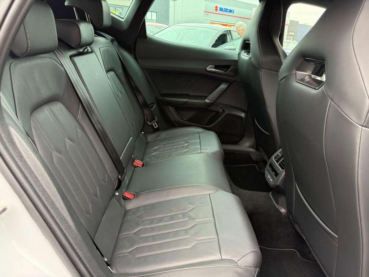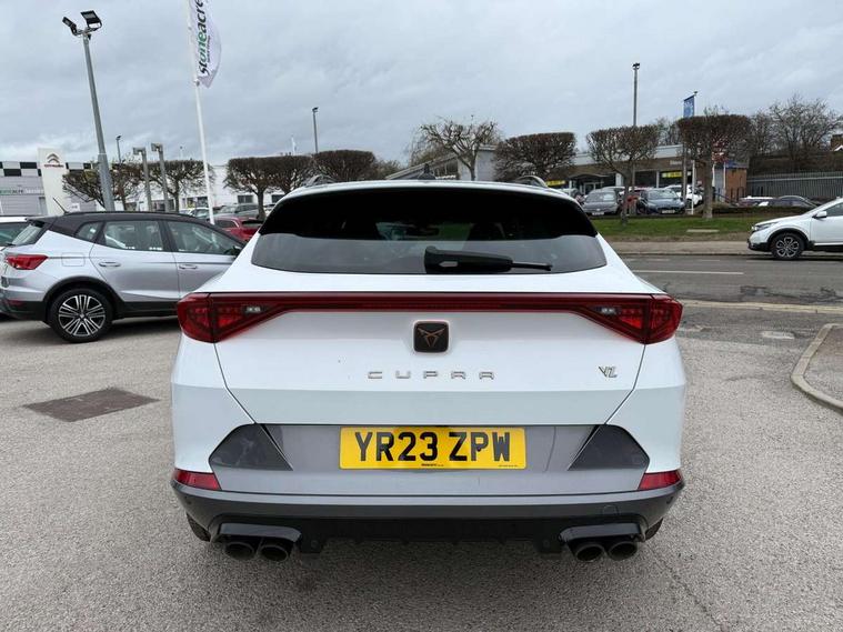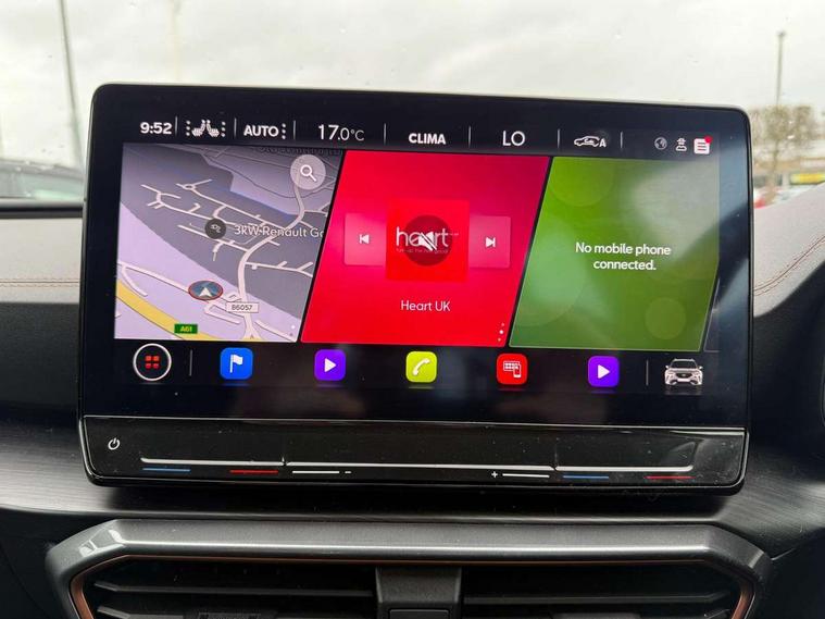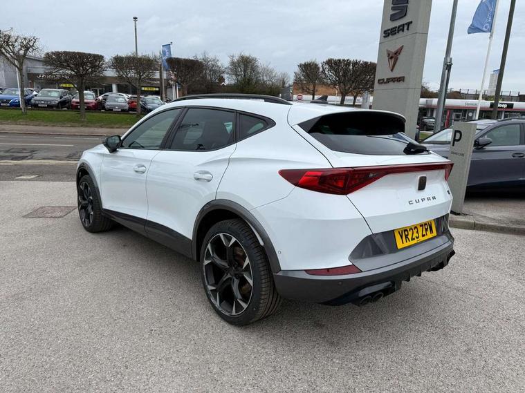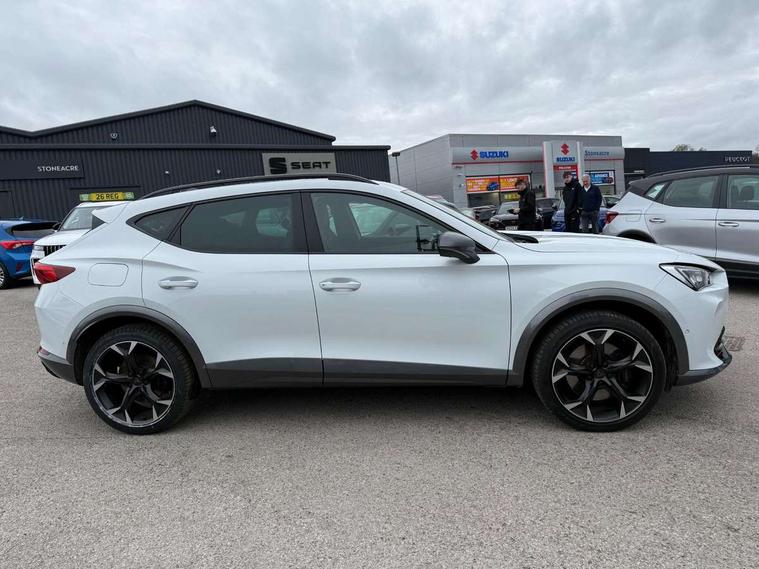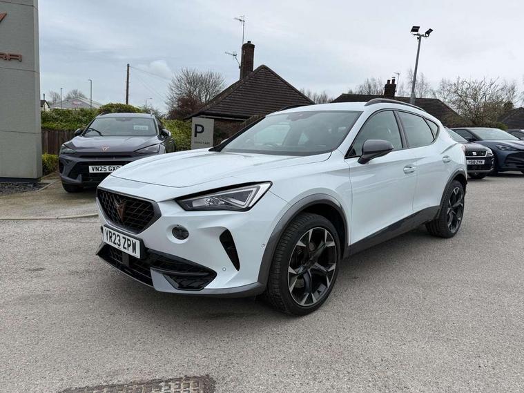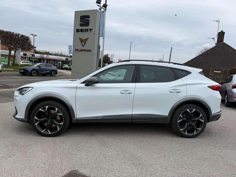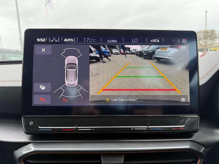 Digital cockpit and configurable dashboard, Driver alert system, Dynamic chassis control with driving profile selection (Comfort, Sport, CUPRA, Individual), Forward collision warning with automatic braking, Lane assist, Navigation system with 12'' Touchscreen Display, Park assist (inc front/rear parking sensors), Predictive adaptive cruise control with speed limiter, RPM, trip computer, outside temp gauge, instrument light brightness, low fuel warning light, lights on reminder, gearshift indicator, Service interval indicator, Speed sensitive power steering, Start/stop system with regenerative braking, Virtual pedal and electric tailgate, Voice control system, Wireless apple carplay, Wireless phone charger, Electronic locking differential and dynamic traction support, Sports suspension with front shock absoption, 2 front and 2 rear USB type C sockets, Auxiliary input socket, DAB radio, Auto dimming rear view mirror, Body colour door handles, Body coloured bumpers, Dark grey wing mirror, Daytime running light with automatic headlight control and coming home feature, Dynamic headlight range control, Electric front/rear windows, Electrically adjustable heated and folding door mirrors with memory function, Front fog lamps with cornering function, Gloss black roof rails and window surrounds, LED Headlights, LED Taillights with dynamic indicator, Rain sensing wipers, Rear diffuser with twin exhaust pipe on each side, Rear side wing doors, Rear wash/wipe, Sports bumpers, Third brake light, Tinted rear windows, VZ logo rear badging, Welcome lights, 12v power supply in centre console, 12V socket, 12v socket in loadspace, 2 front and 2 rear reading lights, 230V socket, 3 seat bench in 2nd row, 60/40 split rear bench seat with armrest and mechanical seat release, Black headlining, Cupra sports pedals, Dust/pollen filter, Front and rear head restraints, Front centre armrest, Height/reach adjust steering wheel, Illuminated interior front door sills, Illuminated sunvisor with mirror, Isofix, Leather heated multi-function sports steering wheel with start stop, CUPRA mode button and gear shift paddles, Luggage tie-down hooks, Single front passenger seat, Three zone climate control with control panel in rear, Variable luggage/load compartment floor, Wraparound lighting, Genuine Nappa leather Pack - Cupra, Safety and driving pack (XL) - Formentor, 3 point seatbelts on all rear seats, ABS, Brake control system - ESC and brake booster, Child proof door locks, Driver and front passenger airbags with front passenger airbag de-activation, Electronic parking brake, Front and rear disc brakes, Front side curtain airbags, Hill hold control, Public e-call, Seat belt reminder for front and rear seats, Tyre pressure monitoring system, Anti theft alarm system, Keyless entry and start system (KESSY), Locking wheel bolts, Copper and aluminium interior detailing, 19" 'Exclusive' machined sport matte black and silver alloy wheels, Space saver spare wheel,