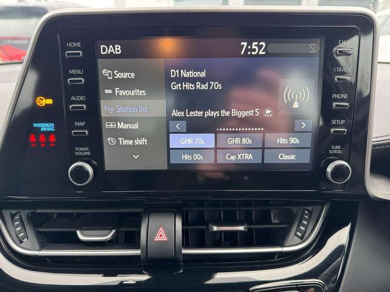 4.2" coloured TFT screen for multi-information display, Adaptive cruise control, Apple car play and Android auto, Bluetooth connectivity, E-call, Electric power steering, Hybrid system indicator, Lane departure alert with steering control, Lane trace assist, Push button start, Push button tailgate release, Remote boot door release in cabin, Remote boot door release in key, Reversing camera, Road sign assist - RSA, Smart voice assist, Trip computer, Voice recognition, Vehicle Stability Control (VSC), 6 speakers, AM/FM radio, DAB Radio (Digital Audio Broadcasting), Toyota touch 2 multimedia system with 8" display, USB connector, Wi-fi connectivity, Anti-jam protection on power windows, Auto high beam, Auto up and down function on all power windows, Automatic headlights, Automatic headlights cut-off, Black and body coloured rear bumper, Black lower front grille, Black upper front grille, Body colour door handles, Body colour door mirrors, Body colour front spoiler lip, Body coloured front bumper, Boot door release with push button, Electric heated door mirrors, Follow me home headlights, Front and rear power windows, Front fog lights, Headlight cut off reminder, Honeycomb lower front grille, LED daytime running lights, LED High mounted stop light, LED rear brake lights, LED rear combination lights, Manual headlight levelling, Manually retractable door mirrors, Noise reduction layer on front windows and windscreen, Power adjustable door mirrors, Rear side wing doors, Rear spoiler, Rear tailgate, Rear window defogger, Rear window wiper, Reflective LED headlights, Shark fin antenna, UV-filter on driver and passenger windows, UV-filter on rear windows, Variable front intermittent wipers, 12v power outlet - front, 3 rear headrests, 3 seat bench in 2nd row, 3 spoke leather steering wheel, 60/40 split folding 2nd row rear seats, Adjustable rear headrests, Adjustable speed limiter switch on steering wheel, Assist grips front and centre pillar, Audio and telephone switches on steering wheel, Black front door assist grips, Boot light, Chrome interior door handles, Cloth upholstery, Driver and front passenger personal light, Driver and front passenger Whiplash Injury Lessening seats, Dual zone automatic air conditioning, Floor mats, Front cupholders, Front head restraints, Front sports seats, Glovebox with internal light, Hard tonneau cover, Hooks for luggage holding net, Humidifying Nanoe air purifier, Illuminated entry system, Isofix attachments on outer rear seats, Leather gearshift, Light on driver sun visor, Light on passenger sun visor, Manual telescopic steering wheel, Manual tilt steering wheel, Manually adjustable lumbar support on driver seat, Manually height adjustable driver seat, Manually height adjustable front passenger seat, Manually reclining driver seat, Manually reclining front passenger seat, Manually sliding driver seat, Manually sliding front passenger seat, Microphone on front personal light, Mirror on driver sun visor, Mirror on passenger sun visor, Multimedia switches on steering wheel, Pollen filter, Shopping bag hooks, Single front passenger seat, Slow opening on lower glovebox, Voice recognition switch on steering wheel, 16 Disk front wheel brake, 3x3 point rear seatbelts, ABS+EBD+Brake assist, Electronic parking brake, Front and rear seatbelt reminder, Front passenger airbag on/off switch, Hill start assist control (HAC), Pre collision system with pedestrian detection, Pre-tensioners and force limiters, Rear door child safety locks, SRS Airbags - Driver + Front passenger, front side, front and rear curtain and driver's knee airbags, Toyota safety sense, Tyre pressure monitoring system, Tyre pressure warning system, Acoustic vehicle alert system (AVAS), Glass-breaking alarm sensors, Immobiliser, Intrusion alarm, Intrusion sensor, Motion sensor alarm, Power door locks, Power passenger window lock, Remote central locking, Black lower dashboard, Black upper dashboard, Grey deco line on upper dashboard, Matte black centre console, Tyre repair kit,