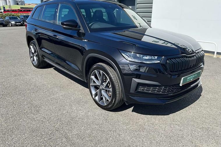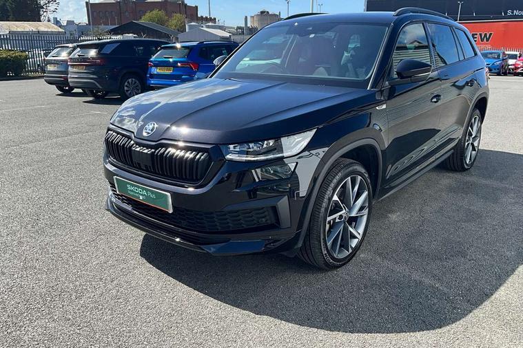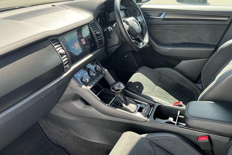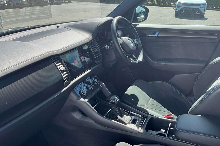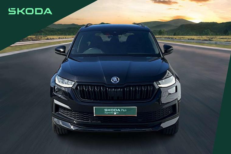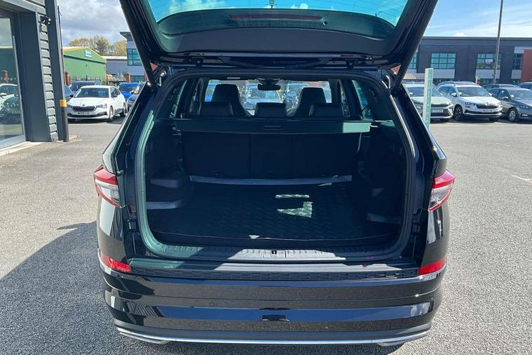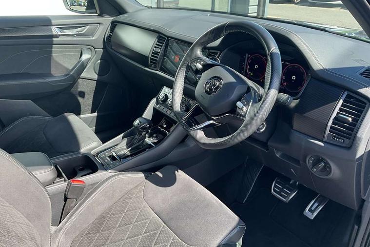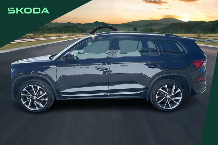 Bluetooth system, Columbus satellite navigation with 9.2" touchscreen, integrated Wi-Fi, web radio, Digital voice enhancement, e call+, ECO Stop/start function, Exterior temperature indicator, Progressive steering, Rear view camera, Smartlink wireless for apple carplay and wired for android auto, Speed limiter, Tailgate unlocking from outside, USB C Port x 2 in front centre console, Virtual Cockpit - 10.25" digital display with additional sports design, Wireless charging, 8 Speakers, DAB Digital radio, Aero front windscreen wipers with intermittent function, Aero rear window wiper, Auto dimming rear view mirror, Black roof rails, Black sports styling including front grille and window surrounds, Black wheel arch surrounds, Body colour bumpers, Body colour door handles, Electric adjustable/heated/folding door mirrors, driver side auto dimming with boarding sports and memory function, Electric front and rear windows, Extended rear spoiler with finlets in gloss black, Front fog lights, Full LED matrix headlights with AFS (adaptive front light system), cornering function and AWL (all weather lighting system), Gloss black door mirrors, Headlight washers, Heated rear window, Invisible tailpipe, LED daytime running lights, LED rear fog light, LED third brake light in rear spoiler, Light assistant (coming/leaving home/tunnel light), Off-road style lower front bumper element, Privacy glass, Rain and light sensors, Rear diffuser, Rear LED lights (high functionality) with welcome effect and dynamic indicators, Rear side wing doors, Safety reflectors on front and rear doors, Sportline badge on front fender, Sports front and rear bumpers including lower rear chrome strip, Tailgate lettering in Black, Window control switches with black trim, Without engine designation, 12V socket in boot, 2 rails with 2 hooks, 2 seat bench in 3rd row, 3 seat bench in 2nd row, 3 spoke leather multifunction sports steering wheel with DSG paddles, 4 foldable roof handles with rear coat hooks, 60:40 foldable rear seat with sliding adjustment and backrest angle adjustment, Aluminium pedals, Black roof headlining, Bottle holders in door panel in the 1.5 litre front and 1 litre rear, Cargo storage compartments, Chrome headlight control button, Chrome interior door handles, Coat hooks on B pillar, Covered storage compartment on driver side, Decorative door sill covers, Front and rear door armrest with black adductor trim, Front centre armrest with storage compartment, cup holder and 12V socket, Front courtesy lights, Gear shift lever with chrome frame and black gloss insert, Grey stitching in front and rear armrests and door armrests + door inserts, Height adjustable front headrests, Illuminated glovebox, Illuminated luggage compartment, Isofix child seat fittings in outer rear seats with top tether, Manually adjustable steering column, Microsuede door panels, Net programme in boot (1x horizontal Net, 2x vertical Nets), Overhead glasses storage compartment, Pollen filter, Rear centre armrest with cupholders, Single front passenger seat, Sliding trunk cover, Small Bags on the inner sides of the front backrests, Sports seats, Sunvisors with illuminated vanity mirrors, Three rear height adjustable headrests, Ticket holder on A Pillar, Umbrella in door panel, Variable boot floor, LED Interior light pack - Kodiaq, Auto door release and activation of warning lights in the event of an accident, Driver and front passenger airbag with knee airbag and front passenger airbag deactivation, Electronic parking brake with hill start assist, Emergency rear braking signal, ESC (incl. ABS+MSR+ASR+EDS+HBA+DSR+RBS+MKB), Front assist with autonomous emergency braking, Front side airbags with curtain airbags, Fuel cut off safety device, Height adjustable front 3 point seatbelts + pretensioners, Hill hold control, Rear disc brakes, Safety vest holder in door, Seat belt reminder for all seats, Three point rear seat belts, Two tone horn, Tyre pressure monitor, Alarm with interior monitoring and tilt sensor with safe function, Anti-theft wheel bolts, Immobiliser, Keyless entry and start system (KESSY), Remote central locking with 2 keys, Black air vent surround, Carbon finish dashboard and door inserts, Grey stitching in dashboard, 20" Vega Anthracite alloy wheels, Temporary spare wheel (space saver),