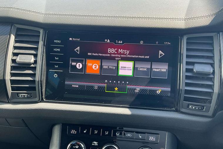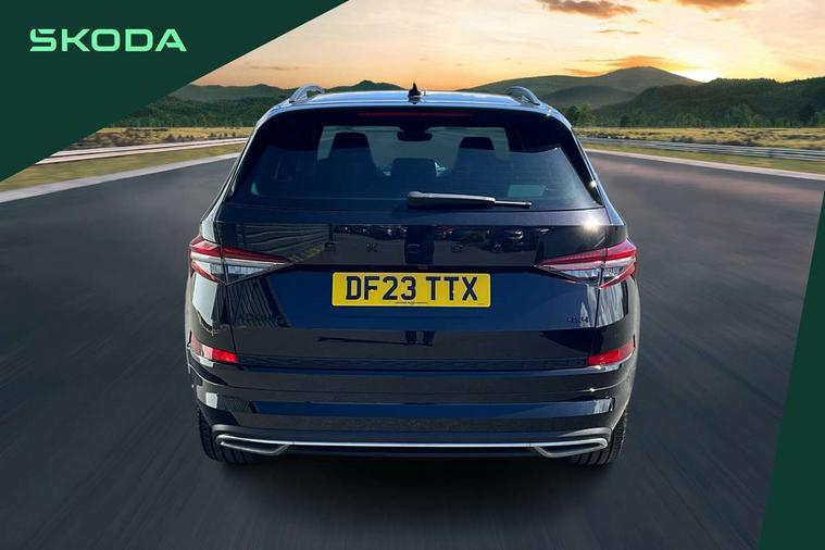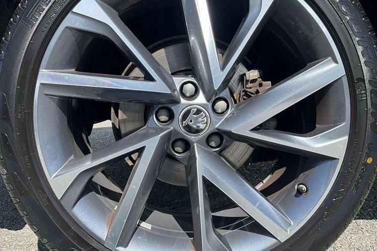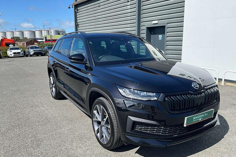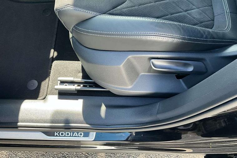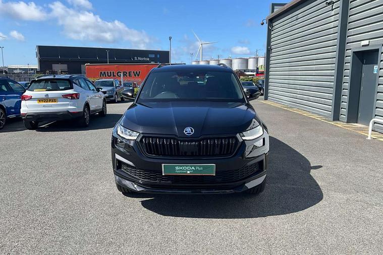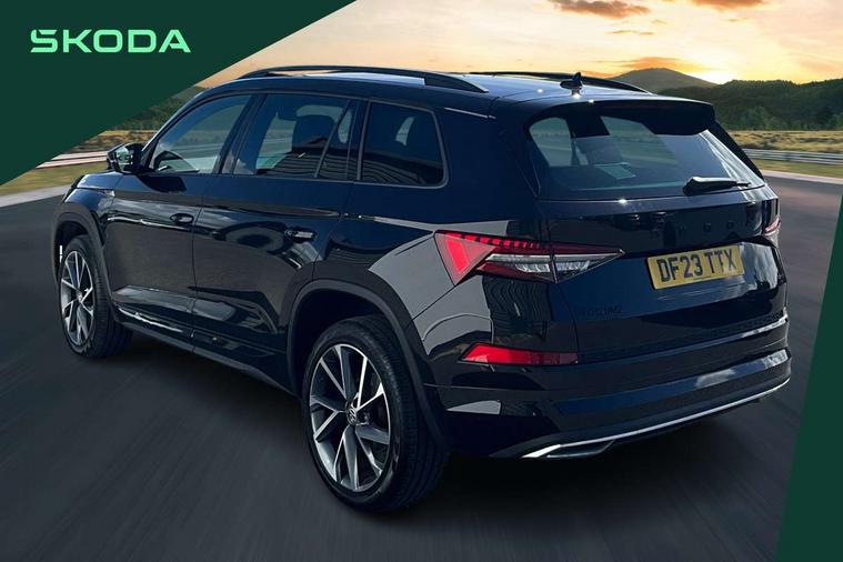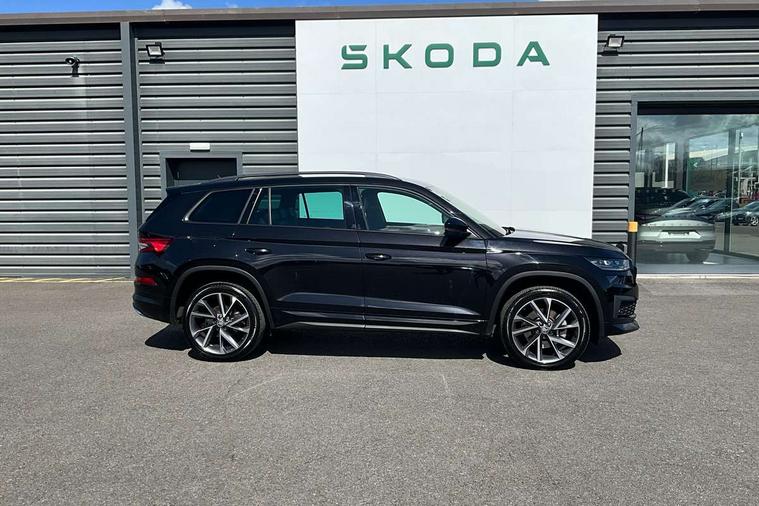 Bluetooth system, Columbus satellite navigation with 9.2" touchscreen, integrated Wi-Fi, web radio, Digital voice enhancement, e call+, ECO Stop/start function, Exterior temperature indicator, Progressive steering, Rear view camera, Smartlink wireless for apple carplay and wired for android auto, Speed limiter, Tailgate unlocking from outside, USB C Port x 2 in front centre console, Virtual Cockpit - 10.25" digital display with additional sports design, Wireless charging, 8 Speakers, DAB Digital radio, Aero front windscreen wipers with intermittent function, Aero rear window wiper, Auto dimming rear view mirror, Black roof rails, Black sports styling including front grille and window surrounds, Black wheel arch surrounds, Body colour bumpers, Body colour door handles, Electric adjustable/heated/folding door mirrors, driver side auto dimming with boarding sports and memory function, Electric front and rear windows, Extended rear spoiler with finlets in gloss black, Front fog lights, Full LED matrix headlights with AFS (adaptive front light system), cornering function and AWL (all weather lighting system), Gloss black door mirrors, Headlight washers, Heated rear window, Invisible tailpipe, LED daytime running lights, LED rear fog light, LED third brake light in rear spoiler, Light assistant (coming/leaving home/tunnel light), Off-road style lower front bumper element, Privacy glass, Rain and light sensors, Rear diffuser, Rear LED lights (high functionality) with welcome effect and dynamic indicators, Rear side wing doors, Safety reflectors on front and rear doors, Sportline badge on front fender, Sports front and rear bumpers including lower rear chrome strip, Tailgate lettering in Black, Window control switches with black trim, Without engine designation, 12V socket in boot, 2 rails with 2 hooks, 2 seat bench in 3rd row, 3 seat bench in 2nd row, 3 spoke leather multifunction sports steering wheel with DSG paddles, 4 foldable roof handles with rear coat hooks, 60:40 foldable rear seat with sliding adjustment and backrest angle adjustment, Aluminium pedals, Black roof headlining, Bottle holders in door panel in the 1.5 litre front and 1 litre rear, Cargo storage compartments, Chrome headlight control button, Chrome interior door handles, Coat hooks on B pillar, Covered storage compartment on driver side, Decorative door sill covers, Front and rear door armrest with black adductor trim, Front centre armrest with storage compartment, cup holder and 12V socket, Front courtesy lights, Gear shift lever with chrome frame and black gloss insert, Grey stitching in front and rear armrests and door armrests + door inserts, Height adjustable front headrests, Illuminated glovebox, Illuminated luggage compartment, Isofix child seat fittings in outer rear seats with top tether, Manually adjustable steering column, Microsuede door panels, Net programme in boot (1x horizontal Net, 2x vertical Nets), Overhead glasses storage compartment, Pollen filter, Rear centre armrest with cupholders, Single front passenger seat, Sliding trunk cover, Small Bags on the inner sides of the front backrests, Sports seats, Sunvisors with illuminated vanity mirrors, Three rear height adjustable headrests, Ticket holder on A Pillar, Umbrella in door panel, Variable boot floor, LED Interior light pack - Kodiaq, Auto door release and activation of warning lights in the event of an accident, Driver and front passenger airbag with knee airbag and front passenger airbag deactivation, Electronic parking brake with hill start assist, Emergency rear braking signal, ESC (incl. ABS+MSR+ASR+EDS+HBA+DSR+RBS+MKB), Front assist with autonomous emergency braking, Front side airbags with curtain airbags, Fuel cut off safety device, Height adjustable front 3 point seatbelts + pretensioners, Hill hold control, Rear disc brakes, Safety vest holder in door, Seat belt reminder for all seats, Three point rear seat belts, Two tone horn, Tyre pressure monitor, Alarm with interior monitoring and tilt sensor with safe function, Anti-theft wheel bolts, Immobiliser, Keyless entry and start system (KESSY), Remote central locking with 2 keys, Black air vent surround, Carbon finish dashboard and door inserts, Grey stitching in dashboard, 20" Vega Anthracite alloy wheels, Temporary spare wheel (space saver),