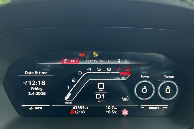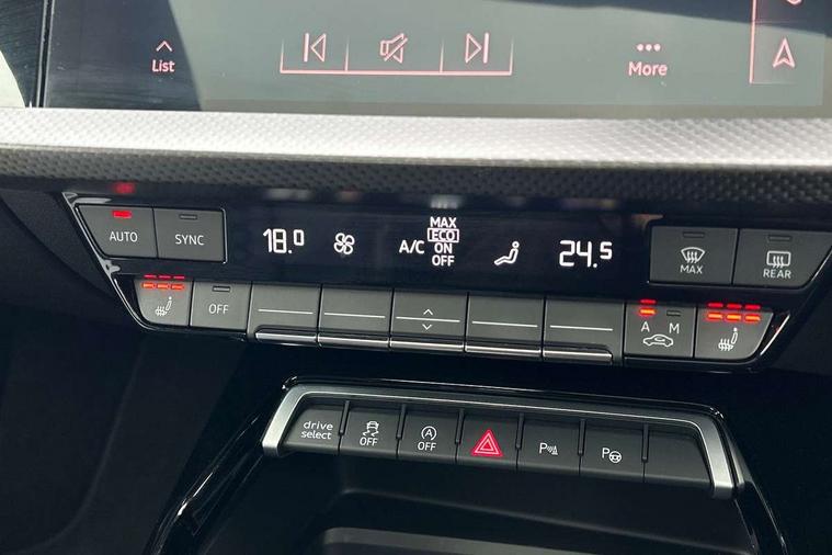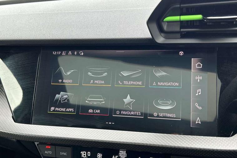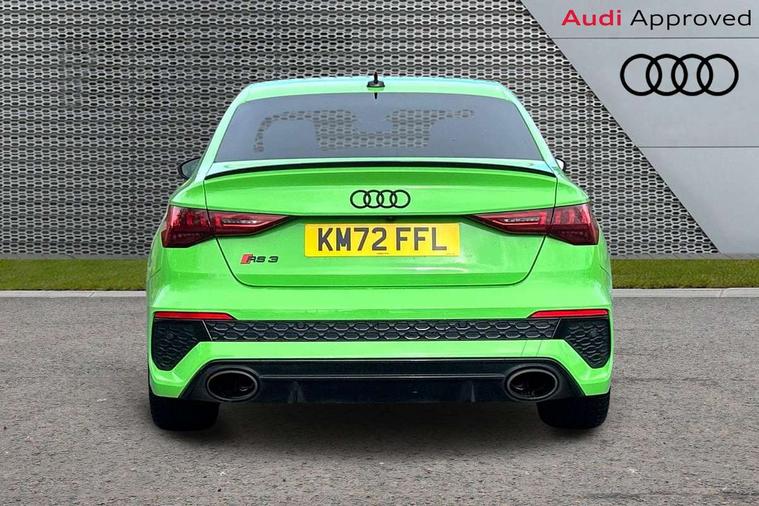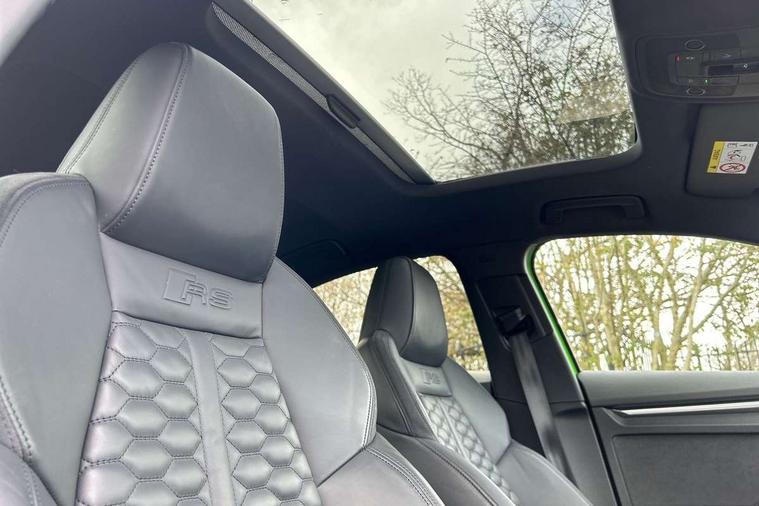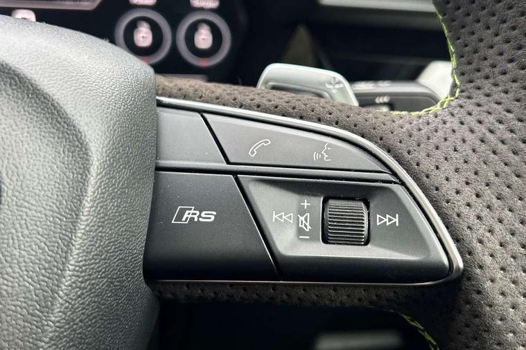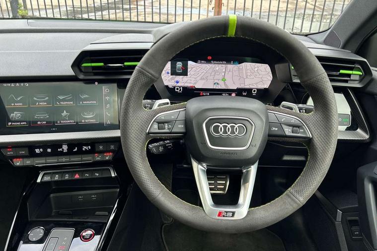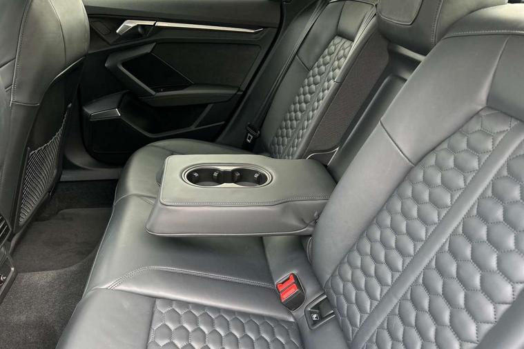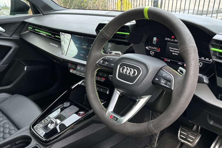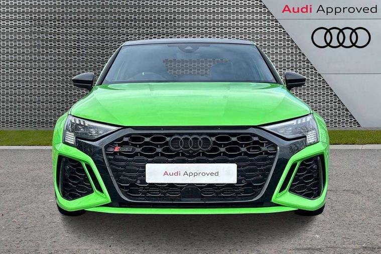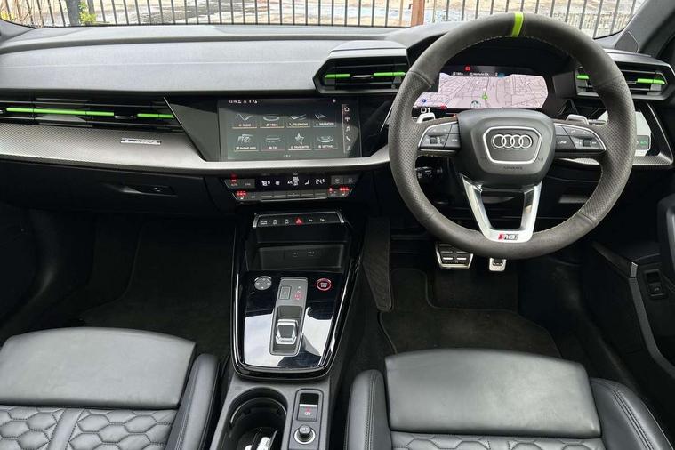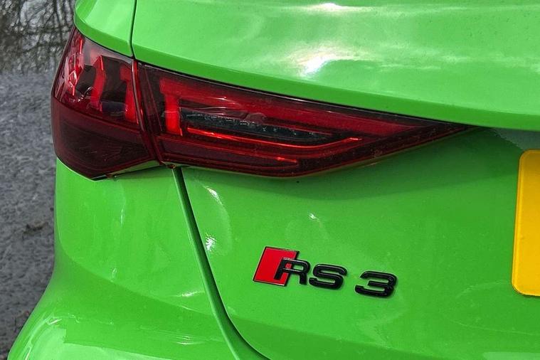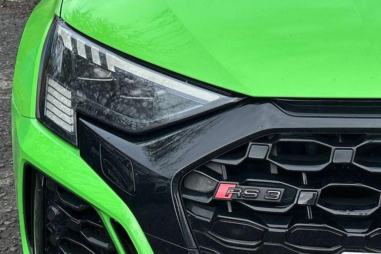 Audi smartphone interface, Audi virtual cockpit with RS specific display 12.3" full colour digital instrument cluster, Automatic start/stop system with recuperation, Bluetooth interface, Collision avoidance assistant, Emergency e-call, Head up Display, Lane departure warning system, Legal emergency call, Parking assist with parking system plus, Power operated tailgate - Luggage compartment lid opens electrically, Progressive power assisted steering, Reversing camera, Quattro permanent four wheel drive, Rear suspension, DAB Digital radio, 3rd brake light, Acoustic glass windscreen, Audi beam uses LEDs to project the Audi sport logo onto the ground as you exit your RS 3, Audi matrix LED headlights, LED rear lights, dynamic front and rear indicators and headlight cleaning system, Auto dimming rear view mirror, Black side skirts, Body colour roof, Carbon fibre engine cover, Electric adj heated/folding + auto dimming exterior mirrors with memory + LED indicator + auto kerb side function for passenger side exterior mirror, Front spoiler in high gloss black, Heat insulating glass windscreen, LED daytime running lights, Light and rain sensors, Panoramic glass sunroof, Privacy glass - dark tinted rear and rear side windows from B-pillar backwards, Rear boot, Rear side wing doors, RS exterior features in gloss black, RS sports exhaust system, 3 seat bench in 2nd row, 3 spoke leather multifunction steering wheel with gear shift paddles, 4 way lumbar support for front seats, 40/20/40 split folding rear seat bench, Black cloth headlining, Dual zone electronic climate control, Electrically adjustable front seats with memory function for driver's side, Front and rear headrests, Front centre armrest, Front sports seats RS embossed logo, Front/rear floor mats, Heated front seats, Honeycomb stitching and RS embossing, Illuminated door sill trims inlays in aluminium with RS 3 logo, RS emblems, Single front passenger seat, Stainless steel pedals and front footrest in black, Aluminium interior elements pack - RS3, Ambient lighting pack - RS3, Comfort and sound pack - RS3, Driver assistance pack with 3 spoke leather multi function steering wheel - RS3, MMI navigation plus with MMI touch - RS3, RS bodystyling - RS3, Storage Pack - RS3, 3x3 point rear seat belts, ABS/EBD, ASR, Audi pre sense front, Driver/Front Passenger airbags, EDL, ESC - Electronic Stability Control + traction control, Front passenger airbag deactivation, Front side airbags with head airbags and interaction airbag, Hill hold assist, Seat belt reminder with passenger presence detection in rear, Tyre pressure loss indicator, Warning triangle and first aid kit, Anti theft alarm, Anti-theft wheel bolts, Electronically operated child lock, Remote control central locking, Full decorative carbon trim, 19" 5 Y spoke black with graphic print alloy wheels, Tool kit, Tyre repair kit,