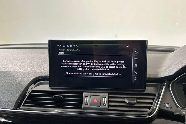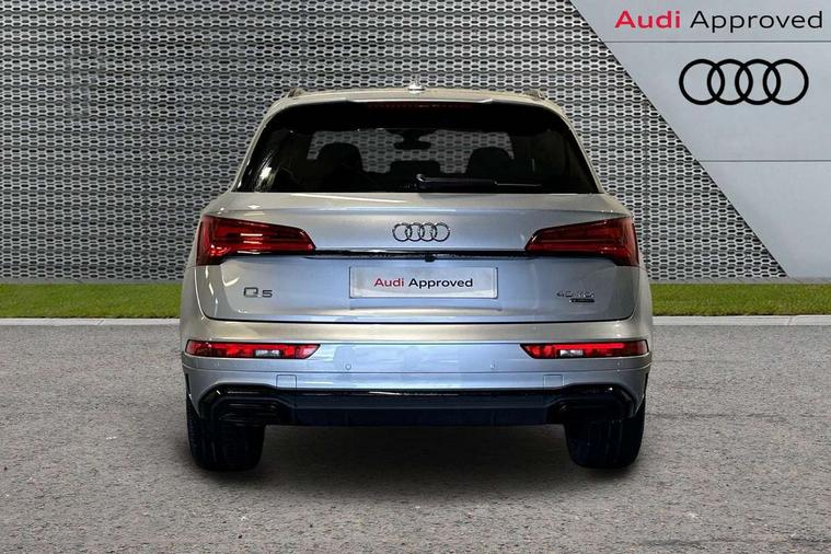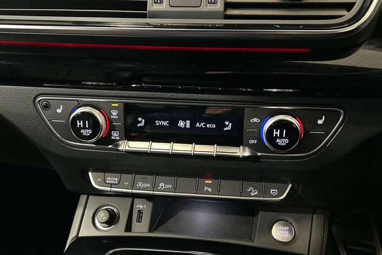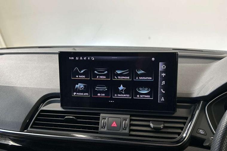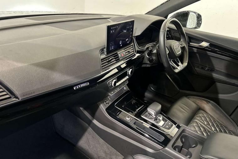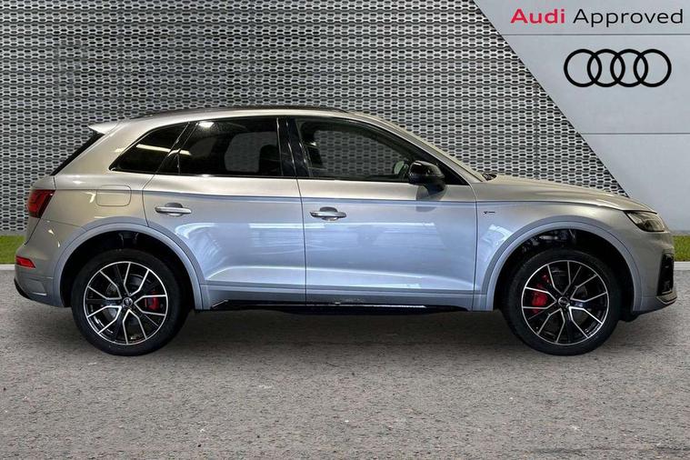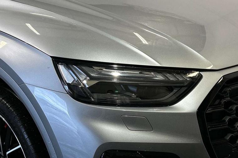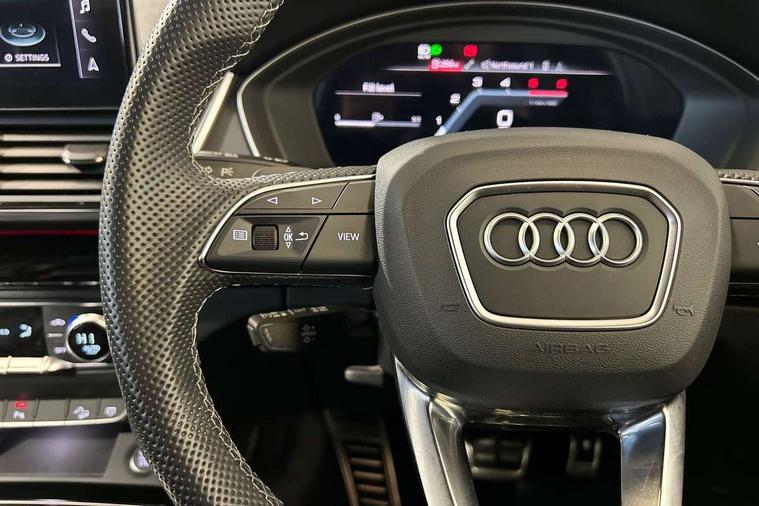 Audi connect safety and service (e-call), Audi connect with Amazon Alexa Integration, Audi drive select, Audi virtual cockpit plus with 12.3" screen and three different layout designs, Audi wireless smartphone interface, Automatic start-stop system with coasting functionality and efficiency programme, Bluetooth interface, Electro - mechanical power assisted steering, MMI navigation plus with 10.1" touch screen, Power tailgate, Reversing camera, Service interval indicator, Voice control system with Audi hotword activation "Hey Audi", Diesel particulate filter, Quattro on demand, S line sports suspension, 2 x USB charging port with aux input socket, DAB Digital radio, Acoustic windscreen, Audi matrix LED headlights with dynamic front and rear indicators, Audi rings at front and rear in black, Audi rings decal on rear doors, Auto dimming door mirrors, Auto dimming rear view mirror, Automatic headlights and windscreen wipers, Black door mirrors, Black roof rails, Body colour bumpers, Body colour underbody protection, Chrome plated exhaust trims, Daytime running lights, Door sills in Selenite silver, Electric adjustable/heated/folding door mirrors, Front air inlet surrounds in titanium black, Front and rear electric windows, Headlight washers, High gloss black B pillar trims and triangular rear door trim, High level LED brake light, Rear chrome trim strip below lights, Rear privacy glass and rear side windows, Rear side wing doors, Rear wiper, Roof bars, S Line rear spoiler, 3 rear headrests, 4 way electric lumbar support for driver and front passenger, 40:20:40 split folding 3 rear bench seat in 2nd row with rear centre armrest, Black cloth headlining, Comfort front centre armrest, Contrast stitching on seats, steering wheel and gear lever gaiter, Deluxe 3 zone electronic climate control, Electrically adjustable front seats, Fine Nappa leather upholstery with diamond pattern contrast stitching + front sport seats with S embossed logo, Front/rear floor mats, Gear lever in black leather, Heated front seats, Height adjustable front head restraints, Height/reach adjustable steering column, Illuminated door sill trims with S logo, ISOFIX child seat mounting and top tether, Rear seat bench plus, Removable luggage compartment floor, Single front passenger seat, Stainless steel pedals, Sunvisors with vanity mirrors, Black styling package - Q5 Edition 1, Extended interior upholstery pack - Q5, Extended LED Interior multi coloured Lighting Pack - Q5, 3 point seatbelts on all seats, 6 airbags - Driver, front passenger, curtain and side airbags, Electrically operated child locks on rear doors, Electromechanical parking brake, Electronic stabilisation control including ABS, ASR and EDL, Front and rear brake calipers painted in red, Front passenger airbag deactivation, Hill descent control, Hill hold assist, Multi collision brake assist, Pop-up bonnet for pedestrian protection, Pre sense city, Seat belt force limiter, Seatbelt monitoring, Tyre pressure warning, Warning triangle and first aid kit, Anti theft alarm, Anti-theft wheel bolts, Keyless Go access/ignition system, Remote central locking, Piano black finish inlay,