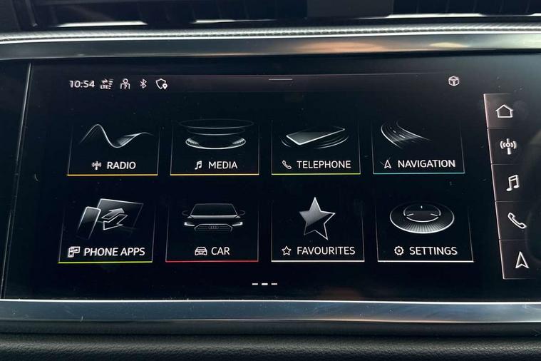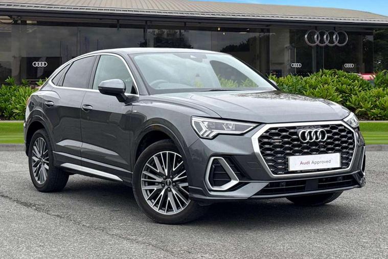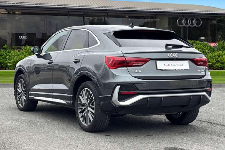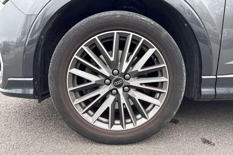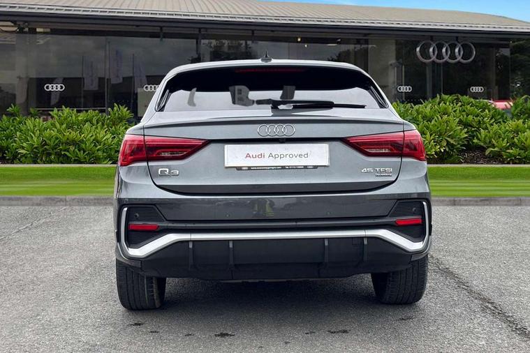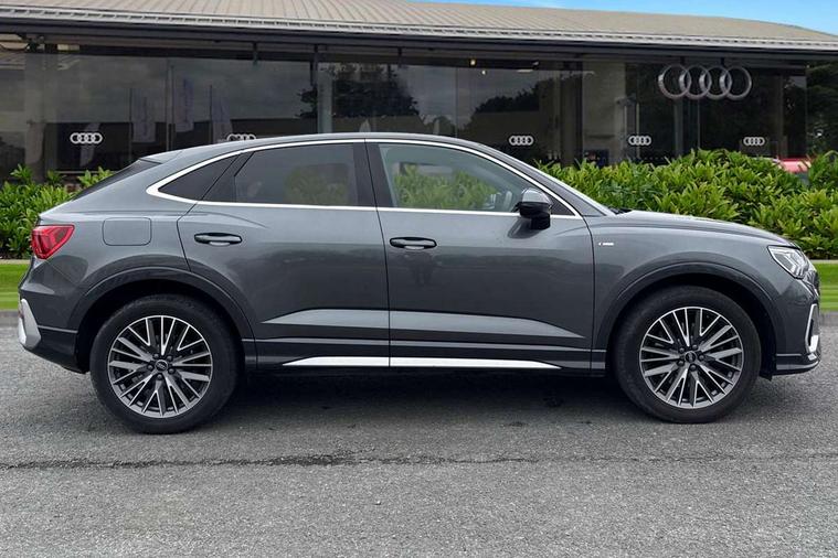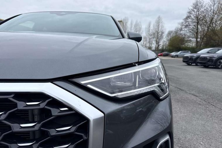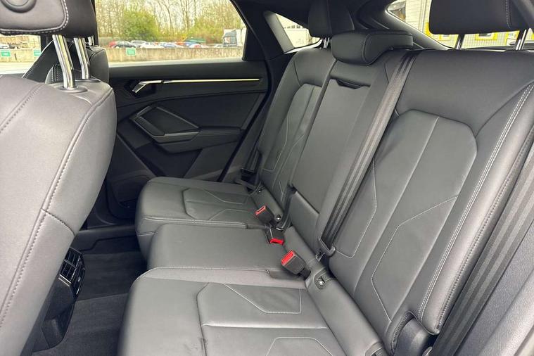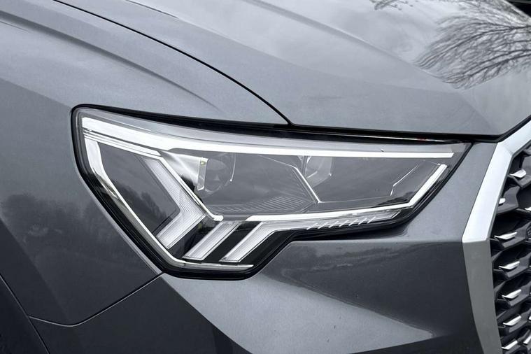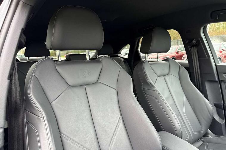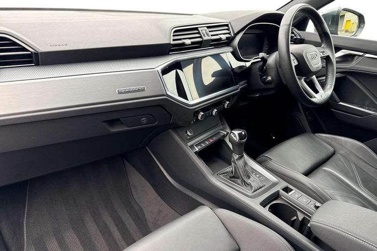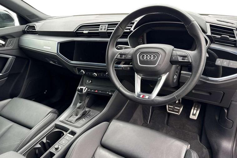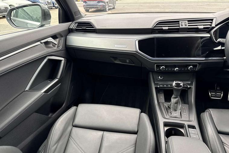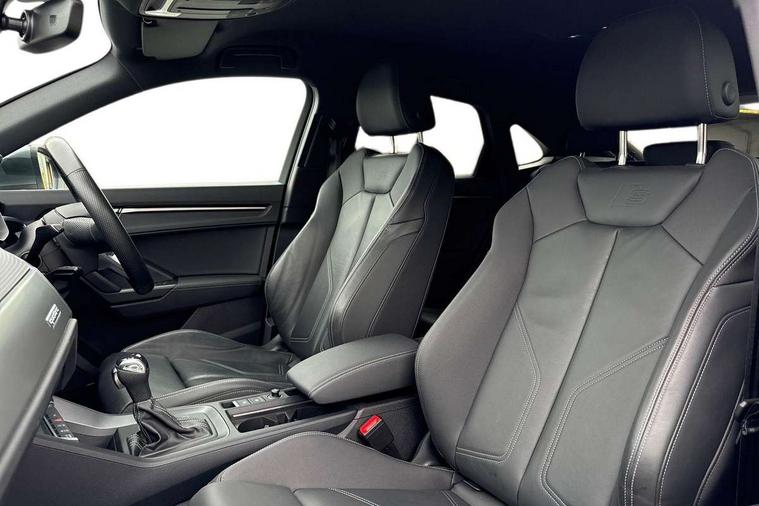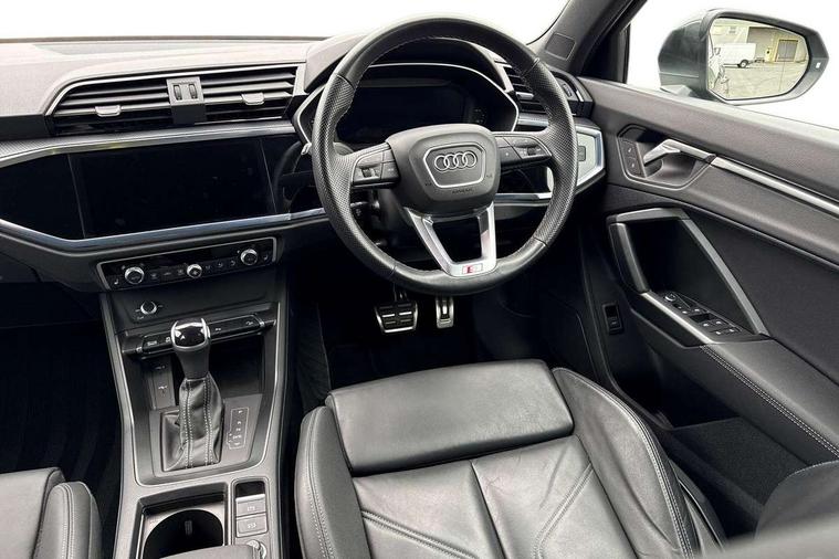 Audi drive select, Audi lane departure warning, Audi Virtual Cockpit - 10.25" display, Bluetooth interface, Camera based traffic sign recognition, Legal emergency call, MMI Navigation Plus with high resolution 10.1 inch touchscreen colour display, Power operated tailgate, Progressive steering, Service interval indicator, Smartphone interface includes wireless Apple carplay/Android Auto, Start stop system with recuperation, Voice control system with natural language interaction, Sports suspension, 2 USB-C ports with charge and data functions, 6 passive loudspeakers, DAB digital radio module, Acoustic windscreen, Aluminium window trim, Auto dimming frameless rear view mirror, Diffuser grille in grained matt black, Diffuser trim in selenite silver, Electrically folding, adjustable and heated door mirrors with integrated LED side indicators and kerb view function for passenger side, Front and rear electric windows, Front fog lights, Front side air inlets in selenite silver, Front underbody protection in manhattan grey paint finish, Grille surround in aluminium silver matt, High gloss black finish B and C pillars, LED Dynamic rear indicators, LED headlights with LED daytime running lights, LED rear lights, LED third brake light, Privacy glass dark tinted rear and rear-side windows (from B-pillar backwards), Radiator grille in anthracite black with inlay in matt aluminium silver, Rain and light sensors, Rear side wing doors, Rear underbody protection in matt black, Rear wiper, S line badges on front wings, S line front and rear bumpers and side skirts in contrasting Manhattan grey paint finish, Side skirt insert in matt Platinium grey, Variable front intermittent wipers, 12V socket in rear centre console, 3 seat bench in 2nd row, 3 spoke leather multifunction steering wheel features S badging and grips in perforated leather with contrast stitching, 40:20:40 folding with manual adjustment for 60:40 forwards/backwards position and backrest angle, Adjustable rear seat bench/backrest with centre armrest and cupholder, Black cloth headlining, Dual zone electronic climate control, Front and rear black floor mats with contrast stitching, Front and rear headrests, Front and rear roof module including reading lights, Front centre armrest, Glove compartment lighting, Height and reach adjustable steering wheel, Illuminated door sill trims with S logo, ISOFIX child seat mounting for front passenger with airbag deactivation and outer rear seat including top tether attachment point for outer rear seats, Luggage compartment light right in white, Luggage compartment sill protection in stainless steel, Manual front seats with height adjustment, Perforated leather gearknob, Single front passenger seat, Stainless steel pedals, Ambient lighting pack - Q3, Non smoking pack - Q3, 3x3 point rear seatbelts, 6 airbags - Driver, front passenger, curtain and side windows, Audi pre-sense front with pedestrain and cyclist recognition, Electrically operated child locks on rear doors, Electromechanical parking brake, Electronic stabilisation control including ABS, ASR and EDL, Front seatbelt reminder, Hill descent control, Hill hold assist, Pre sense basic, Seatbelt monitoring, Tyre pressure warning, Warning triangle and first aid kit, Anti theft alarm, Anti theft wheel bolts, Immobiliser, Remote central locking, Aluminium look interior elements, Black dashboard, Dark matt brushed aluminium inlay, Detail dashboard around MMI touch colour display in glass look, black with surround in aluminium look, Leatherette door armrest,