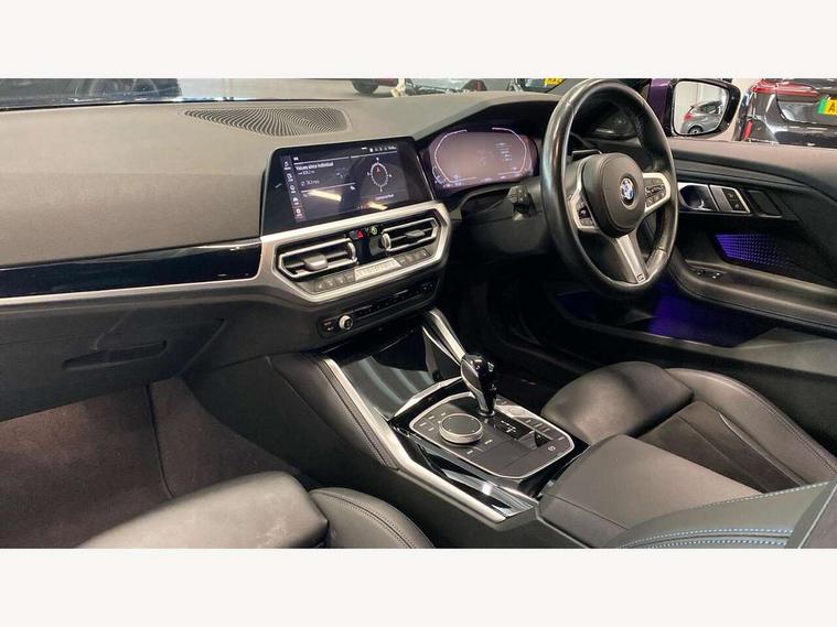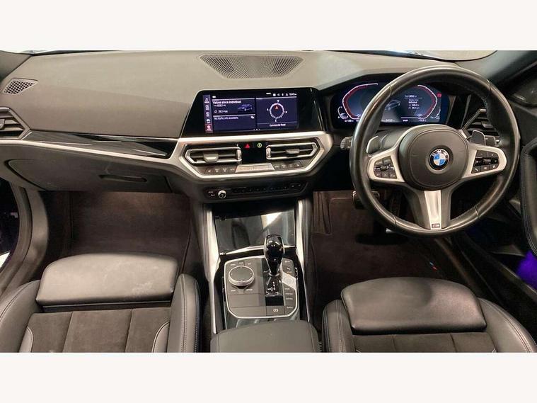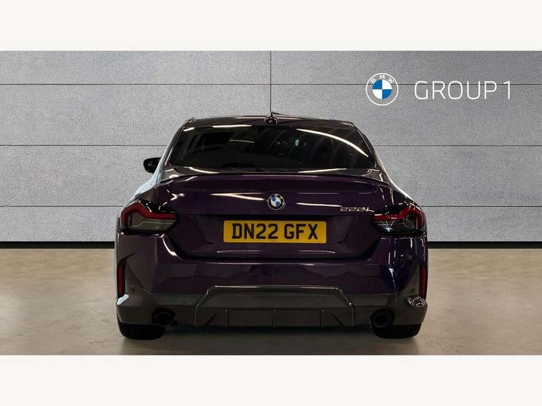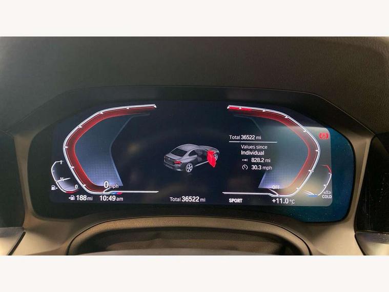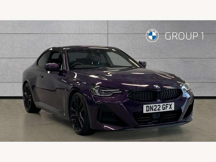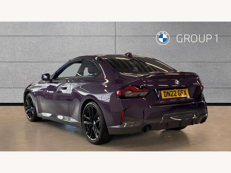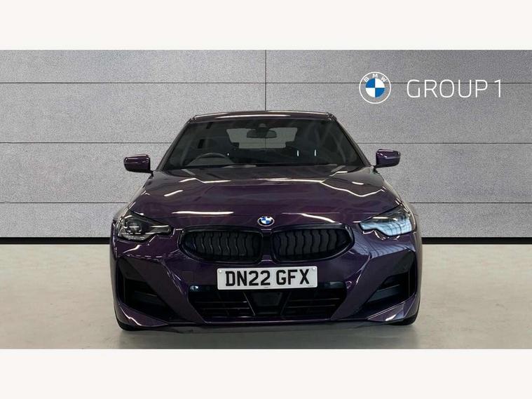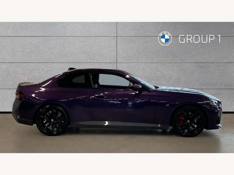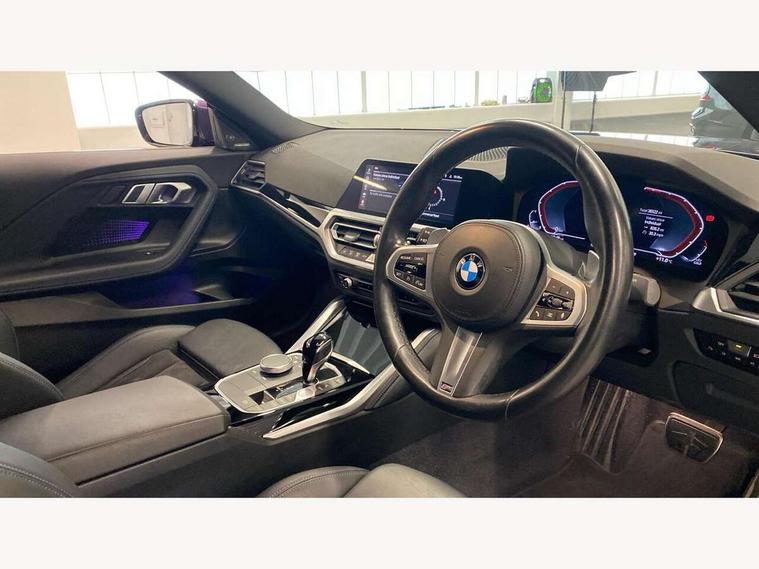 Attentiveness assist, Auto start-stop, Bluetooth, BMW ConnectedDrive online services, BMW Teleservices, Check Control warning system for monitoring of lights and door/luggage compartment open warning, Direct selection buttons, Drive off assistant, Eco pro mode, Electric power steering, Front/rear Parking distance control, iDrive controller with turn and press function, Integrated owners handbook, Intelligent functions, Live cockpit plus with nav function 12.3" instrument cluster and 14.9" centre display, Oil sensor for level and grade, Optimum shift indicator, Personal Profile, Touch operation on control display, Variable sport steering, Widescreen multi-media display, Aluminium lightweight construction, Balancer shaft, BMW TwinPower Turbo four-cylinder petrol engine, Double VANOS, Drive performance control with ECO PRO comfort + sport mode, Electronic differential lock, High precision injection, M sport suspension, Petrol Particulate Filter, Sport automatic steptronic transmission with gearshift paddles, manual gearshift time display, launch control, coasting idle ECO PRO/COMFORT modes, Twin scroll turbocharger with Valvetronic, DAB tuner, Acoustic windscreen wipers for reduced driving noise, Adaptive LED Headlights, Automatic windscreen wipers and automatic headlight, Automatically dimming rear view mirror, Body colour door handles flush with door surface, Body colour door mirrors, Body colour front and rear bumpers, Daytime running lights, Electric windows - front and rear, with open/close fingertip control and trap release, Exhaust tailpipes x2 - 90mm in left and right, Fading support, Front and rear bumper system with replaceable deformation elements, Front door sill finishers in black plastic with BMW designation, Front windscreen wipers with integrated washer jets, Green tinted heat protection glazing, High beam assistant, High gloss shadowline exterior trim in mirror triangle cover, mirror cover panel, mirror bezel and window border, High level third brake light, Indicators integrated int mirror housing, LED registration plate light, LED technology rear tail lights, brake lights and turn indicators, Lightweight engineering, Model designation on right side of tailgate, One piece kidney grille with hight gloss chrome surround, Rear boot, Rear fog lights, Reversing light in rear light cluster, Shark fin antenna, Single part LED rear lights with smoked glass components, Trailer stabilisation logic, Visible VIN plate, 12V power socket in front centre console with blanking plug, 2 cupholders in front centre console, 3 zone automatic air conditioning, Ambient lighting, Compartment in front of cupholder, Conditioned based service, Driver seat backrest width adjustment, Front and rear side armrests integrated into door trim, Front armrest, Front door pockets, Front head restraints, Front sport seats, Heated front seats, Illuminated glove compartment with separate small compartment, M headliner Anthracite, M sport leather steering wheel, Manually adjustment steering wheel column, Rear seat backrest with manual 40:20:40 split folding, Rear seat centre foldable armrest with integrated cup holder, Single front passenger seat, Storage compartment between rear seats, Storage tray and compartment with cover in centre console, Sun visors with vanity mirrors and insert tab, Through loading system with 40/20/40 split folding 2 rear seat in 2nd row, Two folding rear seat headrests, Velour floor mats, Additional storage compartment pack without USB - 2 Series Coupe, Connected pack professional - 2 Series Coupe, Interior and exterior mirror pack - 2 Series Coupe, M Sport exterior styling aerodynamics pack - 2 Series Coupe, 2 tone horn, Anti lock braking system (ABS) with cornering brake control, Automatic Stability Control (ASC), BMW emergency call, Brake drying, Child seat ISOFIX attachment for the two outer rear seats, Crash sensor activating of airbags, Unlocking doors, hazard warning lights, interior light, safety battery terminal, Deactivation of fuel pump in the event of a crash, Driver and front passenger airbags, Driver and front passenger side airbags, integrated in the door side seat backrest bolsters for all seat variants, Dynamic brake control, Dynamic stability control + (DSC+), Dynamic Traction Control - DTC, Electrically operated hand brake including automatic hold function and automatic release when driving off, Front and rear disc brakes, Front passenger airbag deactivation, Head airbags for all 4 outer seats, Manual deactivation of front passenger airbag, Seat belt security check for driver and front passenger, Seatbelt warning, Side impact protection, Three point seat belts on 4 seats including front belt stopper, pyrotechnic belt tensioners and belt force limiters, Tyre pressure sensor, Warning triangle and first aid kit, Alarm system (Thatcham 1) with remote control and electronic engine immobiliser, Central locking switch for all doors, fuel filler cap and luggage compartment, Deadlocking function system to all doors, Drive away locking system on all doors and luggage compartment, Locking wheel bolts, Start/Stop button (illuminated) in centre console with keyless engine start and Auto Start-Stop deactivation button, Two remote control key with integrated key - one button for open and close doors/fuel flap/tailgate and separate button for unlock luggage compartment, BMW mobility tyre sealing system, Electrically powered 12V compressor, Reduced rolling resistance tyres,