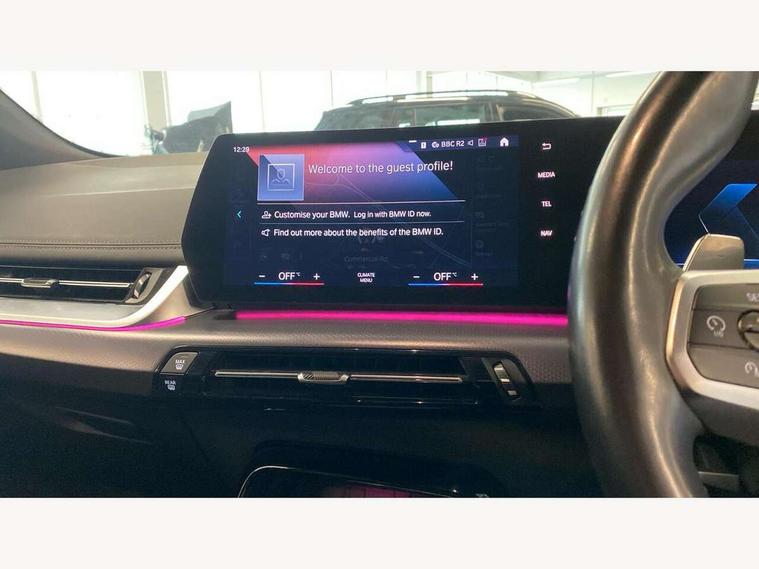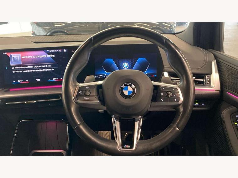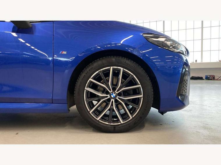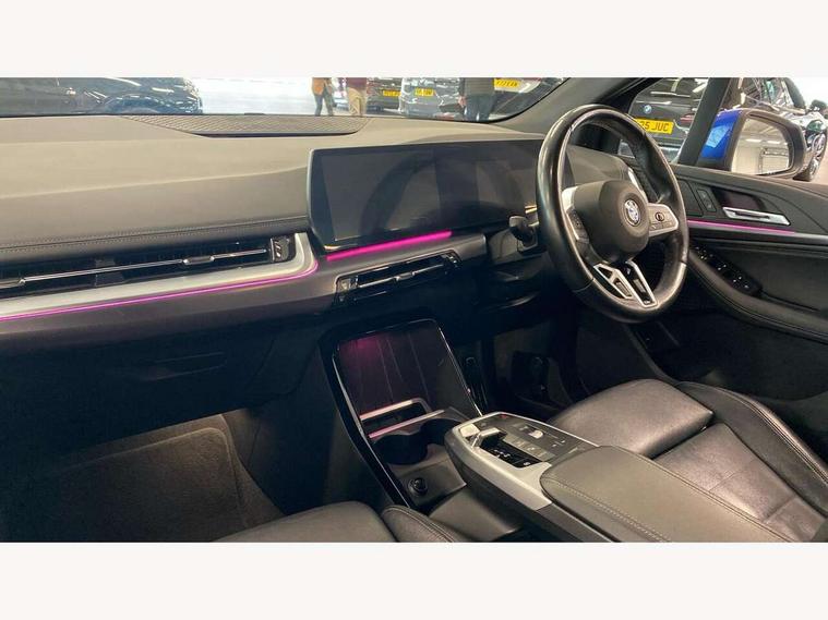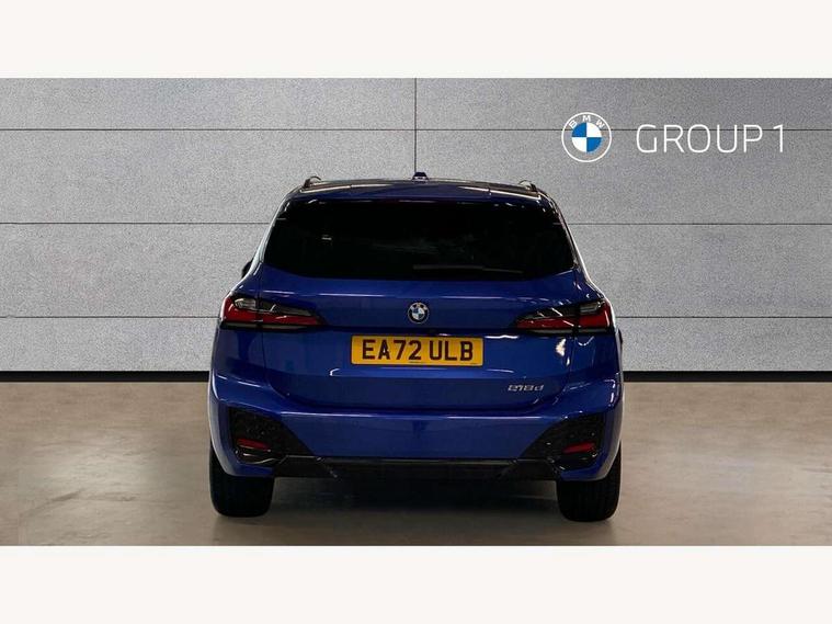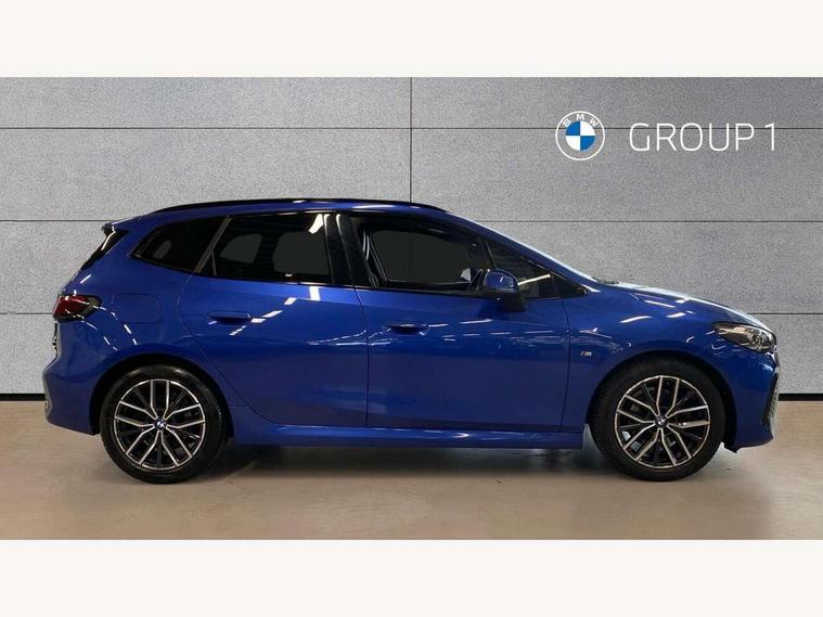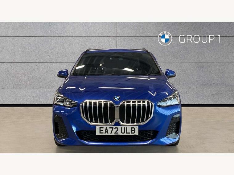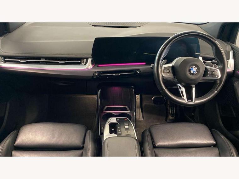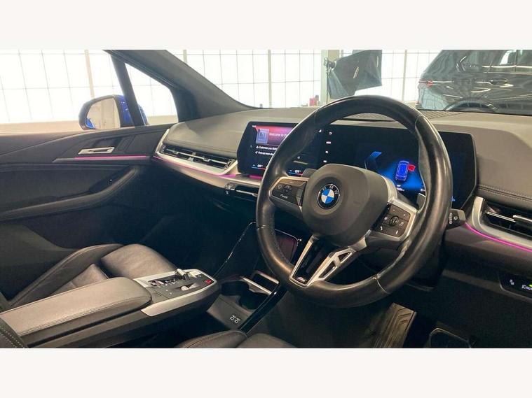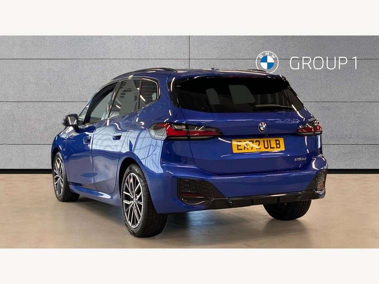 Active Guard incl speed limiting and lane departure functions with auto steering, and front collision warning with brake intervention, Automatic powered tailgate, Automatic start/stop function, BMW Online services, BMW Teleservices, Brake pad wear indicator in front and rear, Condition based service, Drive off assistant, Flat air vents on instrument panel in high gloss black, adjustable slats with elements in pearl chrome, iDrive controller, Language version English, On board computer - average speed+fuel consumption, service interval, clock/date, odometer/trip meter, outside temperature display and ice warning, Parking assistant with active park distance control, reversing assistant, lateral parking aid and rear view camera, Servotronic variable electric power steering (EPS), Smartphone integration, Widescreen display, Diesel particulate filter, Diesel with SCR emission control system, Drive performance control with ECO PRO comfort + sport mode, Gear selector switch with toggle operation, M Adaptive suspension, Steptronic sport transmission with double clutch and gear shift paddles, 2x USB Type C ports in front centre console for charging and data transfer, 2x USB Type C ports in rear centre console for charging, DAB Digital radio, Welcome sound upon opening of the front driver or passenger door, Air inlet middle part on front apron in lines specific design with trim strip in satinised aluminium, Automatic headlights, BMW emblem, engine compartment lid and tailgate, Body colour roof mouldings, Body coloured door mirror caps, Contoured rear roof spoiler in vehicle colour with side aeroblades in black high-gloss, Driver side exterior mirror lighting with BMW logo projection, Dynamic brake lights, Electric adjustable heated door mirrors, Electric windows - front and rear, with open/close fingertip control, anti-trap facility and comfort closing, Folding door handles integrated flush with surface, Front and rear windscreen wipers with heated front washer nozzles, Front bumper cover with independent design in body colour with inserts in black high gloss, Front bumper design elements in satinised aluminium, Front door exit lights, Front door sill finishers aluminium inserts with M inscription, Front entry sills with aluminium inserts + BMW inscription, Front oramental grille with radiator grille bars in satinised aluminium, Heated rear window, Hidden exhaust pipe, High gloss shadow line, High gloss shadowline roof rails, Key with M identification, LED Daytime running lights and parking lights with turn indicators, LED number plate light, LED third brake light in rear spoiler, M identification on sides, Manual headlight range control, Model inscription on right tailgate, Rain sensor, Rear bumper cover with independent design in body colour with inserts in black high gloss, Rear bumper trim strip in satinised aluminium, Rear side wing doors, Shark fin antenna, Side sill covers with independent design in Body colour, Trailer stabilisation logic, Trims on front and rear bumper covers colour-coordinated with side window graphic, Visible VIN plate, Welcome lighting, Window washer nozzle for rear view camera, 12V socket in right side trim panel, 2 bag hooks in luggage compartment, 2 front reading lights, 2 open cup holders in front centre console, 2x 12V power socket in luggage compartment and front centre console, 3 seat bench in 2nd row, 40:20:40 split folding rear seat backrests, Ambient lighting front and rear, Automatic two zone climate control air conditioning, Bottle trays in all doors, Child seat ISOFIX attachment for two outer rear seats and front passenger seat with anchorage points, Driver and front passenger sports seats, Four grab handles integrated in roof lining, Front and rear door pockets, Front and rear footwell lighting, Front and rear side armrest integrated into door trim, Front centre console storage compartment, Front head restraints, Glovebox with light, Heated front seats, Height adjustable 3 rear head restraints, Interior door handle recess light on all doors, Luggage compartment lighting, M Anthracite headlining, M specific floor mats, M sport leather steering wheel, Map pockets, Mechanical rear seats with fore/aft adjustment, Multi-function controls for steering wheel, One piece parcel shelf opens together with tailgate and removable, Rear cloth hooks, Single front passenger seat, Sliding rear seat bench, Stainless steel pedals, Steering wheel column manual adjustment, Storage compartment lighting in centre console and storage tray in centre stack, Storage compartment net in left side trim panel, Storage compartment with folding cover under centre console armrest cushion, Storage tray in right side trim panel, Sunvisors with illuminated vanity mirrors, Three spoke sport leather steering wheel, Connected pack professional - 2 Series Active Tourer, Technology pack - 2 Series Active Tourer - MY22, 3 point seatbelts on all seats, front pyrotechnic belt tensioners, stopper and belt force limiters, rear coded belt buckles, Airbag - Front driver and passenger, front and rear head, front side, curtain head protection, manual deactivation of front passenger airbag possible, Anti lock braking system (ABS) with brake assist, Automatic hold function, BMW emergency call, Brake drying, Braking readiness, Child proof locking system in rear door, Cornering brake control, Crash Sensor - activates hazard/interior lighting + unlocks doors, DSC - Dynamic Stability Control, Dynamic brake control, Dynamic Traction Control - DTC, Electromechanical parking brake, Energy recovery system, Front disc brakes, Integrated braking system, PC iBrake PostCrash approach control warning with light braking function, Rear disc brakes, Tyre pressure monitoring system, Warning triangle and first aid kit, Anti theft alarm system, Closing system with central locking, Engine immobiliser, Locking wheel bolts, Front centre console trim in high gloss black with my mode expressive, Reduced rolling resistance tyres,