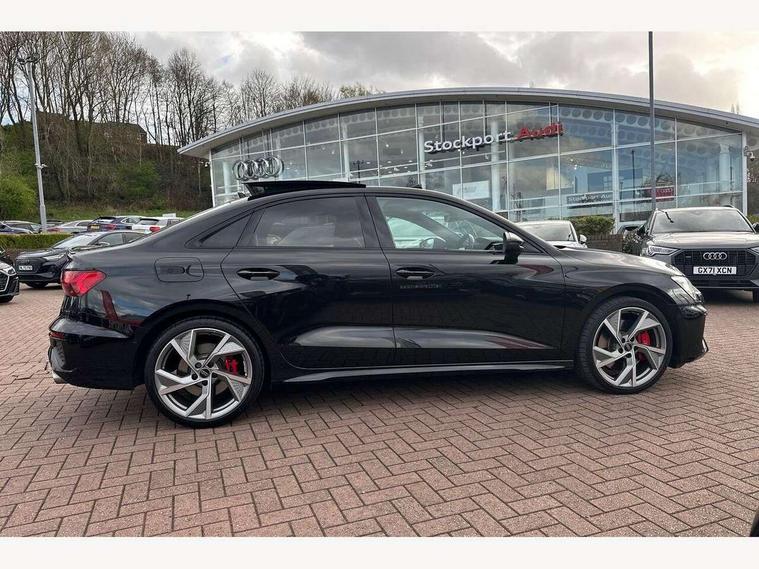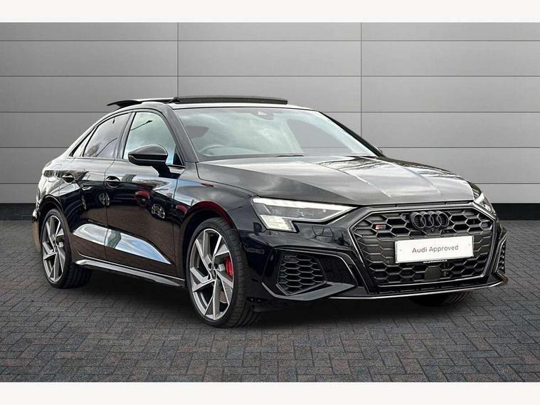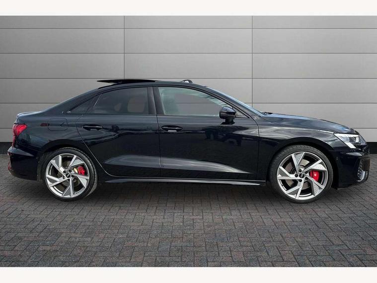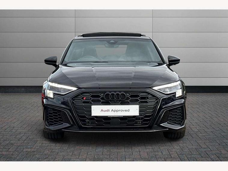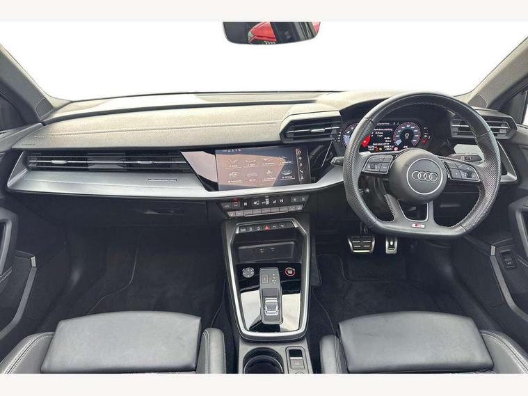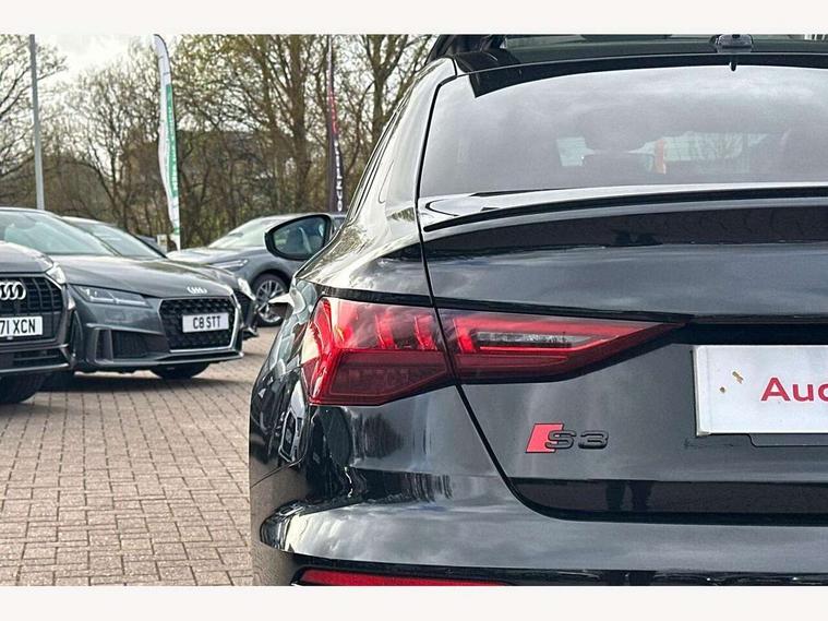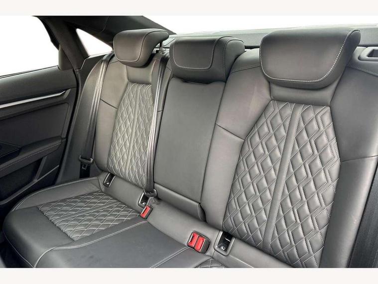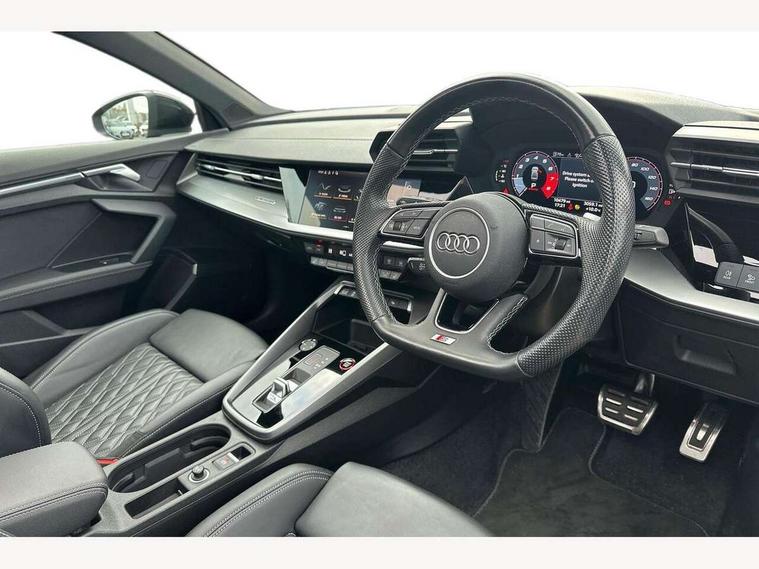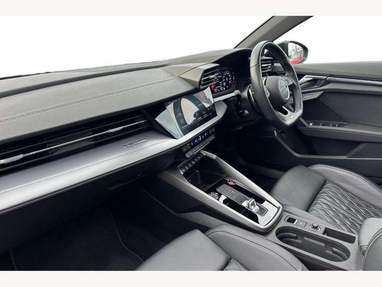 Audi drive select (Auto, Comfort, Dynamic, Efficiency and Individual), Audi smartphone interface, Audi Virtual Cockpit - 10.25" digital and colour instrument cluster, Automatic start/stop system with recuperation, Bluetooth interface, Camera based traffic sign recognition, Collision avoidance assistant, e-Call (emergency call), Lane departure warning system, MMI Navigation Plus with high resolution 10.1" colour touch screen display, Progressive steering, Service indicator, Trip computer, Voice control system with natural language interaction, Quattro permanent all wheel drive, S sport suspension with spring damper adjustment and lowering by 15mm, 2xUSB-C connection with data and charging functions, CD player, DAB Digital radio, 3rd brake light, Acoustic glass windscreen, Audi Beam uses LEDs to project the Audi logo onto the ground as you exit your S3, Auto dimming frameless rear view mirror, Dual branch oval twin tailpipes in chrome plated finish, Electrically adjustable/heated/folding/auto dimming door mirrors with integrated LED indications + kerb view function for passenger side, Front electric windows, Headlight washers, Illuminated door sills with aluminium inserts at the front with S logo, LED daytime running lights, LED headlights with LED rear lights and dynamic rear indicators, Light and rain sensors, Model and engine designation badges at rear, Privacy glass - dark tinted rear window, rear door and side windows, Rear boot, Rear electric windows, Rear side wing doors, 12V socket and storage compartment in front centre console, 3 seat bench in 2nd row, 3 spoke flat bottomed leather multifunction sport steering wheel with gear shift paddles, 4 way electrically adjustable lumbar support for driver and front passenger, 60/40 split folding rear seat bench, Black cloth headlining, Dual zone electronic climate control, Fine Nappa leather upholstery with front sports seats S embossed logo, Front and rear centre armrest in artificial leather, Front and rear headrests, Front/rear floor mats, Height and reach adjustable steering wheel, Interior lighting - glove compartment light and right hand side, Luggage compartment floor covering, Manual boot compartment lid, Manually adjustable front seats, Single front passenger seat, Stainless steel pedals and front footrest in black, Aluminium interior elements pack - A3, Black styling pack - A3 Saloon/S3, Body styling design pack - S3, Extended ambient lighting pack - A3/S3 Saloon, Storage pack - A3/S3 Saloon, Technology pack with parking assist - A3 Saloon, 3x3 point rear seat belts, Driver and front passenger airbag with passenger airbag deactivation, Electronic Stabilisation Control (ESC) including ABS, ASR and EDL, First aid kit with warning triangle and 2 safety vests, Front side airbags with head airbags and interaction airbag, Pre-sense front with pedestrian and cyclist detection, Seatbelt monitoring, Tyre pressure loss indicator, Anti theft alarm, Anti-theft wheel bolts, Electronically operated child locks, Immobiliser, Remote control central locking, Aluminium air vent surrounds, Dark spectrum aluminium inlays, accent surfaces in the dashboard and centre console in platinum grey silk effect paint finish,