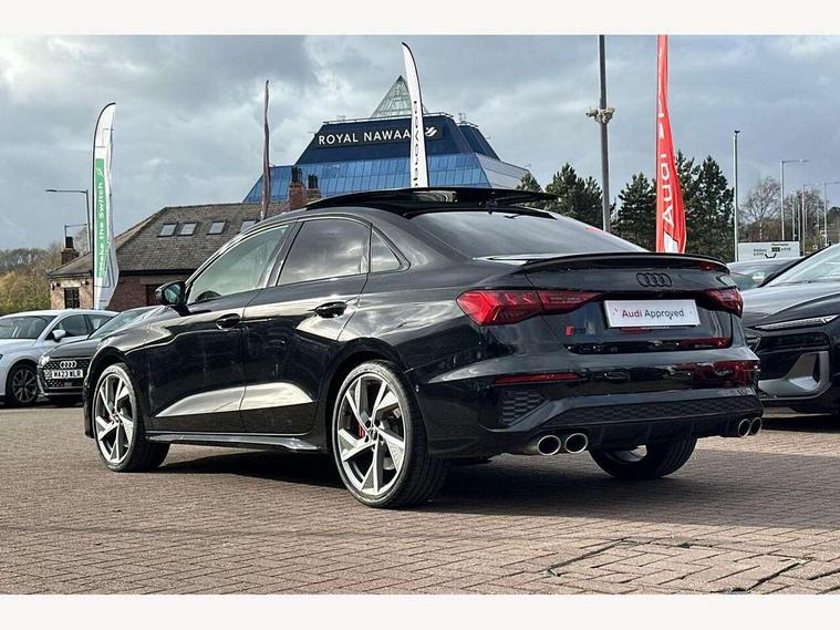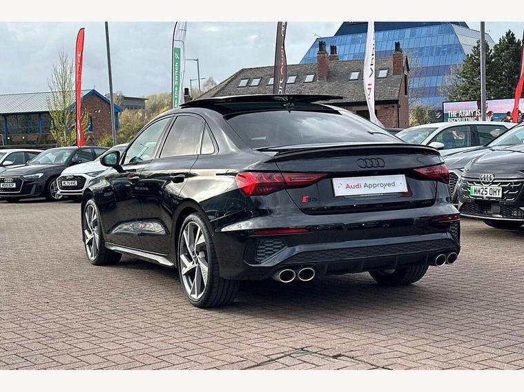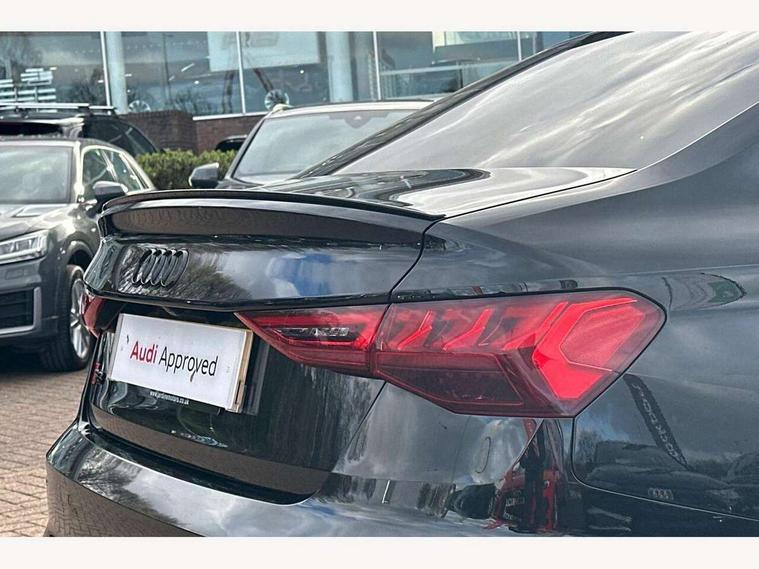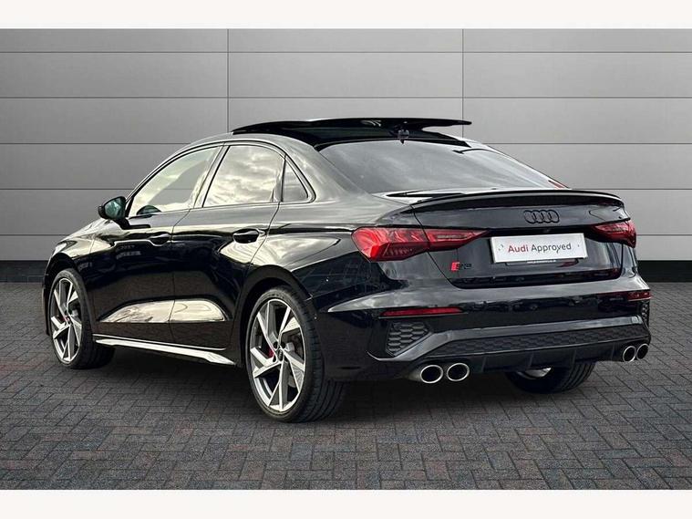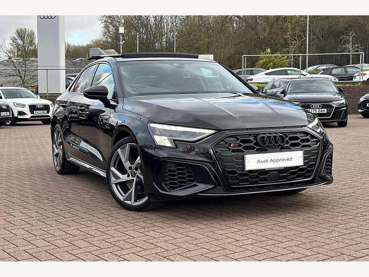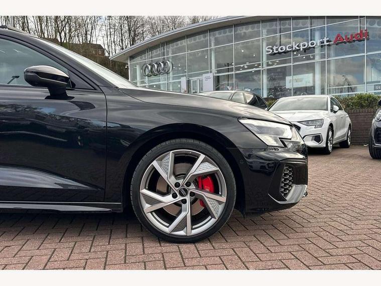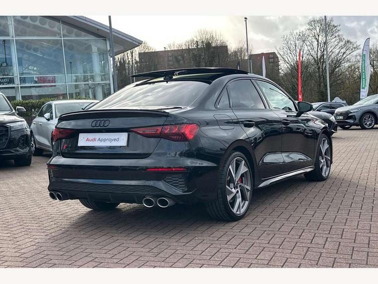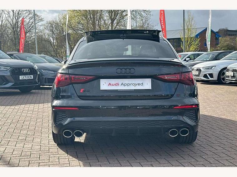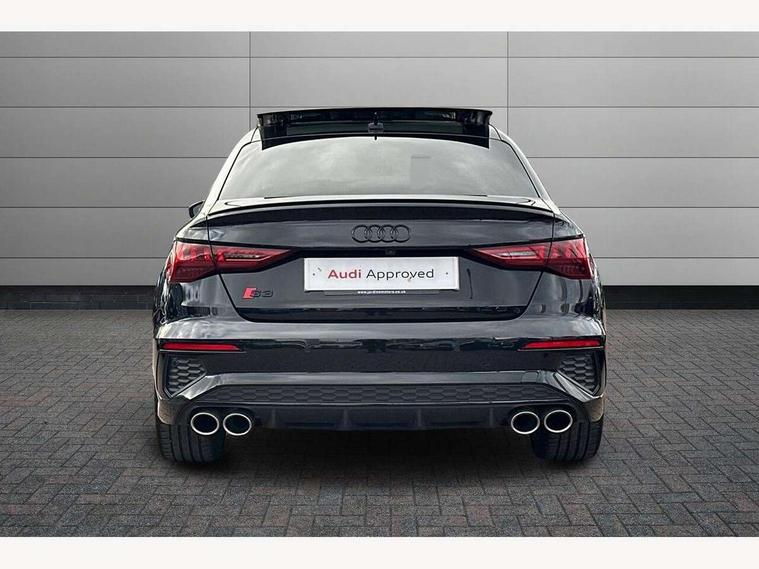 Audi drive select (Auto, Comfort, Dynamic, Efficiency and Individual), Audi smartphone interface, Audi Virtual Cockpit - 10.25" digital and colour instrument cluster, Automatic start/stop system with recuperation, Bluetooth interface, Camera based traffic sign recognition, Collision avoidance assistant, e-Call (emergency call), Lane departure warning system, MMI Navigation Plus with high resolution 10.1" colour touch screen display, Progressive steering, Service indicator, Trip computer, Voice control system with natural language interaction, Quattro permanent all wheel drive, S sport suspension with spring damper adjustment and lowering by 15mm, 2xUSB-C connection with data and charging functions, CD player, DAB Digital radio, 3rd brake light, Acoustic glass windscreen, Audi Beam uses LEDs to project the Audi logo onto the ground as you exit your S3, Auto dimming frameless rear view mirror, Dual branch oval twin tailpipes in chrome plated finish, Electrically adjustable/heated/folding/auto dimming door mirrors with integrated LED indications + kerb view function for passenger side, Front electric windows, Headlight washers, Illuminated door sills with aluminium inserts at the front with S logo, LED daytime running lights, LED headlights with LED rear lights and dynamic rear indicators, Light and rain sensors, Model and engine designation badges at rear, Privacy glass - dark tinted rear window, rear door and side windows, Rear boot, Rear electric windows, Rear side wing doors, 12V socket and storage compartment in front centre console, 3 seat bench in 2nd row, 3 spoke flat bottomed leather multifunction sport steering wheel with gear shift paddles, 4 way electrically adjustable lumbar support for driver and front passenger, 60/40 split folding rear seat bench, Black cloth headlining, Dual zone electronic climate control, Fine Nappa leather upholstery with front sports seats S embossed logo, Front and rear centre armrest in artificial leather, Front and rear headrests, Front/rear floor mats, Height and reach adjustable steering wheel, Interior lighting - glove compartment light and right hand side, Luggage compartment floor covering, Manual boot compartment lid, Manually adjustable front seats, Single front passenger seat, Stainless steel pedals and front footrest in black, Aluminium interior elements pack - A3, Black styling pack - A3 Saloon/S3, Body styling design pack - S3, Extended ambient lighting pack - A3/S3 Saloon, Storage pack - A3/S3 Saloon, Technology pack with parking assist - A3 Saloon, 3x3 point rear seat belts, Driver and front passenger airbag with passenger airbag deactivation, Electronic Stabilisation Control (ESC) including ABS, ASR and EDL, First aid kit with warning triangle and 2 safety vests, Front side airbags with head airbags and interaction airbag, Pre-sense front with pedestrian and cyclist detection, Seatbelt monitoring, Tyre pressure loss indicator, Anti theft alarm, Anti-theft wheel bolts, Electronically operated child locks, Immobiliser, Remote control central locking, Aluminium air vent surrounds, Dark spectrum aluminium inlays, accent surfaces in the dashboard and centre console in platinum grey silk effect paint finish,