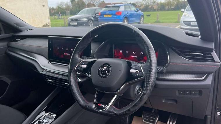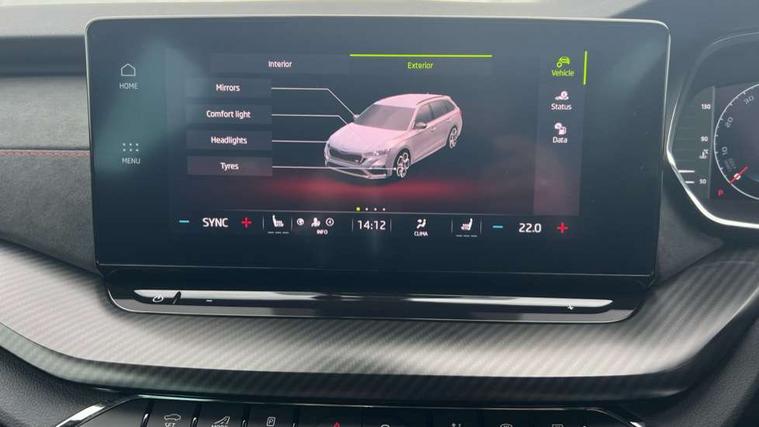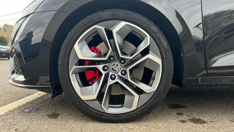 1x USB Type C port in rear view mirror (charging only), 2x USB Type C ports in rear of front centre armrest (charging only), Bluetooth system, Columbus satellite navigation with 10" touchscreen display, Driver fatigue sensor, eCall emergency system, Front and rear parking sensors with manoeuvre assist, Front assist system, Progressive dynamic steering, Speed limiter, Turn Assist, Virtual Cockpit - 10.25" digital display, Virtual pedal with electrically operated boot door (Rear LED lights (high functionality), dynamic indicators - Estate, Voice control system, Wireless SmartLink for Apple Car Play, Electronically controlled limited slip differential, Front and rear stabilizers, 2x USB Type C ports (for charging and data transfer), 8 speakers, DAB Digital radio, Aero front windscreen wipers with intermittent function, Auto dimming rear view mirror, Black roof rails, Body colour door handles, Chrome exhaust tailpipes, Door sills with vRS logo, Electric front and rear windows, Exterior gloss black sports styling including front grille, side strip, window surrounds, door mirror and badging, Full LED Matrix headlights with AFS, rear LED lights (high functionality) and dynamic indicators and cornering front fog lights, Headlight washers, Heated rear windscreen, High level third brake light, Ice scraper in fuel cap, LED daytime running lights, Rain and light sensors, Rear fog light on one side, Rear privacy glass, Rear side wing doors, Rear spoiler, Rear window wiper, 3 seat bench in 2nd row, 4 foldable roof handles, Aluminium pedals, Black headlining, Black microsuede padded dash panel with red contrast stitching, Chrome inner door handles, Front centre armrest, Front head restraints, Heated front seats, Illuminated glovebox, Leather trimmed gearshift lever, Luggage compartment lighting with two side lamps, Mechanical rear seat release, Parcel shelf - rolling, Single front passenger seat, Sunglasses storage, Textile floor mat set, Three spoke leather sports multifunction steering wheel with paddles, Ticket holder, Umbrella in door panel, Unsplit rear bench seat and split folding backrest, LED interior light pack - Octavia, 3 point front/outer rear seatbelts+pre-tensioners, Alarm with interior monitoring, tilt sensor and back up horn, Automatic door unlocking in case of crash, Automatic fuel cut off in case of crash, Automatic warning lights in case of emergency braking, Curtain airbags and front side airbags, Driver and front passenger airbags, Drivers knee airbag, Electronic parking brake, ESC including ABS, EBV, MSR, ASR, EDS, HBA, DSR, Front and rear disc brakes, Front central airbag, Hill hold control, Hill start assist, ISOFIX on front passenger seat and outer rear seats, Manual rear child locks, Passenger airbag deactivate switch, Pro active services, Red brake calipers, Two tone horn, Tyre pressure monitor, Visual and acoustic seat belt reminder, Warning reflectors in front door, Door locks with immobiliser, Keyless entry and start/stop including rear doors, Remote central locking, Carbon optic decorative inserts, Gloss black air vent surrounds, 19" Altair anthracite alloy wheels,