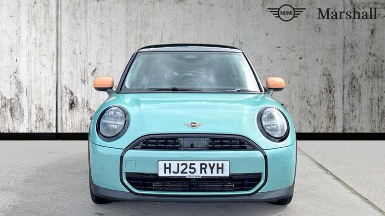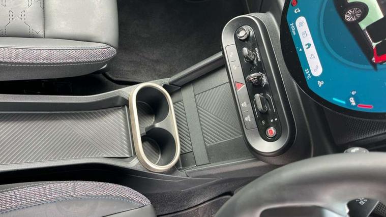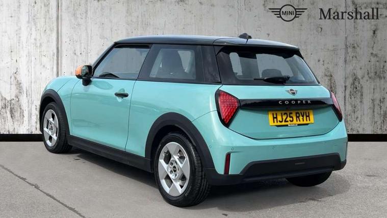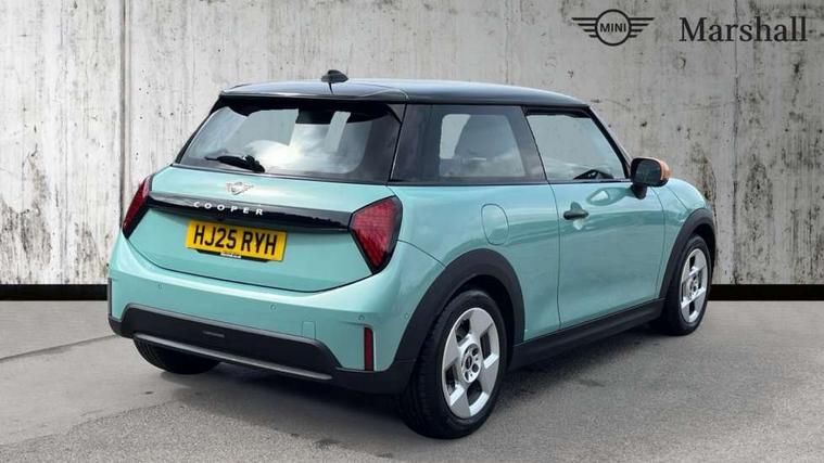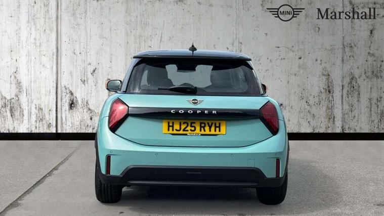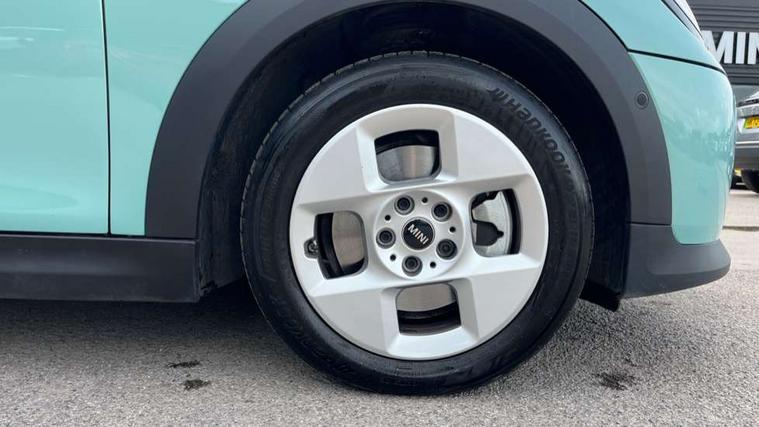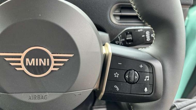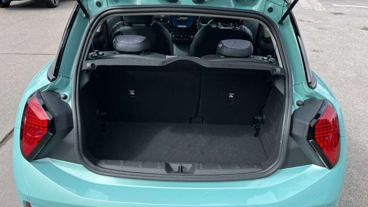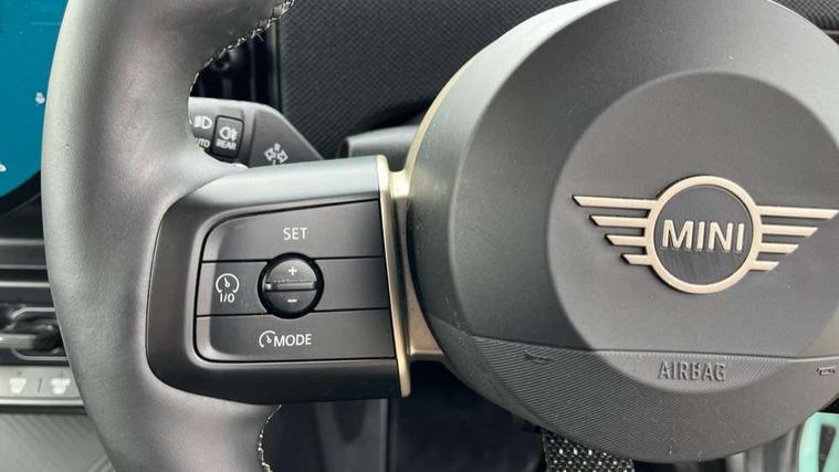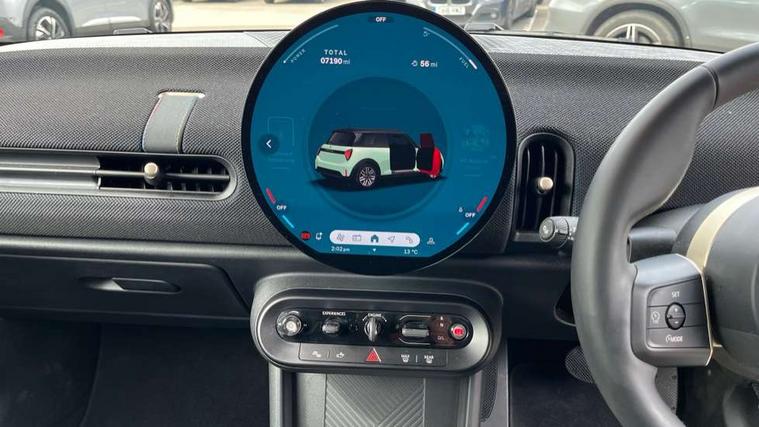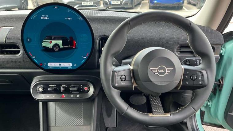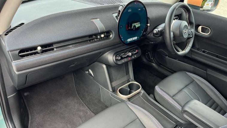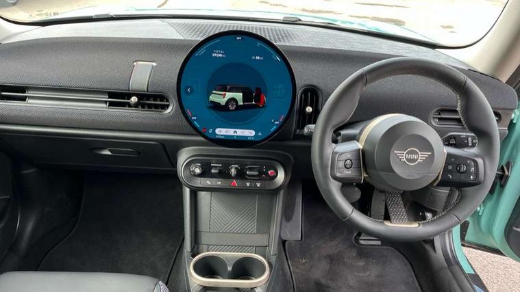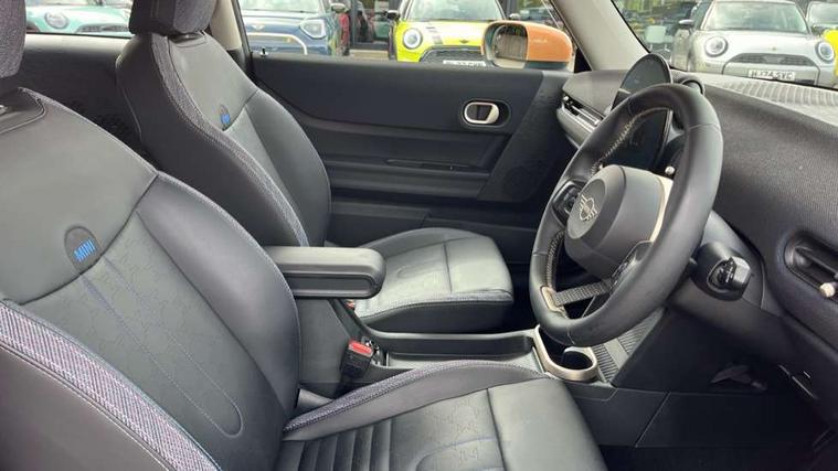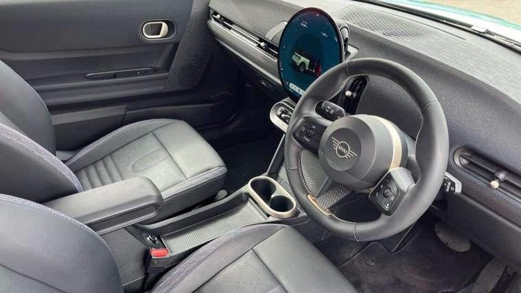 Central toggle bar, Circular OLED Screen, Compatible mobile phone bluetooth with audio streaming, Cruise control, Digital instrument cluster, Electro-mechanical speed dependant steering assistance, Emergency call service, MINI Experience Modes, Mini navigation system, On board computer, Service interval indicator, Tailgate, 7 speed steptronic transmission with double clutch, DAB Digital radio, Personal eSim, Auto headlights, Black grille surround, Electric adjustable heated door mirrors, Electric front windows, Heated rear window, Heated windscreen washer jets, LED 3rd brake light, LED daytime running lights, LED Headlights, LED indicator lights, LED rear lights, Rain sensor window wipers, Rear fog lights, Rear window wiper, 2 seat bench in second row, 2 zone automatic air conditioning, 60/40 rear seat bench, Ambient lighting, Cupholders, Front and rear head restraints, Front compact armrest, Front floor mats, Heated steering wheel, Height adjustable passenger seat, Light headliner, Luggage compartment lighting, Single front passenger seat, Sport Vescin Steering Wheel black with vibrant silver accents, Sunvisors with vanity mirrors, Vescin/Cloth upholstery includes dash knit in black with blue accents, Driving assistant pack - Cooper Hatchback, Park assistant pack - Cooper Hatchback, 3 point seatbelts on all four seats, 6 Airbags - front, side, head and seat belt tensioners, Anti-lock braking system (ABS), DSC - Dynamic Stability Control, Electronic parking brake, Front and rear disc brakes, Front ISOFIX (iSize), Front passenger airbag deactivation, Traction control, Tyre pressure monitoring system, Alarm, Immobiliser, Remote central locking, Tyre repair kit,