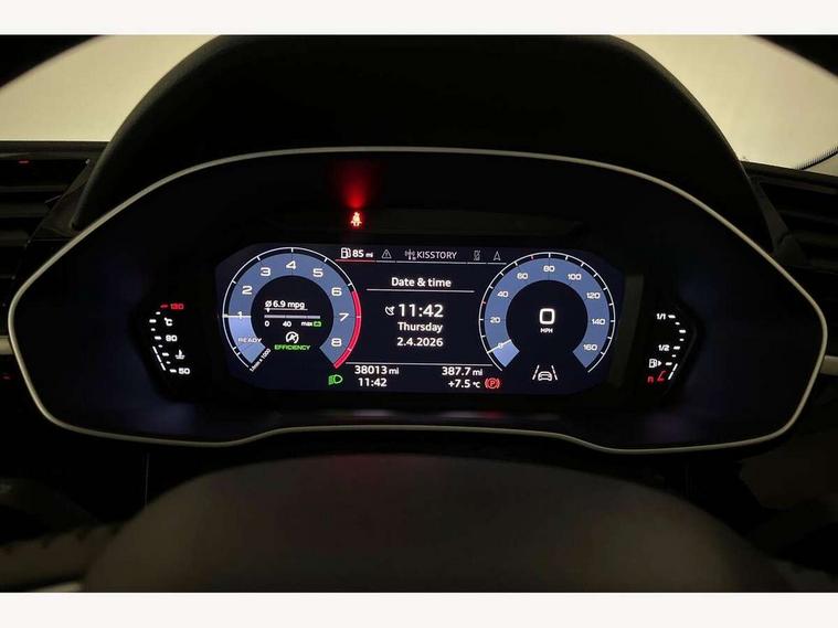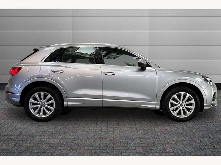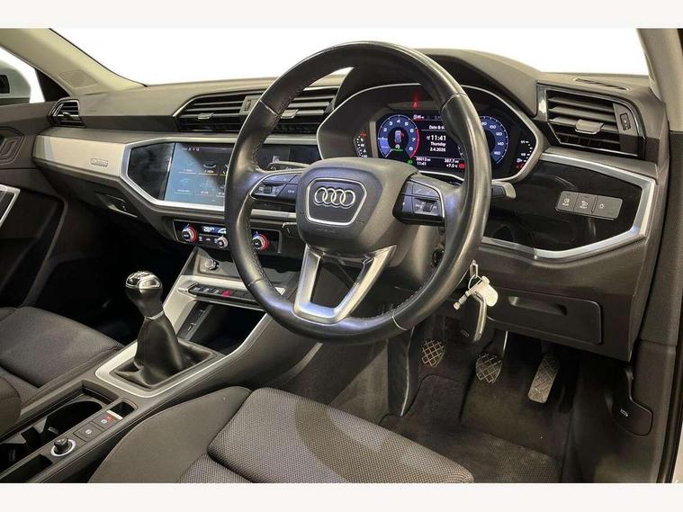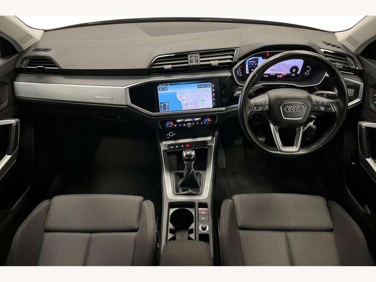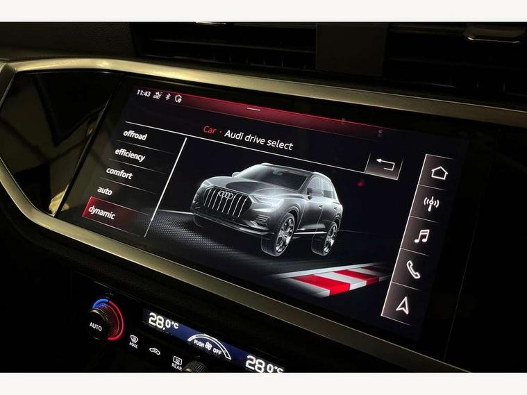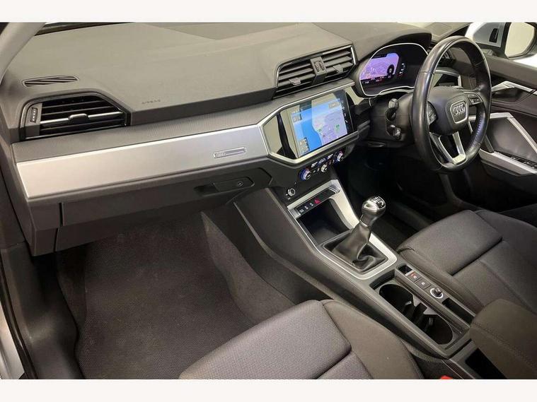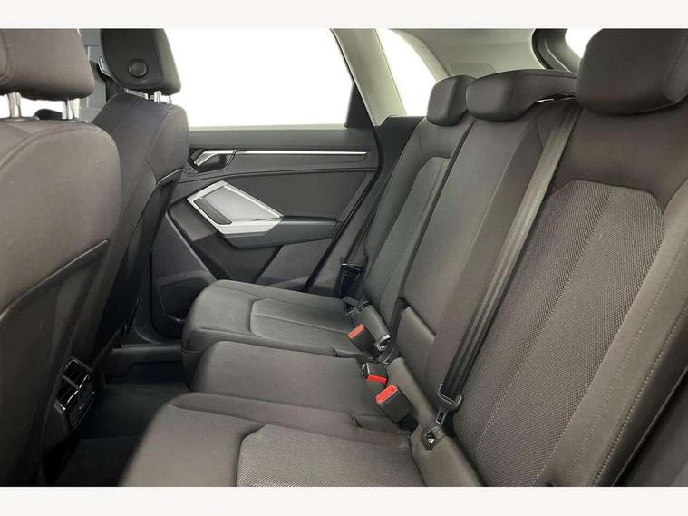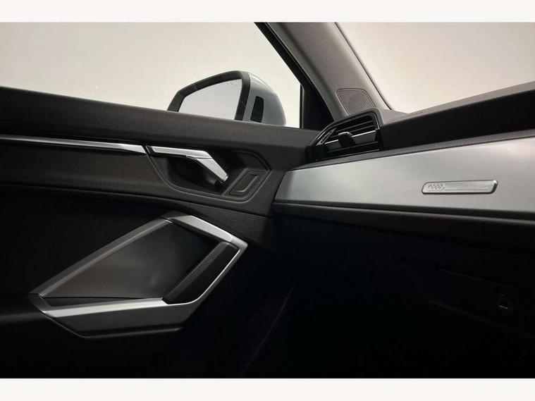 Audi connect safety and service (e-call), Audi drive select, Audi lane departure warning, Audi side assist, Audi smartphone interface, Audi Virtual Cockpit - 10.25" display, Bluetooth interface, Camera based traffic sign recognition, Cruise control + speed limiter, MMI navigation plus with MMI touch, Power opening/closing tailgate, Progressive steering, Rear parking sensors, Service interval indicator, Stop/start system, Voice control system, Standard suspension, 1 x USB type C and 1 USB type A charging points, 6 speakers, DAB digital radio module, Acoustic windscreen, Aluminium roof rails, Aluminium window trim, Auto dimming rear view mirror, Body coloured bumpers, Electrically adjustable and heated door mirrors with integrated LED side indicators, Front and rear electric windows, Front fog lights, Front side air inlets in matt selenite silver, Front spoiler in matt selenite silver, Grille vertical bars in aluminium silver/Matt, High gloss black finish B and C pillars, LED headlights with LED daytime running lights and dynamic rear indicator, LED rear lights, Rain and light sensors, Rear diffuser strip in selenite silver, Titanium black radiator grille, 12V socket in rear centre console, 40:20:40 split folding rear bench seat, Adjustable rear seat bench/backrest, Aluminium door sill trims, Dual zone climate control, Front and rear headrests, Front and rear roof module including reading lights, Front and rear velour floor mats, Front centre armrest with storage compartment and angle adjustment, Glove compartment lighting, Height and reach adjustable steering wheel, ISOFIX child seat mounting and Top Tether with front passenger airbag deactivation, Luggage compartment light, Lunar silver cloth headlining, Manual front seats with height adjustment, Stainless steel luggage compartment sill finisher, Non smoking pack - Q3, 3x3 point rear seatbelts, 6 airbags - Driver, front passenger, curtain and side windows, Audi pre-sense front with pedestrain and cyclist recognition, Electrically operated child locks on rear doors, Electromechanical parking brake, Electronic stabilisation control including ABS, ASR and EDL, Hill descent control, Hill hold assist, Pre sense basic, Seatbelt monitoring, Tyre pressure warning, Warning triangle and first aid kit, Anti theft alarm, Anti theft wheel bolts, Remote central locking, MMI touch colour display in gloss black with aluminium surround,