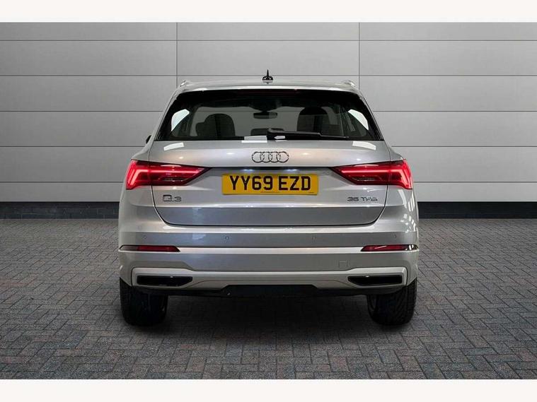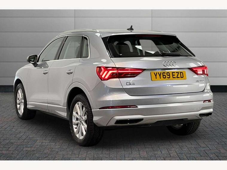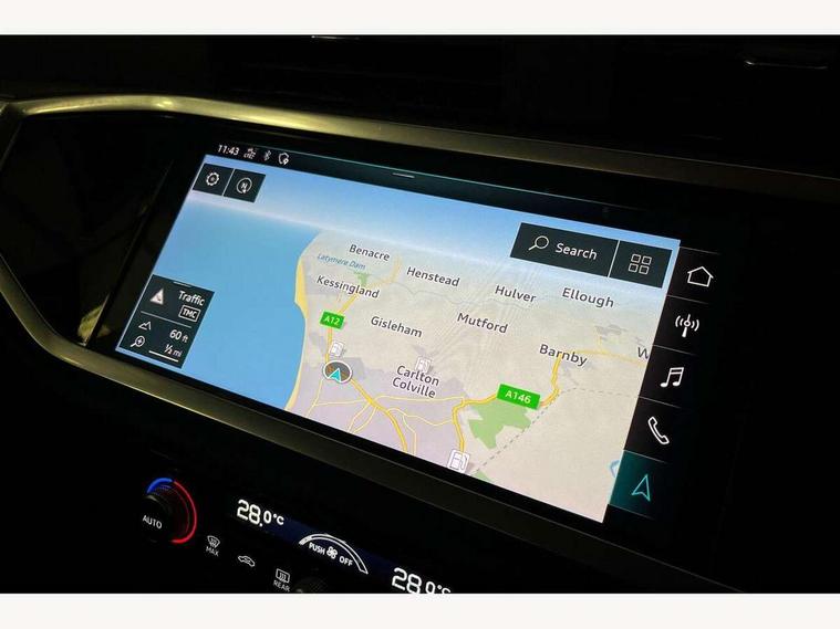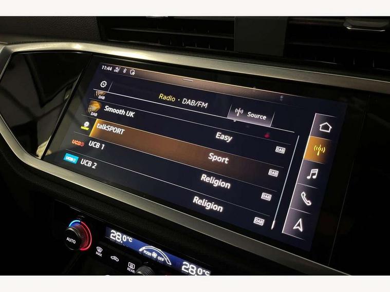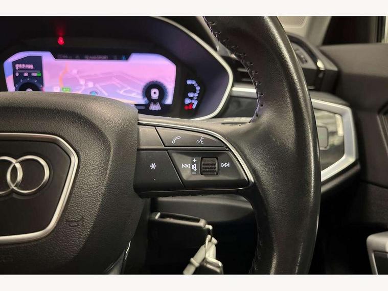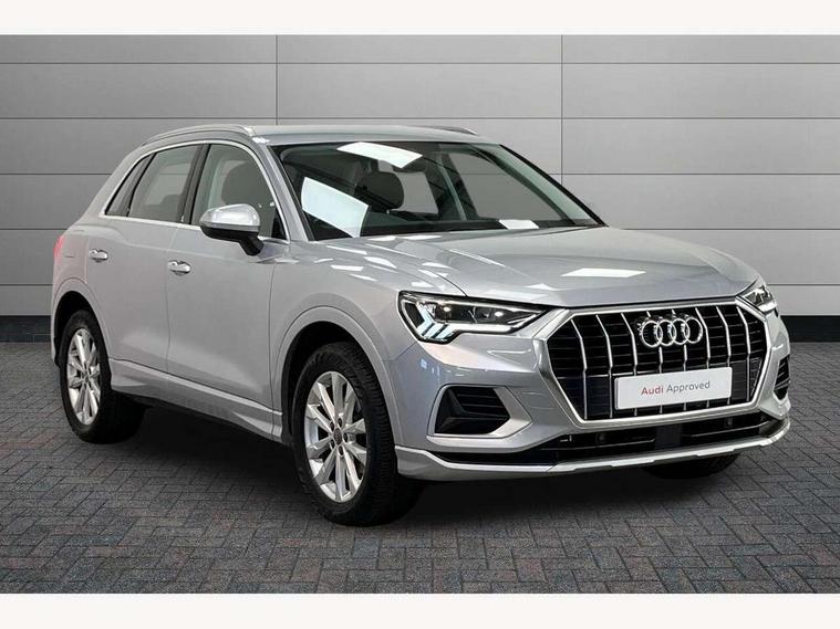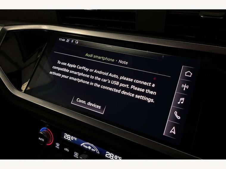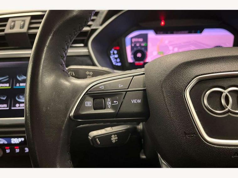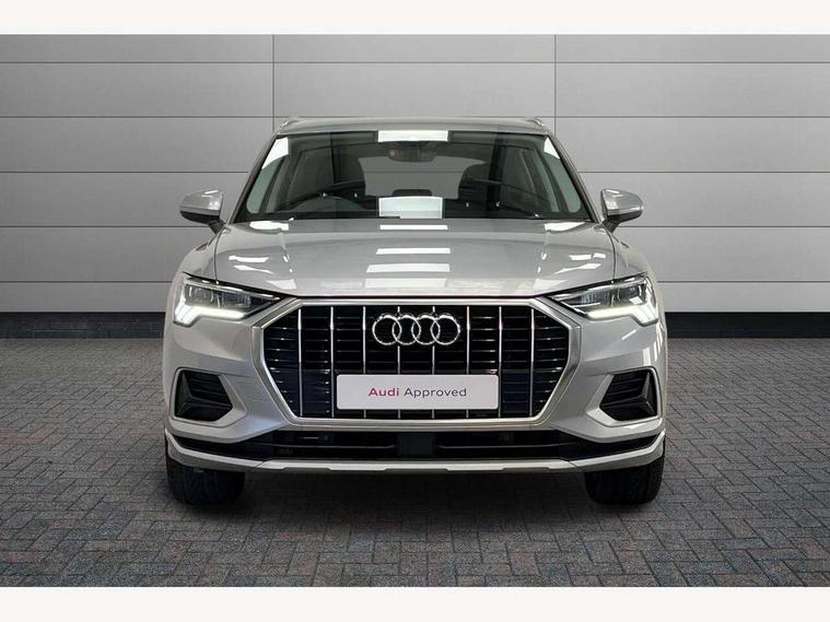 Audi connect safety and service (e-call), Audi drive select, Audi lane departure warning, Audi side assist, Audi smartphone interface, Audi Virtual Cockpit - 10.25" display, Bluetooth interface, Camera based traffic sign recognition, Cruise control + speed limiter, MMI navigation plus with MMI touch, Power opening/closing tailgate, Progressive steering, Rear parking sensors, Service interval indicator, Stop/start system, Voice control system, Standard suspension, 1 x USB type C and 1 USB type A charging points, 6 speakers, DAB digital radio module, Acoustic windscreen, Aluminium roof rails, Aluminium window trim, Auto dimming rear view mirror, Body coloured bumpers, Electrically adjustable and heated door mirrors with integrated LED side indicators, Front and rear electric windows, Front fog lights, Front side air inlets in matt selenite silver, Front spoiler in matt selenite silver, Grille vertical bars in aluminium silver/Matt, High gloss black finish B and C pillars, LED headlights with LED daytime running lights and dynamic rear indicator, LED rear lights, Rain and light sensors, Rear diffuser strip in selenite silver, Titanium black radiator grille, 12V socket in rear centre console, 40:20:40 split folding rear bench seat, Adjustable rear seat bench/backrest, Aluminium door sill trims, Dual zone climate control, Front and rear headrests, Front and rear roof module including reading lights, Front and rear velour floor mats, Front centre armrest with storage compartment and angle adjustment, Glove compartment lighting, Height and reach adjustable steering wheel, ISOFIX child seat mounting and Top Tether with front passenger airbag deactivation, Luggage compartment light, Lunar silver cloth headlining, Manual front seats with height adjustment, Stainless steel luggage compartment sill finisher, Non smoking pack - Q3, 3x3 point rear seatbelts, 6 airbags - Driver, front passenger, curtain and side windows, Audi pre-sense front with pedestrain and cyclist recognition, Electrically operated child locks on rear doors, Electromechanical parking brake, Electronic stabilisation control including ABS, ASR and EDL, Hill descent control, Hill hold assist, Pre sense basic, Seatbelt monitoring, Tyre pressure warning, Warning triangle and first aid kit, Anti theft alarm, Anti theft wheel bolts, Remote central locking, MMI touch colour display in gloss black with aluminium surround,