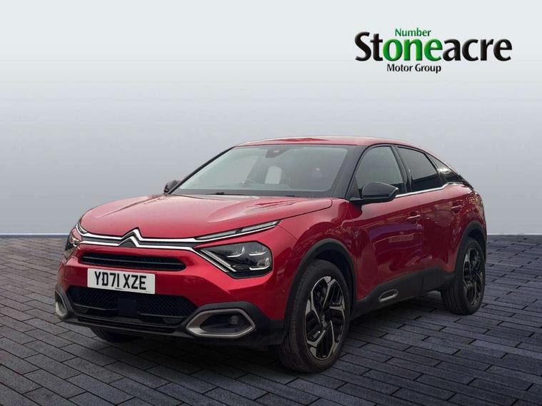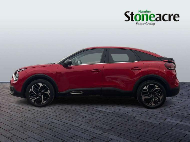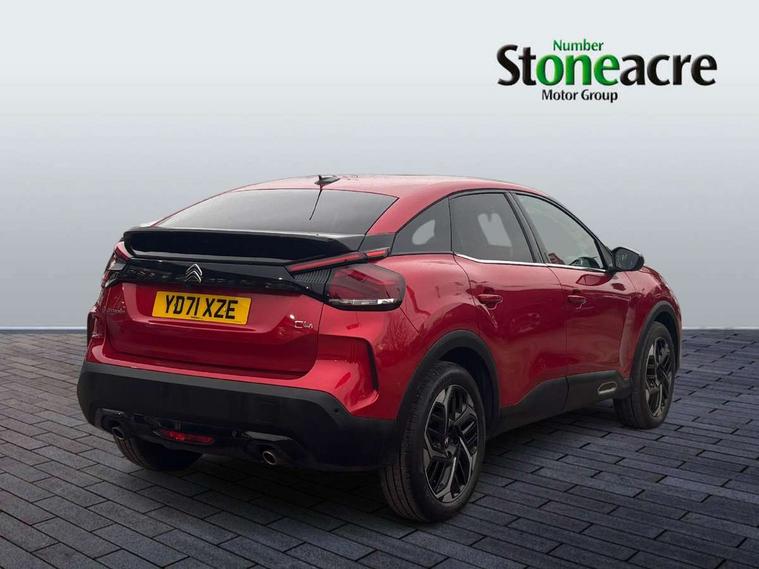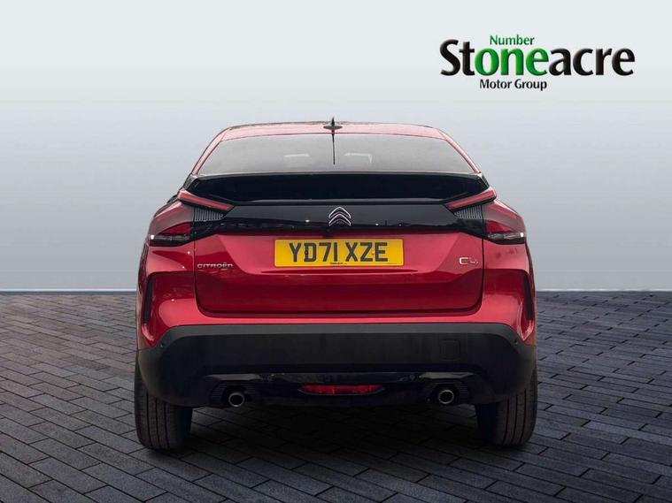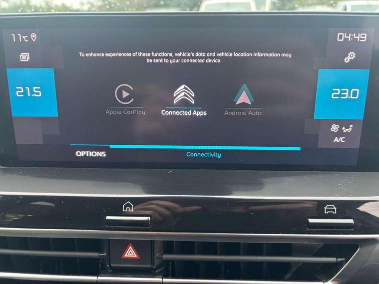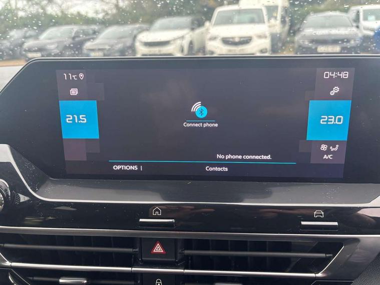10" high resolution touchscreen user interface, controlling media, connectivity and vehicle settings, 5.5 inch backlit full TFT driver's instrument cluster with LED ambient lighting, Active blind spot detection, Apple car play and Android auto, Citroen connect box emergency and assistance system, Citroen connect nav with speed cam and danger zones alert, Cruise control + speed limiter, Driver's head-up display, Electronic Power Steering (EPS), In-crash braking, Voice commands, Suspension with progressive hydraulic cushions - double hydraulic stops on front suspension and single on rear suspension, Auxiliary input socket, Bluetooth telephone and audio streaming, DAB Digital radio, Body colour bumpers, Body colour door handles, Body colour painted external rear view mirrors, Dark tinted rear windows and side windows with chrome detail, Electrically heated, folding and adjustable external rear view mirrors with courtesy lighting, Electrochrome interior rear-view mirror with automatic day-night switching, Front and rear electric windows, Gloss black rear skirt, Intelligent beam headlights, LED daytime running lights in V signature, LED front fog lamps with static cornering function, LED front headlamps, Rain sensing automatic front windscreen wipers, Welcome and goodbye lighting, 12V power outlet, 1x USB Type-C socket charging & data connection and 1x USB Type-A socket in 1st row and 1x USB Type-A socket charging in 2nd row, 3 rear headrests, Boot light, Dashboard tray in front cabin, Deluxe leather steering wheel with two command blocks, Driver and passenger sunvisors with illuminated vanity mirrors, Dual zone automatic air conditioning, Front and rear LED interior lighting, Front head restraints, Height adjustable front passenger seat, Height and reach adjustable steering wheel, Map pockets in rear of front seats, Raised centre console with armrest and two cup holders, Split folding rear seats, Two position boot floor, High level acoustic insulation pack - C4/C4 X/e-C4 X, Safety pack plus - C4 Shine/ Shine Plus, 3x3 point rear seatbelts, ABS, Driver and front passenger airbags, Electric parking brake, ESP, Front seatbelt pretensioners, Hill start assist, Manual child lock in second row, Manual deactivation of front passenger airbag, Post collision safety brake, Row 1 and 2 curtain airbags, Row 1 side thorax airbags, Seatbelt unfastened on the move warning, Tyre underinflation detection, Anti-theft alarm (volumetric protection), Immobiliser, Keyless entry and start, Remote locking with deadlocks, 18" Bi-tone diamond-cut aeroblade alloy wheels with anti-theft locking wheel nuts, Puncture repair kit with compressor,