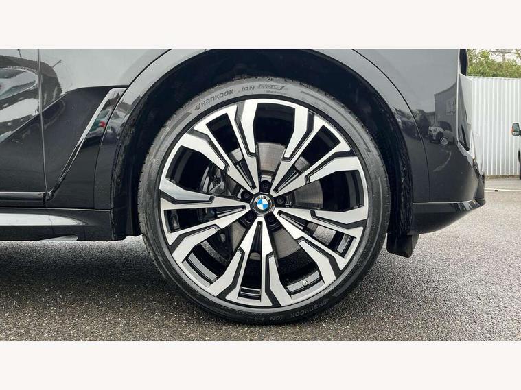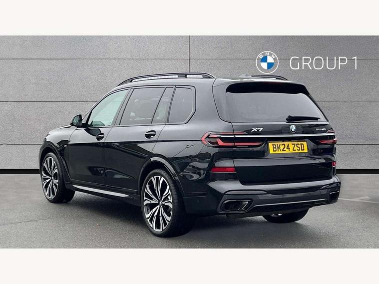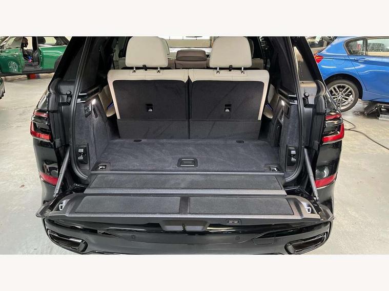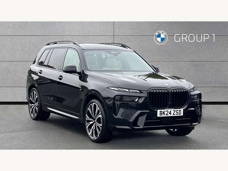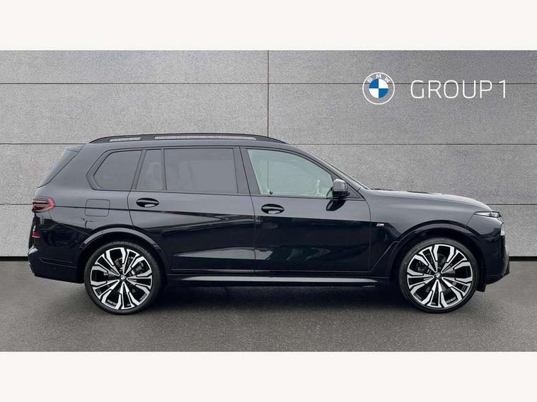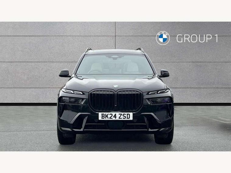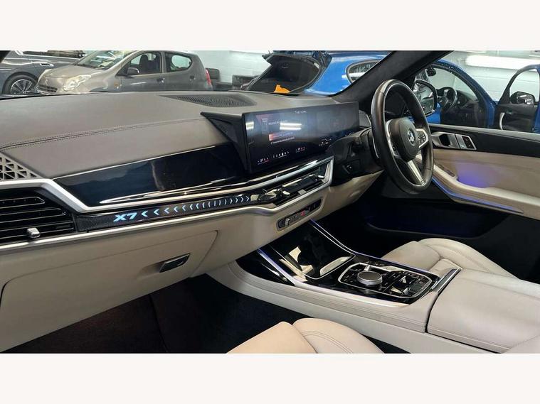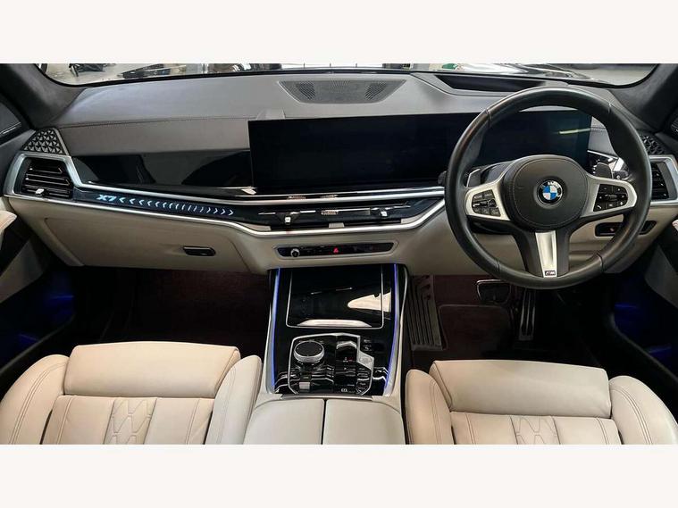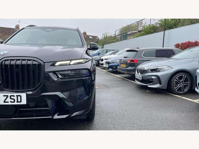 Attentiveness assist, Automatic start/stop function, Automatic tailgate operation, BMW ConnectedDrive online services, BMW Drive recorder, BMW gesture control, BMW Teleservices, Brake pad wear indicator in front and rear, Condition based service, Electric power steering with Servotronic steering optimised at all speed ranges, Integrated owner's handbook, Live Cockpit Professional with head up display including 12.3" instrument cluster and 14.9" central display, Parking assistant pro including reversing assistant, PDC, lateral parking aid, reversing assist camera, parking drive off monitoring, Speed limiter, 48V Mild hybrid technology, 8 speed automatic with steptronic transmission including automatic hold function and gearshift paddles on the steering wheel, Drive experience switch with comfort mode + ECO PRO + sport mode, Permanent all wheel drive, DAB radio, Personal eSim, Acoustic glazing, Adaptive air flap control bars in high gloss black, Air breather and door claddings in high gloss chrome, Aluminium roof rails, Aluminium Running Board, Body coloured wheel arches, Dynamic brake lights with LED technology, Electrically adjustable and heated aspheric folding side mirrors with auto dimming, electric fold in function, automatic parking function, Exterior and central air inlets in front bumper painted pearl chrome, Follow me home headlight function, Frameless interior mirror, Front and rear electric windows, Front ornamental grille struts in chrome high gloss, Heated windscreen washer nozzles, High beam assist, High gloss black shadowline trim in side/window frame, window recess cover, window guide, B and C pillar, mirror triangle, mirror base, mirror frame, Integrated turn indicators (door), Kidney grille iconic glow, LED daytime running lights, LED rear lights, LED third brake light in rear spoiler, One piece front ornamental grille frame in pearl gloss chrome, Rain sensor with automatic headlight activation and windscreen wiper control, Rear side wing doors, Side window graphic in satinated aluminium, Sump guard front and rear painted in silver, Trailer stabilisation logic, 12V - Power sockets with 2x centre console and 1x luggage compartment, 2 seat bench in 3rd row, 3 seat bench in 2nd row, 40:20:40 split folding rear seat backrests, Additional storage compartments, BMW inscription in front and rear door entry sills with illuminated, Centre console includes storage compartment, Compartment in front of cupholder, Driver and front passenger sunvisors with illuminated vanity mirrors and ticket holder, Electrical steering column with adjustable height and length with activation and control on the steering column, Front and rear colour co-ordinated with all standard carpet colours, Front and rear door pockets, Front and rear side armrests integrated into door trim, Grab handles, Height adjustable front headrests, Height adjustable rear headrests, Lockable glove compartment, M leather steering wheel, Nano filter, Single front passenger seat, Soft close doors, Storage tray and compartment with lid in centre console, Wireless charging tray, Additional storage compartment pack - X7, Ambient light interior pack - X7, Connected Package Professional - X7, Interior lighting pack - X7, Luggage compartment pack - X7, M aerodynamics pack - X7, 3 point seatbelts on all seats, front pyrotechnic belt tensioners, stopper and belt force limiters, front and outer rear seats, Acoustic protection for pedestrians, Active protection, Airbag - Front driver and passenger, side airbags and Head airbags, Anti lock braking system (ABS) with cornering brake control, Automatic Stability Control (ASC), BMW emergency call, Child seat ISOFIX attachment rear outer seats in 2nd row and both seats in 3rd row includes top tether, Comfort cushion seats for outer seats in 2nd row, Crash sensor inclu activation of airbags, interior light, safety battery terminal clamp, hazard warn flasher, unlock doors, deactivation of fuel pump, DSC - Dynamic Stability Control, Dynamic Traction Control - DTC, Electromechanical parking brake with automatic drive away release and auto hold function, Front and rear brake discs with interior ventilation, Hill descent control, Integrated braking system, Manual child lock in rear doors, PC iBrake PostCrash approach control warning with light braking function, Tyre pressure monitoring system, Tyre pressure sensors, Variable torque distribution, Warning triangle and first aid kit, Alarm, Central locking including 2 vehicle keys with integrated emergency key, Comfort access system, Engine immobiliser, Locking wheel bolts, Galvanic embellisher for controls,
