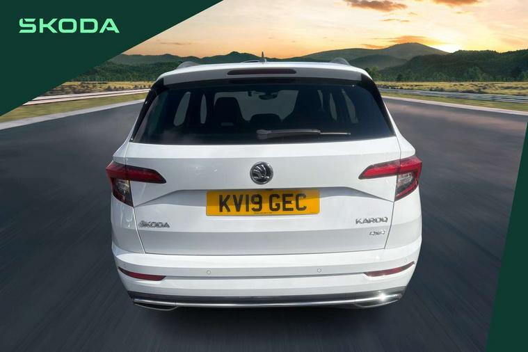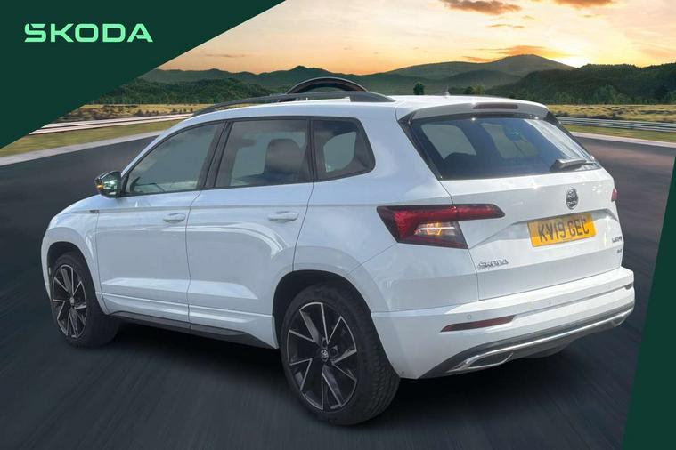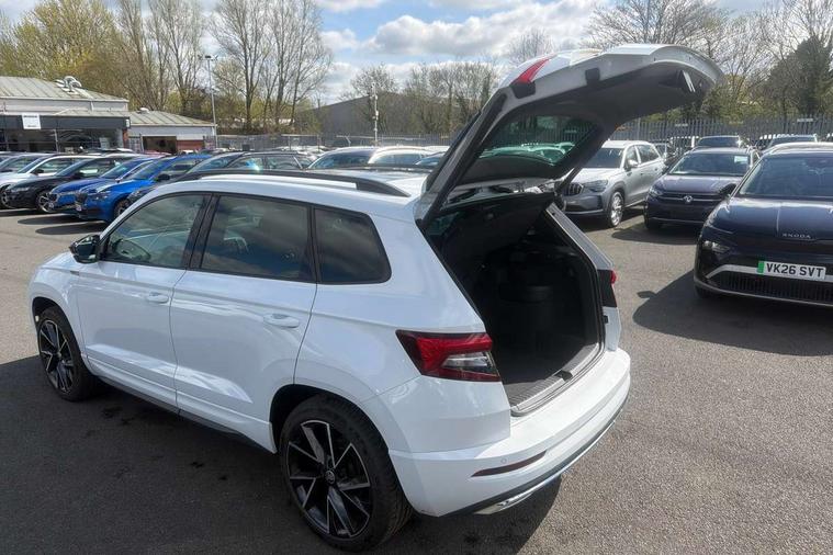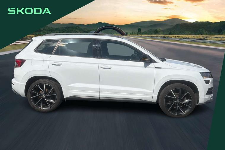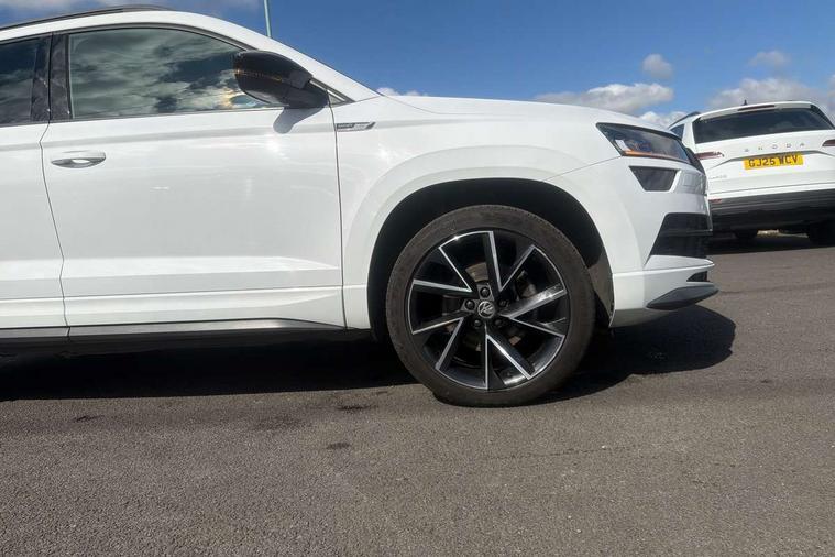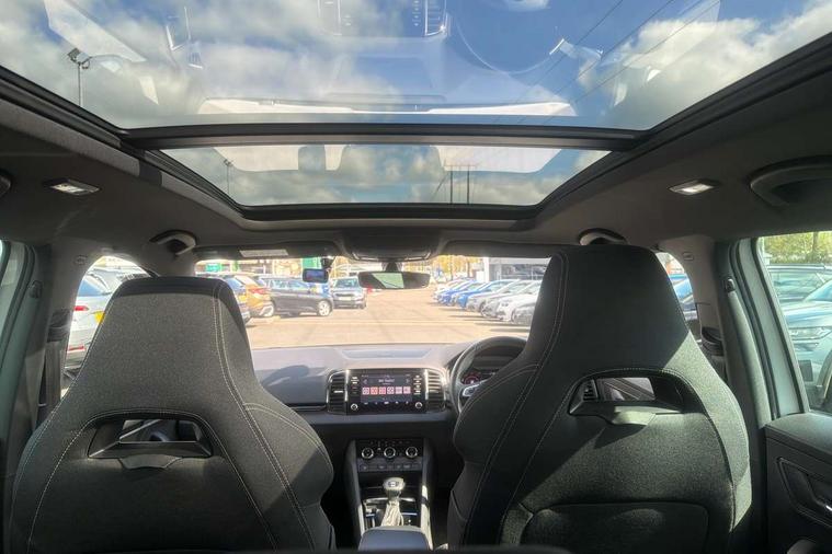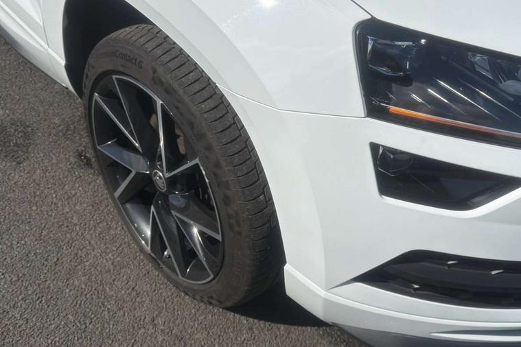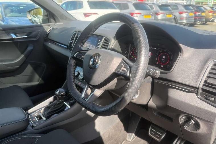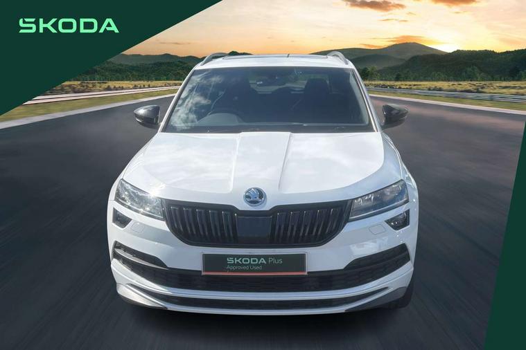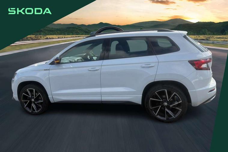 Drive mode selection with off road, Driver alert system, Driver fatigue sensor, Driver profile selection, Multifunction colour trip computer, Outside temperature gauge, Rear view camera, Service interval indicator, Start/stop system with regenerative braking, DAB radio with Bluetooth, SD card slot, USB connection, Acoustic glass, Aero front windscreen wipers with intermittent function, Automatic headlight control system, Black roof rails and door mirrors with radiator grille, Body colour door mirrors and handles, Chrome outside aluminium bar around the window, Electric front and rear windows with child proof lock, Electrically adjustable heated folding and auto dimming door mirrors with boarding spots, Front door steps with SportLine logo, Full LED headlights + adaptive front light system + LED daytime running lights and front cornering fog lights, Headlight washers, Heated rear windscreen, LED rear lights with high functionality, Light assistant (coming/leaving home/tunnel light), Panoramic sliding sunroof, Privacy glass, Protective door side sills in body colour, Rear diffuser, Safety reflectors on front doors, Sportline badge on front fender, Sportline decorative inserts with badging, Sports front and rear bumpers, Third brake light, 1.5 litre bottle holders in driver and front passenger door panels, 12V socket in boot, 12v socket in front centre armrest with storage compartment and rear air vents, 2 Folding hooks and nets in boot, 2 Front readings lights for driver and passenger, 3 rear height adjustable headrests, 4 foldable roof handles with rear coat hooks, 4 lashing points on luggage floor, Aluminium pedals, Backrest release, Black roof headlining, Cargo elements in boot, Chrome inner door handles, Driver and passenger seats height adjust, Dual zone climate control, Front seat and rear pockets, Height adjustable front three point seats belts with tensioners, Height/reach adjust steering wheel, Ice scraper, Illuminated and cooled glovebox, Illuminated luggage compartment, Isofix child seat preparation outer rear, Manual lumbar support for front seats, Net programme in boot, Pen holder, Pollen filter, Rear boot cover, Rear reading lights, Rear seats fixed folding and divided 60:40, Removable LED torch in the boot, Retractable parcel shelf attachable to tailgate, Safety vest holder, Storage box in upper central dashboard closed, Storage compartment below the passenger seat, Storage net on centre console passenger side, Sunvisors with illuminated vanity mirrors, Textile floor mats, Umbrella under passenger seat, Welcome animation with sportline logo, LED Interior lighting pack with Skoda welcome logo - Karoq, Airbags - Front side, head, knee and curtain, Automatic door unlocking in case of crash, Automatic fuel cut off in case of crash, Driver airbag, Electronic parking brake with auto hold function, Emergency rear braking signal, ESC including ABS, MSR, ASR, EDS, HBA, DSR, RBS, MKB and traction control, Front assist radar scanning of the space in front of the car with automatic braking, Hill hold control, Passenger airbag with switch-off function, Pedestrian monitor, Seatbelt reminder signalisation and pretensioner for all seats, Three point seatbelts rear, Two tone horn, Tyre pressure display, Tyre pressure monitor, Alarm with interior monitoring, back up horn and tilt sensor with safe function, Electronic engine immobiliser, Keyless entry and keyless start with safe system, Remote central locking with 2 remote folding keys, Chrome framed air vents, 19" Vega anthracite alloy wheels, Anti-theft wheel bolts protection, Storage on wheel cover,