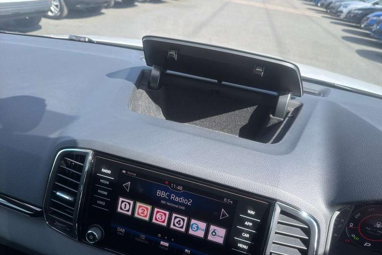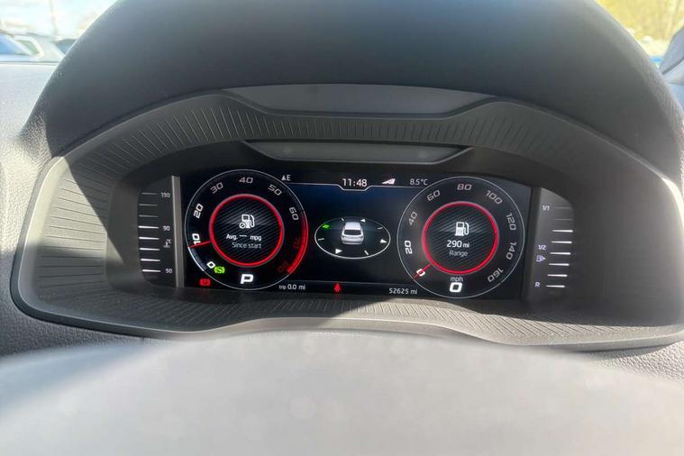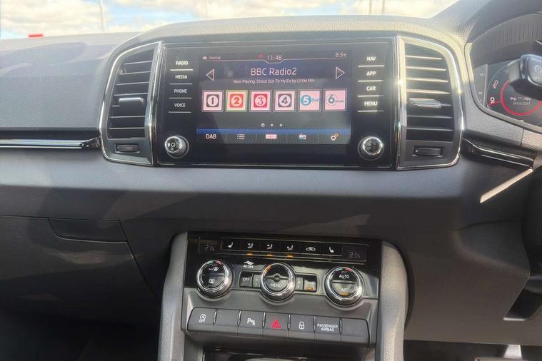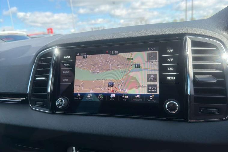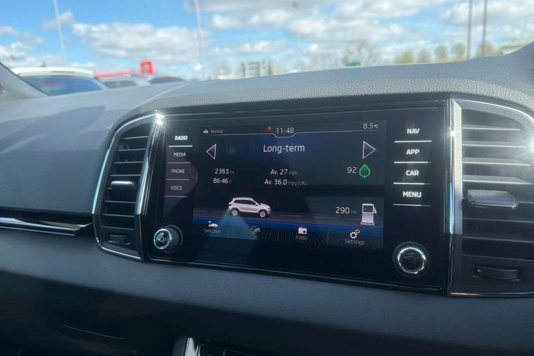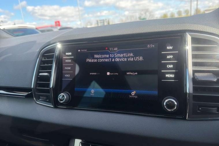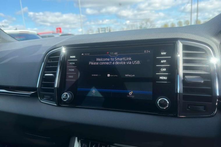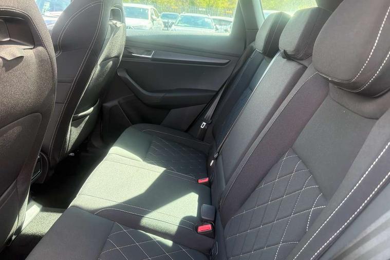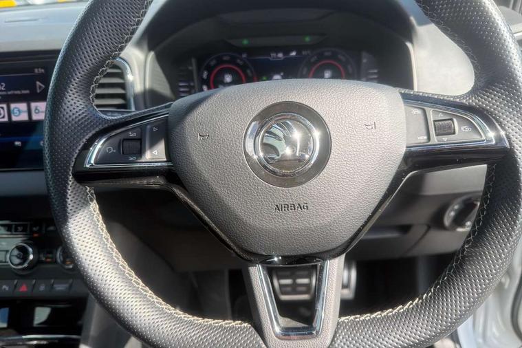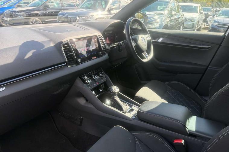Drive mode selection with off road, Driver alert system, Driver fatigue sensor, Driver profile selection, Multifunction colour trip computer, Outside temperature gauge, Rear view camera, Service interval indicator, Start/stop system with regenerative braking, DAB radio with Bluetooth, SD card slot, USB connection, Acoustic glass, Aero front windscreen wipers with intermittent function, Automatic headlight control system, Black roof rails and door mirrors with radiator grille, Body colour door mirrors and handles, Chrome outside aluminium bar around the window, Electric front and rear windows with child proof lock, Electrically adjustable heated folding and auto dimming door mirrors with boarding spots, Front door steps with SportLine logo, Full LED headlights + adaptive front light system + LED daytime running lights and front cornering fog lights, Headlight washers, Heated rear windscreen, LED rear lights with high functionality, Light assistant (coming/leaving home/tunnel light), Panoramic sliding sunroof, Privacy glass, Protective door side sills in body colour, Rear diffuser, Safety reflectors on front doors, Sportline badge on front fender, Sportline decorative inserts with badging, Sports front and rear bumpers, Third brake light, 1.5 litre bottle holders in driver and front passenger door panels, 12V socket in boot, 12v socket in front centre armrest with storage compartment and rear air vents, 2 Folding hooks and nets in boot, 2 Front readings lights for driver and passenger, 3 rear height adjustable headrests, 4 foldable roof handles with rear coat hooks, 4 lashing points on luggage floor, Aluminium pedals, Backrest release, Black roof headlining, Cargo elements in boot, Chrome inner door handles, Driver and passenger seats height adjust, Dual zone climate control, Front seat and rear pockets, Height adjustable front three point seats belts with tensioners, Height/reach adjust steering wheel, Ice scraper, Illuminated and cooled glovebox, Illuminated luggage compartment, Isofix child seat preparation outer rear, Manual lumbar support for front seats, Net programme in boot, Pen holder, Pollen filter, Rear boot cover, Rear reading lights, Rear seats fixed folding and divided 60:40, Removable LED torch in the boot, Retractable parcel shelf attachable to tailgate, Safety vest holder, Storage box in upper central dashboard closed, Storage compartment below the passenger seat, Storage net on centre console passenger side, Sunvisors with illuminated vanity mirrors, Textile floor mats, Umbrella under passenger seat, Welcome animation with sportline logo, LED Interior lighting pack with Skoda welcome logo - Karoq, Airbags - Front side, head, knee and curtain, Automatic door unlocking in case of crash, Automatic fuel cut off in case of crash, Driver airbag, Electronic parking brake with auto hold function, Emergency rear braking signal, ESC including ABS, MSR, ASR, EDS, HBA, DSR, RBS, MKB and traction control, Front assist radar scanning of the space in front of the car with automatic braking, Hill hold control, Passenger airbag with switch-off function, Pedestrian monitor, Seatbelt reminder signalisation and pretensioner for all seats, Three point seatbelts rear, Two tone horn, Tyre pressure display, Tyre pressure monitor, Alarm with interior monitoring, back up horn and tilt sensor with safe function, Electronic engine immobiliser, Keyless entry and keyless start with safe system, Remote central locking with 2 remote folding keys, Chrome framed air vents, 19" Vega anthracite alloy wheels, Anti-theft wheel bolts protection, Storage on wheel cover,