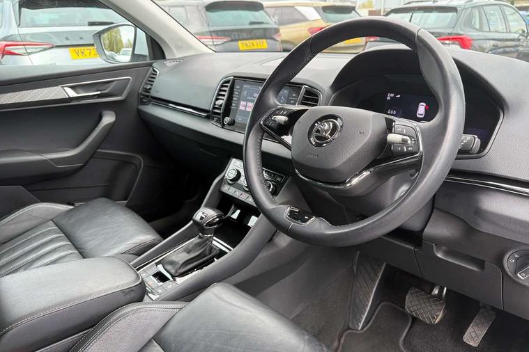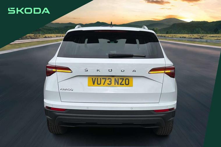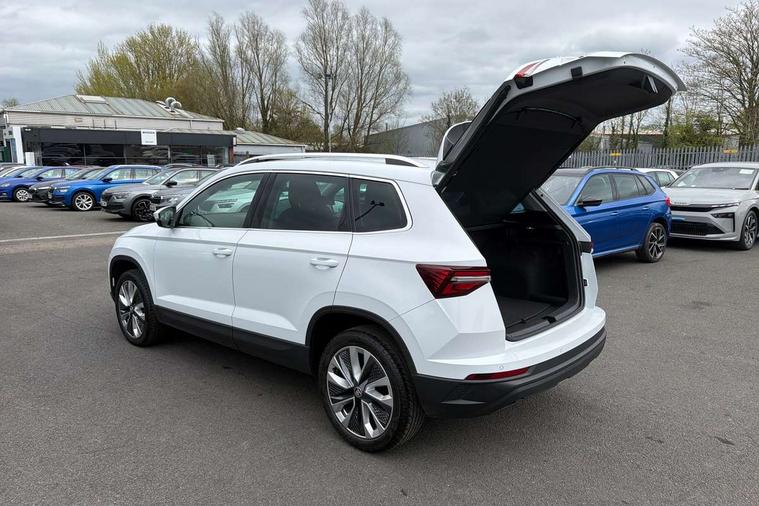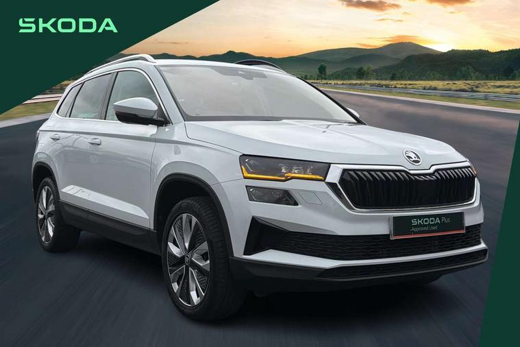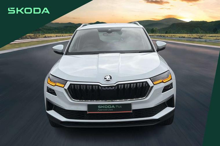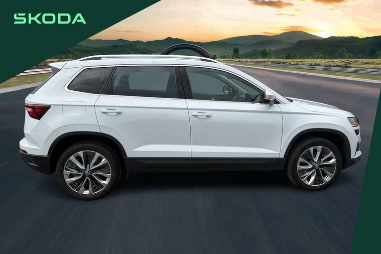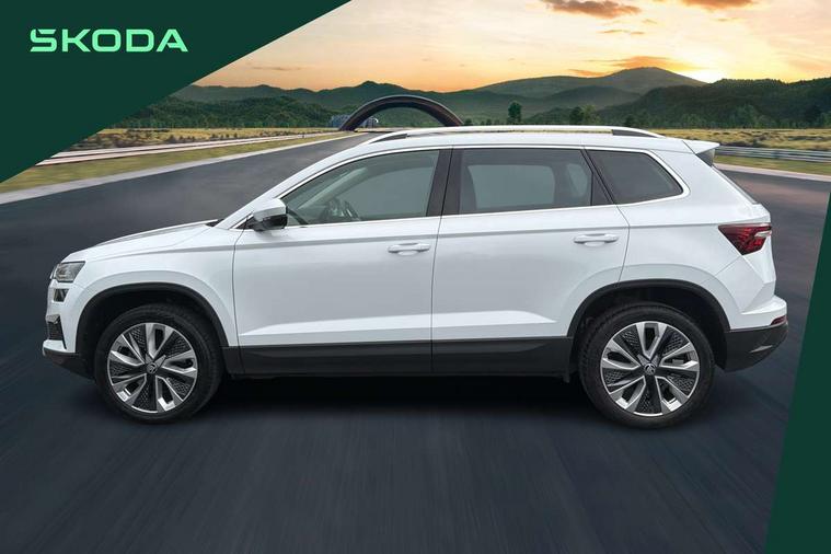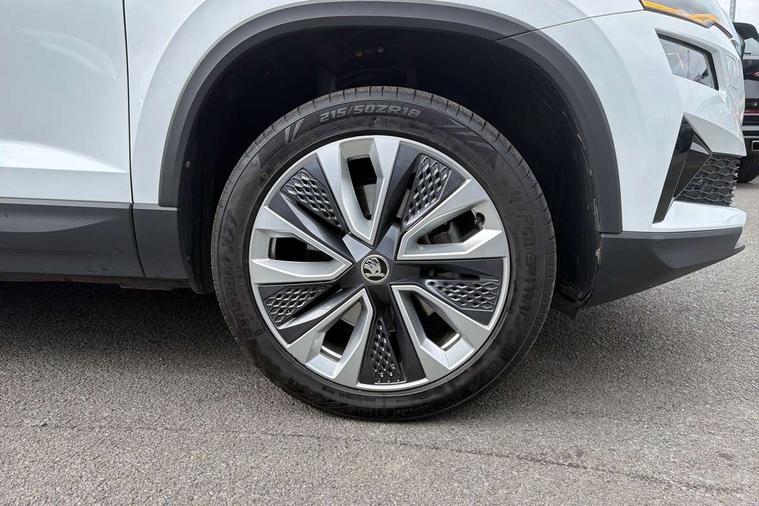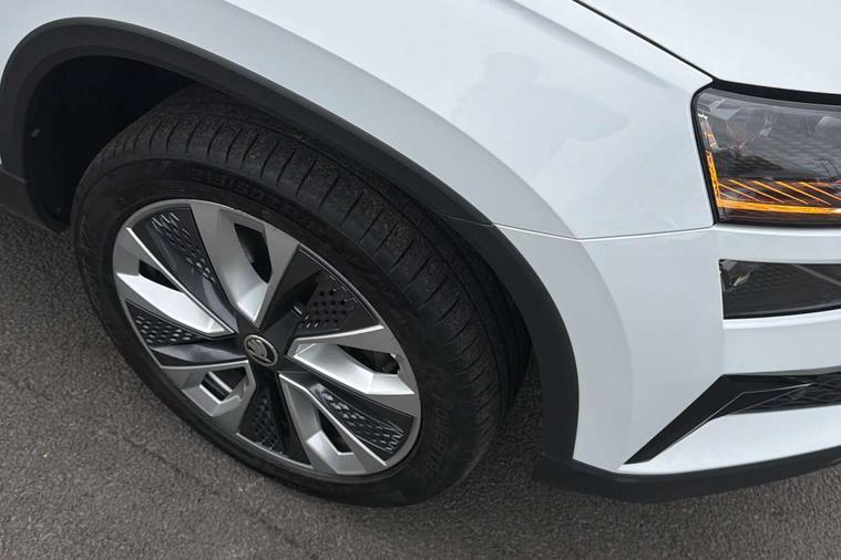 8" Digital display, Care connect, Driver fatigue sensor, Emergency services call system, Outside temperature gauge, Service interval indicator, SmartLink wireless for Apple and wired for Android, Start/stop system with regenerative braking, USB C Port x 2 in front centre console, 8 Speakers, DAB radio with Bluetooth, USB connection, Acoustic glass, Aero front windscreen wipers with intermittent function, Auto dimming rear view mirror with light and rain sensors, Black electric window control buttons, Body colour door mirrors and handles, Dynamic headlight range control with cornering light function, Electric front and rear windows with child proof lock, Heated rear windscreen, LED daytime running lights, LED rear lights with high functionality welcome effect and dynamic indicators, Light assistant (coming/leaving home/tunnel light), Plastic scuff plates, Privacy glass, Rear side wing doors, Rear spoiler, Rear window wiper with washer system and intermittent control, Safety reflectors on front doors, 1.5 litre bottle holders in driver and front passenger door panels, 12V socket in boot, 12v socket in front centre armrest with storage compartment and rear air vents, 2 spoke leather heated multifunction steering wheel with DSG paddles, 2 x Tablet holder, 3 rear height adjustable headrests, 3 seat bench in 2nd row, 4 foldable roof handles with rear coat hooks, Black floor carpet, Chrome inner door handles, Double sided boot floor, Foldable hooks in the boot, Front head restraints, Height adjustable front three point seats belts with tensioners, Height/reach adjust steering wheel, Ice scraper, Illuminated glovebox, Illuminated luggage compartment, Isofix child seat preparation for front passenger seat, Isofix child seat preparation outer rear, Manual lumbar support for front seats, Pen holder, Pollen filter, Rear boot cover, Rear reading lights, Rubbish bin door, Safety vest holder, Single front passenger seat, Storage box in upper central dashboard closed, Sunvisors with illuminated vanity mirrors, Textile floor mats, Ticket holder, VarioFlex seats with standard rear seat release, Boot pack - Karoq, Design Pack - Karoq, Parking pack - Karoq, Automatic door unlocking in case of crash, Automatic fuel cut off in case of crash, Child locks on rear doors, Driver airbag, Electronic parking brake with auto hold function, Emergency rear braking signal, ESC including ABS, MSR, ASR, EDS, HBA, DSR, RBS, MKB and traction control, Front side airbags, Hill hold control, Knee airbags, Passenger airbag with switch-off function, Pedestrian monitor, Seatbelt reminder signalisation and pretensioner for all seats, Three point seatbelts rear, Two tone horn, Tyre pressure display, Tyre pressure monitor, Alarm with interior monitoring, back up horn and tilt sensor with safe function, Electronic engine immobiliser, Keyless entry and start/stop, Remote central locking with 2 remote folding keys, Chrome framed air vents, 18" Miran alloy wheels in black, Anti-theft wheel bolts protection, Tool kit,