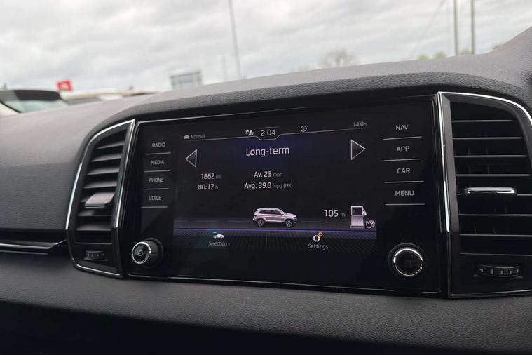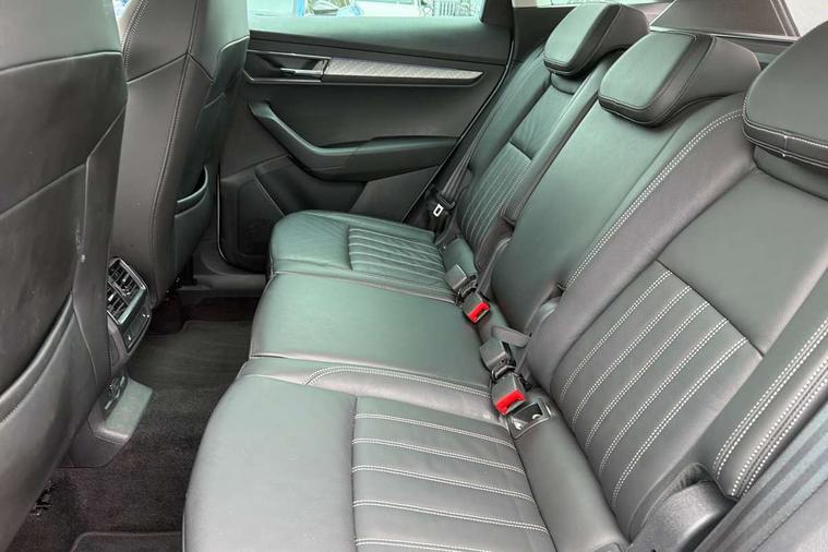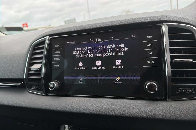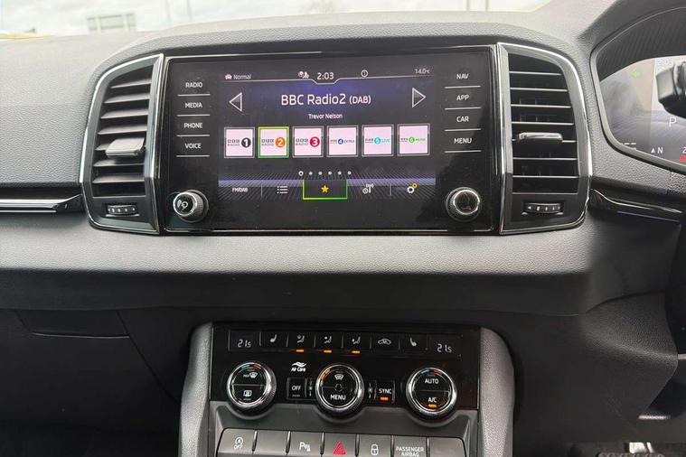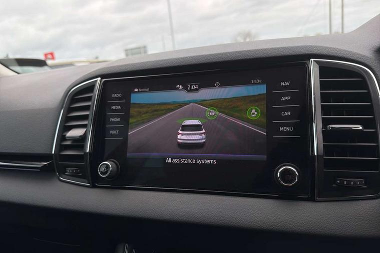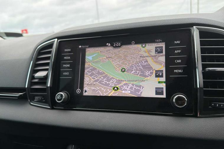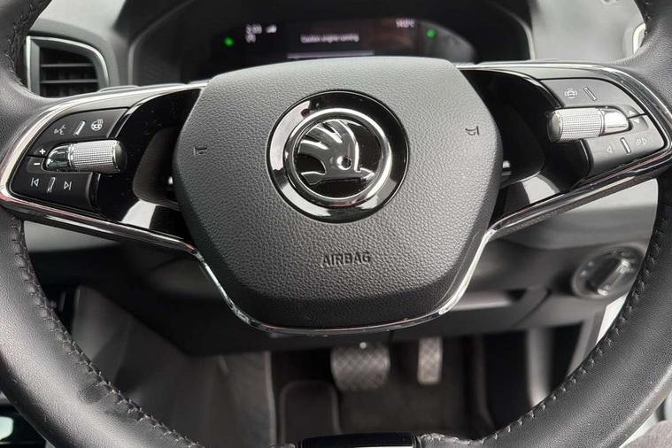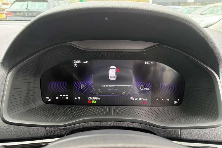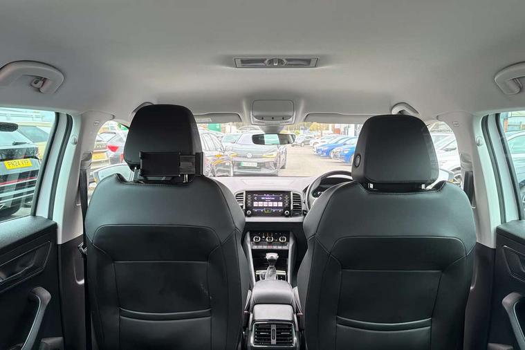 8" Digital display, Care connect, Driver fatigue sensor, Emergency services call system, Outside temperature gauge, Service interval indicator, SmartLink wireless for Apple and wired for Android, Start/stop system with regenerative braking, USB C Port x 2 in front centre console, 8 Speakers, DAB radio with Bluetooth, USB connection, Acoustic glass, Aero front windscreen wipers with intermittent function, Auto dimming rear view mirror with light and rain sensors, Black electric window control buttons, Body colour door mirrors and handles, Dynamic headlight range control with cornering light function, Electric front and rear windows with child proof lock, Heated rear windscreen, LED daytime running lights, LED rear lights with high functionality welcome effect and dynamic indicators, Light assistant (coming/leaving home/tunnel light), Plastic scuff plates, Privacy glass, Rear side wing doors, Rear spoiler, Rear window wiper with washer system and intermittent control, Safety reflectors on front doors, 1.5 litre bottle holders in driver and front passenger door panels, 12V socket in boot, 12v socket in front centre armrest with storage compartment and rear air vents, 2 spoke leather heated multifunction steering wheel with DSG paddles, 2 x Tablet holder, 3 rear height adjustable headrests, 3 seat bench in 2nd row, 4 foldable roof handles with rear coat hooks, Black floor carpet, Chrome inner door handles, Double sided boot floor, Foldable hooks in the boot, Front head restraints, Height adjustable front three point seats belts with tensioners, Height/reach adjust steering wheel, Ice scraper, Illuminated glovebox, Illuminated luggage compartment, Isofix child seat preparation for front passenger seat, Isofix child seat preparation outer rear, Manual lumbar support for front seats, Pen holder, Pollen filter, Rear boot cover, Rear reading lights, Rubbish bin door, Safety vest holder, Single front passenger seat, Storage box in upper central dashboard closed, Sunvisors with illuminated vanity mirrors, Textile floor mats, Ticket holder, VarioFlex seats with standard rear seat release, Boot pack - Karoq, Design Pack - Karoq, Parking pack - Karoq, Automatic door unlocking in case of crash, Automatic fuel cut off in case of crash, Child locks on rear doors, Driver airbag, Electronic parking brake with auto hold function, Emergency rear braking signal, ESC including ABS, MSR, ASR, EDS, HBA, DSR, RBS, MKB and traction control, Front side airbags, Hill hold control, Knee airbags, Passenger airbag with switch-off function, Pedestrian monitor, Seatbelt reminder signalisation and pretensioner for all seats, Three point seatbelts rear, Two tone horn, Tyre pressure display, Tyre pressure monitor, Alarm with interior monitoring, back up horn and tilt sensor with safe function, Electronic engine immobiliser, Keyless entry and start/stop, Remote central locking with 2 remote folding keys, Chrome framed air vents, 18" Miran alloy wheels in black, Anti-theft wheel bolts protection, Tool kit,