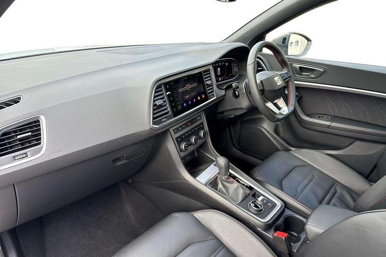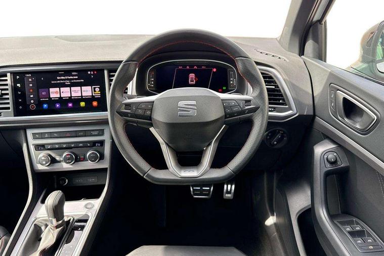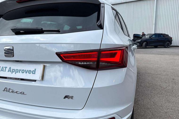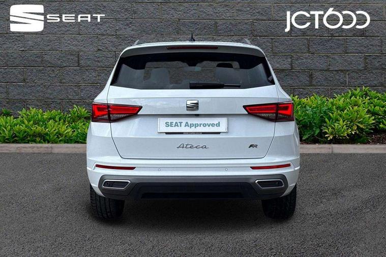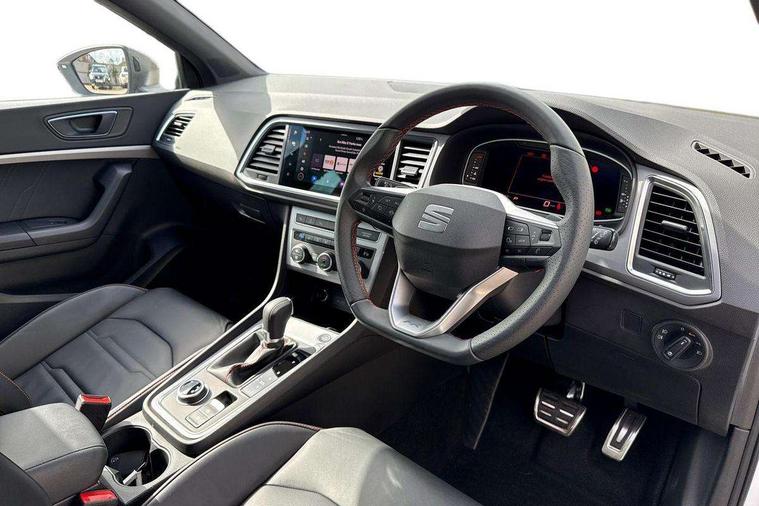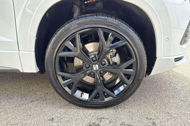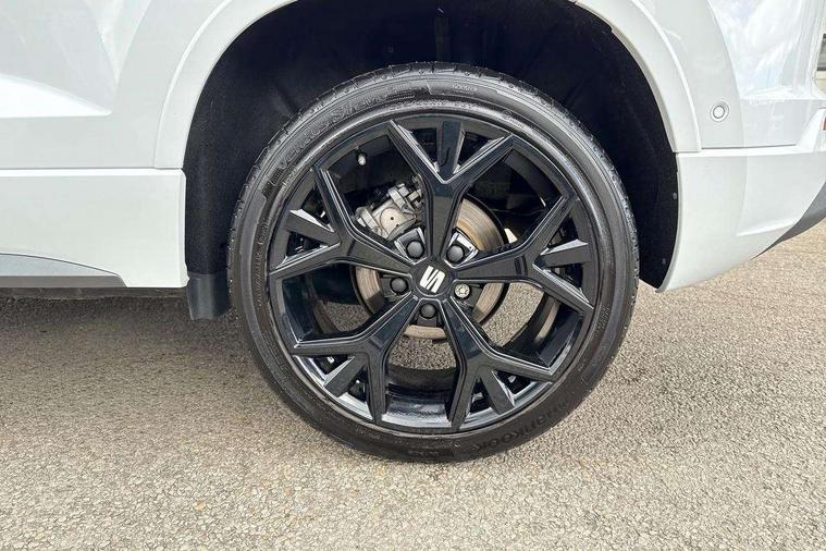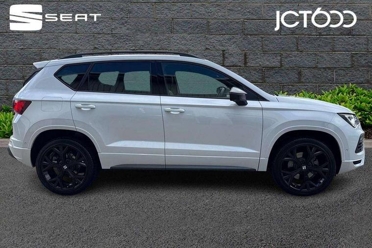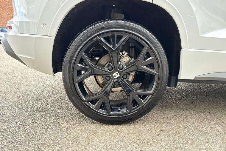 10" Digital cockpit, Bluetooth audio streaming with handsfree system, E-call, Electric tailgate with virtual pedal, Outside temperature gauge, Progressive power assisted steering, SEAT drive profile with driving experience button - Normal, Sport, Eco and Individual mode, gearshift, steering and throttle response, Self parking functionality (includes front and rear parking sensors), Speed limiter, Start/stop system, Top view camera with rear view camera, Trip computer, wired and wireless full link smartphone integration, Wireless phone charger, Steering wheel mounted audio/phone controls, Black roof rails, Black side window trim, Body colour bumpers, Body coloured wheel arch surrounds, Chrome front grille frame, Dark tinted rear windows, Daytime running lights, Door mirrors with welcome light silhouette, Dynamic headlight range control with self adjusting whilst driving, Electric adjustable/heated/folding door mirrors, Front and rear electric windows, Illuminated aluminium front door sill, LED 3rd brake light, LED headlamps with lens and LED front fog lamps with cornering function, LED rear tail lights with dynamic indicators, Rear exhaust tailpipe, Rear fog lights, Rear side wing doors, Rear spoiler, Rear wash/wipe, Variable front intermittent wipers, 12V socket in front, 3 seat bench in 2nd row, 60/40 split folding rear seat, Aluminium pedals, Black greenhouse interior roof, Dual zone climate control, Electric adjustable driver seat with memory function, Front and rear head restraints, Front centre armrest, Front seat back storage pockets, Heated front seats, Height adjustable passenger seats with lumbar adjustment, ISOFIX points in outer rear seats with top tether anchorage points, Leather sports steering wheel and gear knob, Leather upholstery with front comfort seats, Rear armrest and easy back seat release mechanism from boot, Single front passenger seat, Steering wheel mounted gearshift paddles, Convenience pack - Ateca, Interior lighting pack - Ateca, Navigation system pack with DAB - Ateca, Safety and driving pack (L) - Ateca, Safety and driving pack with attention and drowsiness assist - Ateca, 3x3 point rear seatbelts, ABS, Traction control system (TCS), Electronic stability control (ESC) and Electronic differential lock system (XDS), Airbags - Driver and front passenger airbag with deactivation, front side, two curtain and driver's knee airbags, Electric parking brake with auto hold function, Front and rear seatbelt reminder, Hill hold control, Manual rear child locks, Single tone horn, Tyre pressure monitoring system, Alarm, Keyless entry, Locking wheel bolts, Remote central locking, Chrome interior detailing, 19" Exclusive alloy whelels 36/10 in glossy black, Tool kit,
