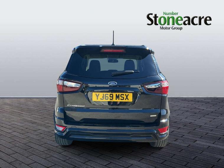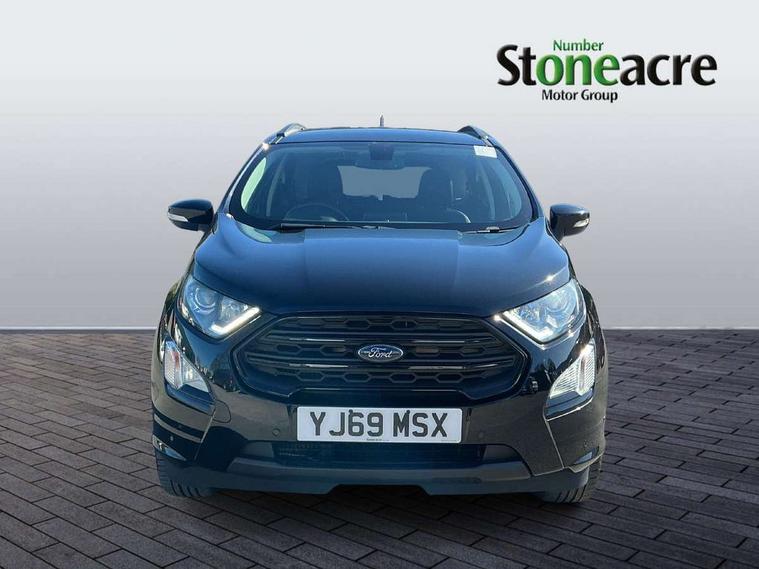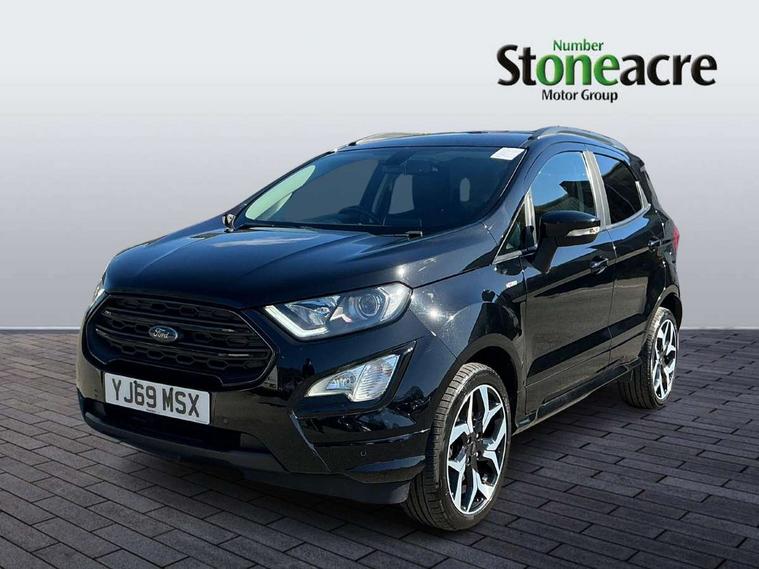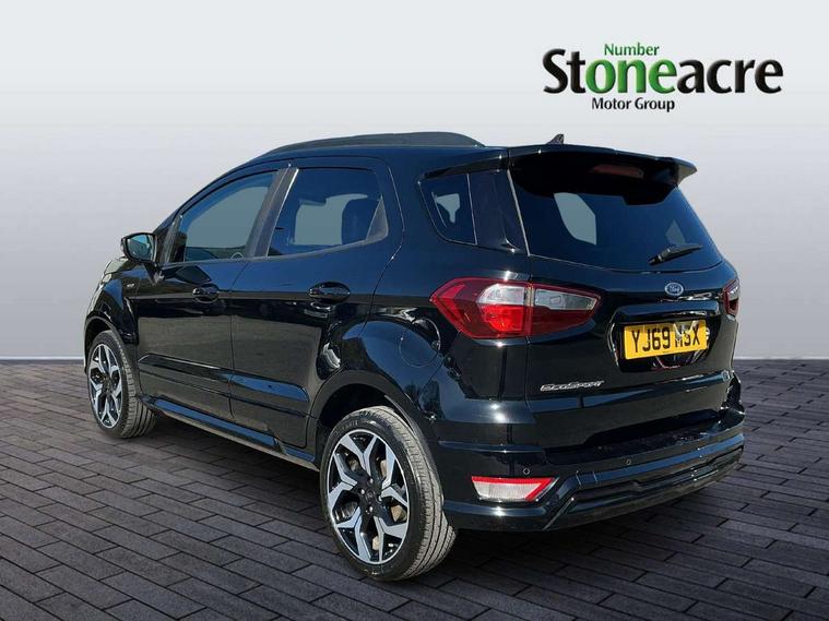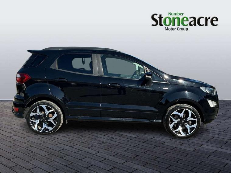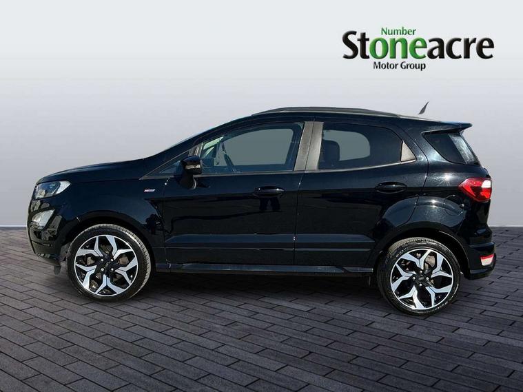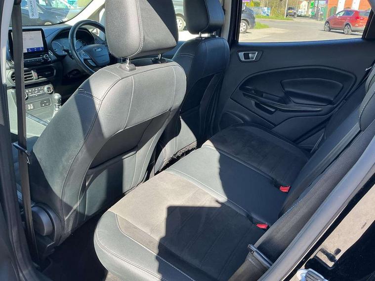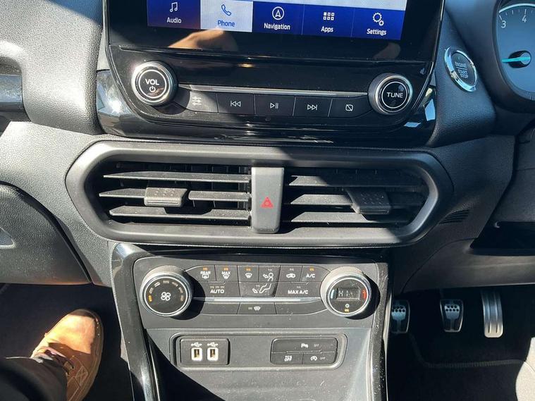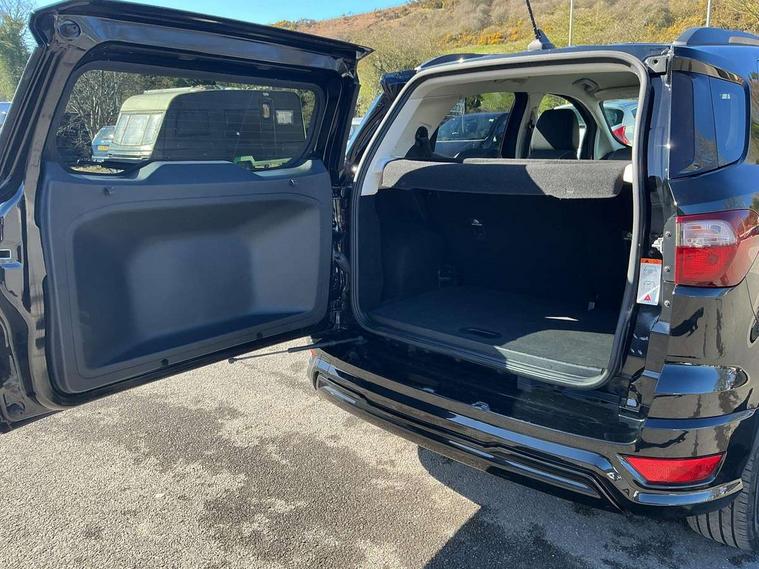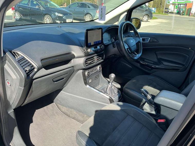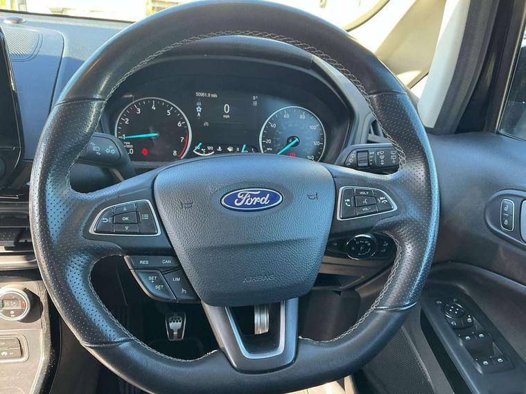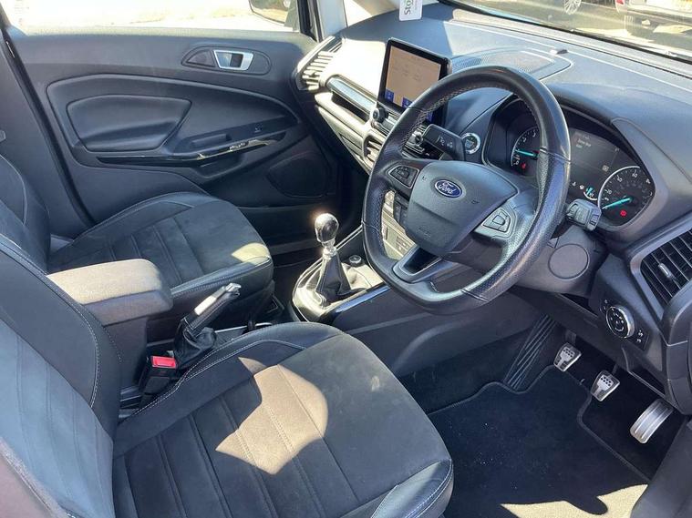Rear view camera pack - Ecosport, Tyre inflation kit, Immobiliser, MyKey system, Remote central locking, Thatcham 1 volume sensing alarm, Steering wheel mounted audio controls, 3x3 point rear seatbelts, ABS, Child locks on rear doors, Curtain airbags, Driver airbag, Drivers knee airbag, Electronic Stability Programme with hill launch assist, Emergency brake assist, Front passenger airbag deactivation, Front side airbags, Passenger airbag, Seatbelt reminder for driver and front passenger, Traction control, Tyre pressure monitoring system, 'Quickclear' heated windscreen/heated washer jets, Auto dimming rear view mirror, Automatic headlights, Black roof rails, Body colour door handles, Body coloured bumpers, Electrically adjustable and heated door mirrors, Front door threshold plates with ST-Line logo, Front fog lights, Headlight levelling control, Large rear spoiler, Power foldable door mirrors with puddle lights, Power front and rear windows with global opening/closing, Rain sensing front wipers, Rear wiper, ST-Line body styling kit, ST-Line front grille, 12V socket in front and rear, 60/40 split rear seats, 7 shade adjustable ambient lighting, Centre console with sliding front armrest, Cooled glovebox, Courtesy lights with map reading light, Driver seat height/lumbar adjust, Driver's side glovebox, Driver/passenger sunvisors and lidded vanity mirrors, EATC - Electronic Auto Temperature control, Folding grab handles, Front head restraints, Front seat back map pockets, Front/rear floor mats, Illuminated glovebox, Illuminated luggage compartment, Isofix system on outer rear seats, Leather steering wheel/gearshift/handbrake lever with red stitching, Luggage compartment carpet, Overhead console with sunglasses holder, Partial leather upholstery, Rake adjustable rear seats, Reach + rake adjustable steering column, Rear headrests, Stainless steel sports pedals, Steering wheel with chrome inserts, Storage drawers under front seats, Tie down hooks, Variable boot floor, Cruise control, Easy fuel capless refuelling system, PAS, SYNC 3 nav system with DAB radio, 8" screen, voice control, emergency assistance, Apple car play/Android auto, 2x USB, Ford pass connect, Trip computer, Sports suspension,