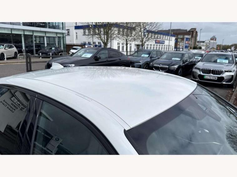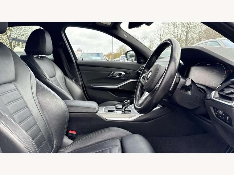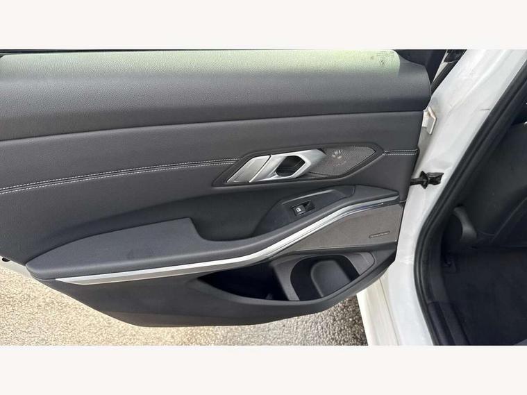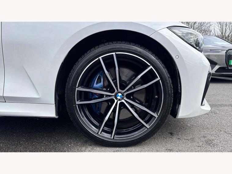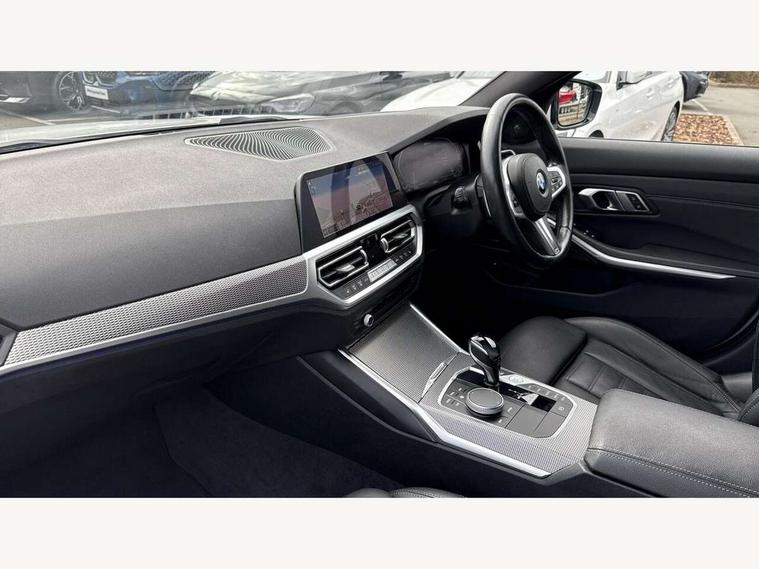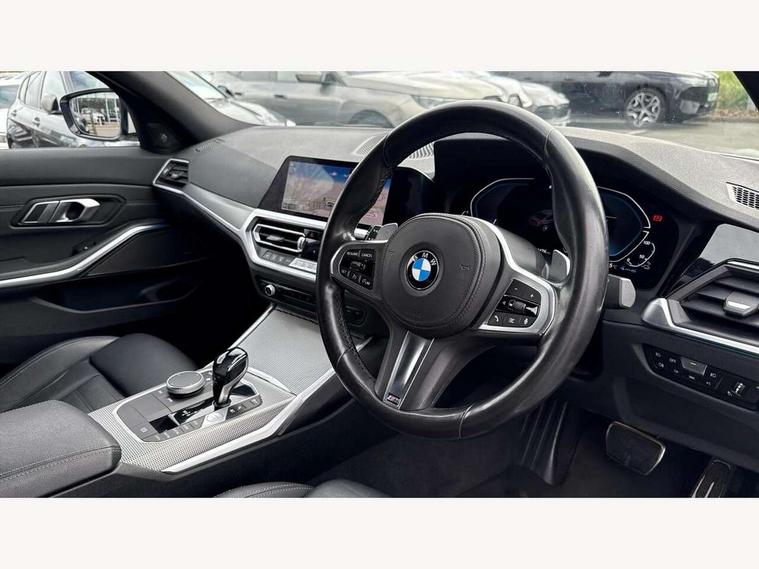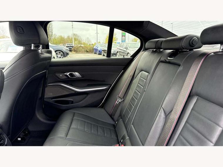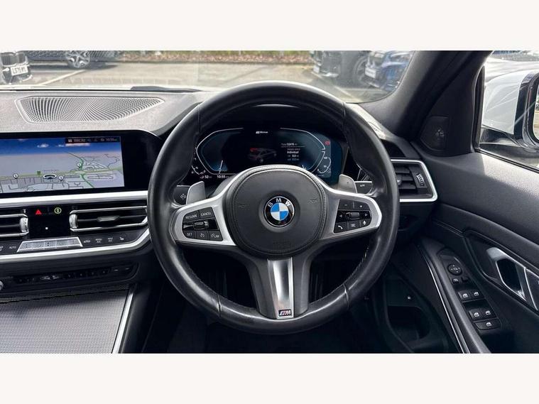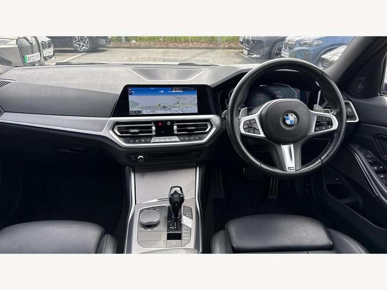 Active guard plus, Attentiveness assist, Auto start-stop, Bluetooth hands free facility with USB audio interface with audio streaming, BMW Live Cockpit Professional Nav with 12.3" instrument display + 10.25" display, Intelligent Voice Assist, BMW OS 7, HDD, 2USB, 4G LTE connect, BMW service history, BMW Teleservices, Brake pad wear indicator in front and rear, Check Control warning system for monitoring of lights and door/luggage compartment open warning, Condition based service, Cruise control with brake function + speed limiter, Electric power steering with Servotronic steering optimised at all speed ranges, iDrive controller on centre console, Instrument cluster with speedometer with mph readout, tachometer, fuel gauge and oil temperature gauge, Integrated owners handbook, Oil sensor for level and grade, warning by check control system, On board computer - average speed+fuel consumption, service interval, clock/date, odometer/trip meter, outside temperature display and ice warning, Optimum shift indicator, Personal Profile - automatic lock when driving away selectable, Balanced 50/50 weight distribution, Battery cut-out switch, Charging cable - Mode 2, Drive performance control - ECO PRO, comfort and sport modes, Petrol Particulate Filter, Stroke dependent dampers, DAB tuner, Electronic service booklet, Stereo speaker system with 2 mid range speakers in the front door trims and rear parcel shelf + 2 central bass speakers underneath the front seats, Acoustic glazing, Active airstream chrome frame kidney grille with 8 high gloss black vertical slats, Automatic headlight beam throw control with load dependent regulating reaction, dynamic compensation of braking dive and acceleration squat, Black roof mouldings, Body colour door handles, Body colour front and rear bumpers, Body colour fuel filler flap, Body colour mirror caps with bottom segment in matt black, Dynamic brake lights, Electric windows - front and rear, with open/close fingertip control, anti-trap facility and comfort closing, Exhaust tailpipe - split left and right, Exterior mirrors - electrically folding with anti-dazzle, Fading support, Front and rear bumper system with replaceable deformation elements, Front black door sill finishers with BMW designation, Green tinted heat protection glazing, High gloss shadow line exterior trim, Interior rear view electrochromatic mirror with automatic anti dazzle function, LED daytime running lights, LED front fog lights, Lightweight engineering, M designation on front side panels, left and right, Matt black exterior B pillar, Model designation on right side of tailgate, Rain sensor with automatic headlight activation, Shark fin antenna, Two part LED tailights in L-shape with components in smoked glass, brake light, LED turn indicator and rear fog light, Visible VIN plate, Welcome lights in interior and door handle area, Windscreen wipers with integrated washing jets, 12V power socket in front storage compartment, 2 front cupholder in centre console with clamping elements and matt black inlay, 3 rear seats with non folding headrests with 3 point seat belts, 3 zone automatic air conditioning, 4 pieces lashing eyelets in luggage compartment, 40:20:40 split folding rear seat with loading system, Ambient lighting with welcome carpet light, Anthracite headlining, Armrest integrated in front and rear door trim + front centre console armrest, Backrest width adjustment, Centred top Luggage compartment lights, Four grab handles integrated in roof lining, Front and rear door exit lighting (left / right), Front and rear door pockets, Front and rear reading lights, Front and rear velour floor mats, Front head restraints, Front sport seats, Heated front seats, Height adjustable mechanically and infinitely variable steering column, Illuminated armrest storage compartment, Illuminated glove compartment with separate small compartment, Interior lighting - front centre over interior mirror with soft light, rear centre and front and rear footwell lighting, M sport leather steering wheel, Make-up mirror lights, Rear centre armrest with 2 cupholders, Rear centre console with storage compartment and ventilation grille, Sunvisors with vanity mirrors and ticket pocket, Toolkit located in luggage compartment, Connected pack professional - 3 Series Saloon/Touring, M sport exterior styling pack - 3 Series Saloon/Touring, 2 tone horn, BMW emergency call, Brake energy regeneration, Braking pre-tensioning, Child proof locking system in rear door, Child seat ISOFIX attachment rear outer seats, Coasting in idle in ECO PRO mode, Crash sensor activating of airbags, Unlocking doors, hazard warning lights, fuel cut off, interior lighting+activation of safety battery terminal clamp, Driver and front passenger side airbags, integrated in the door side seat backrest bolsters for all seat variants, Driver/Front Passenger airbags, Dry braking, Dynamic brake control, Dynamic stability control + (DSC+) - Anti-lock Braking System (ABS) with brake assist and cornering brake control + Automatic Stability Control (ASC), Dynamic Traction Control - DTC, Electromechanical parking brake including automatic hold function and automatic release of the parking brake when pulling away, Electronic differential lock control (EDLC), Front passenger manual airbag deactivation, Head airbags for all 4 outer seats, Hill start assist, Seat belt security check for driver and front passenger, Side impact protection, Three 3 point seat belts on all seats including front belt stopper, pyrotechnic belt tensioners and belt force limiters, Tyre pressure monitoring with three level warning strategy, Ventilated front and rear disc brakes, Warning triangle and first aid kit, Alarm system (Thatcham 1) with remote control and electronic engine immobiliser, Central locking switch for all doors, fuel filler cap and luggage compartment, Remote control with integrated key one button open/close vehicle and windows, sole opening of the luggage compartment lid and pa
