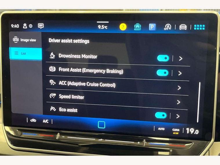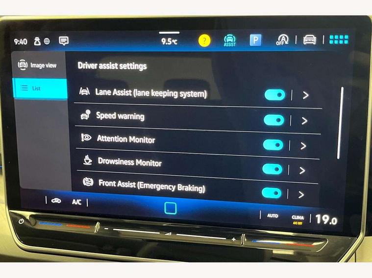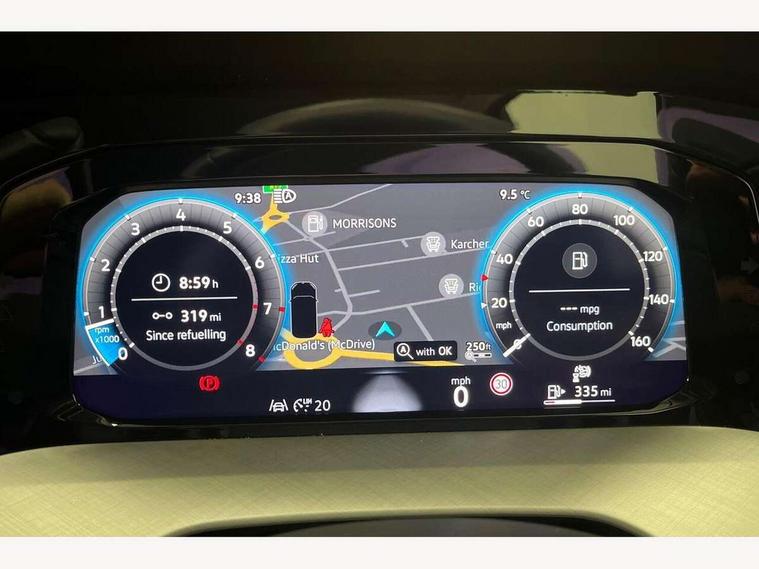 Activated carbon canister, Adaptive cruise control (ACC) with speed limiter and front assist (reacting to vehicles pedestrians and cyclists), Advanced driver attention and drowsiness monitor, Driver alert system, Dynamic road sign display, E-Sim card for online connectivity, eCall emergency call system, Multi-color Digital cockpit pro, selection of different info profile possible, Multifunction camera for distance control, Navigation system, Oncoming vehicle braking when turning including swerve support, Power assisted speed sensitive steering, Preparation for light assist system, Speedo, rev counter, electronic odometer, trip, service interval display, exterior temperature and fuel gauge, Voice assistant and voice enhancer with chat GPT, Warning signal and warning light for front and rear seatbelts not fastened, We connect plus preparation, We connect preparation, Wireless app connect, Petrol Particulate Filter, Start-stop system with battery regeneration (recuperation - energy recovery during braking), XDS electronic differential lock for improved traction and handling, 2 USB C ports in front, 2 USB charging sockets on the centre console in the rear charging capacity upto 45W, Comfort telephony + wireless charging, without wireless aerial connection, Digital radio reception (DAB), Diversity antenna for FM reception, Infotainment system with 12.9" display, 3rd brake light, Auto headlights, Automatic headlamp activation with Coming home and Leaving home feature, Body colour door handles, Body colour door mirrors, Chrome plated radiator grille inserts and light switch surrounds, Dynamic headlight range control, Exterior mirrors convex on the left and aspherical on the right, Front and rear electric windows, Heat insulating windshield made of laminated glass, LED daytime running lights, LED rear combination lights, Rear exhaust tailpipe, Rear fog light on one side and reversing lights on both sides, Rear side wing doors, Rear tinted glass 65% light absorbing from B pillar backwards, Rear windscreen washer and wiper with interval delay, Remote electrically foldable door mirrors, puddle lights and reverse activated passenger's door mirror, Standard bumpers, Welcome light with surround lighting, 12V socket in front centre console, 12V socket in luggage compartment, 3 rear head restraints, 3 seat bench in 2nd row, Front centre armrest, Front head restraints, Front passenger seat, ISOFIX anchors for child seats on outer rear bench seats and on front passanger seat compatible for i-Size, Leather gearshift handle, Luggage compartment lighting, Rear cupholder and loadthough, Soul black instrument panel, Split folding backrest with centre armrest and unsplit rear seat bench, Standard pedal cluster, Storm grey roof lining, Sun visors with illuminated vanity mirrors, 3 point height adj front seatbelts + pretensioners, 3 rear three point seatbelts, ABS, Autonomous emergency braking front assist with pedestrian and cyclist monitoring, Child locks on rear doors, Driver and front passenger airbag with front passenger airbag deactivation, Electronic parking brake with auto hold, ESC (Electronic Stability Control), Extended pedestrian protection measures, Rear disc brakes, Two tone horn, Tyre pressure monitoring system, Volkswagen roadside assistance, Anti theft wheel bolts, Preparation for alcohol interlock, Nature cross brushed decorative inserts for dashboard and front door panels and side trim,