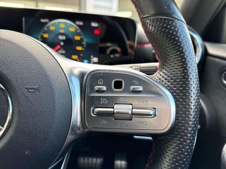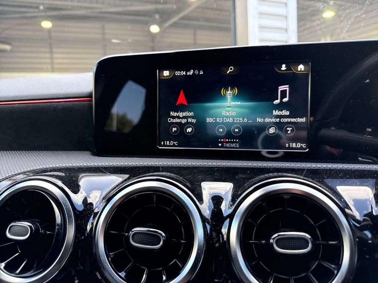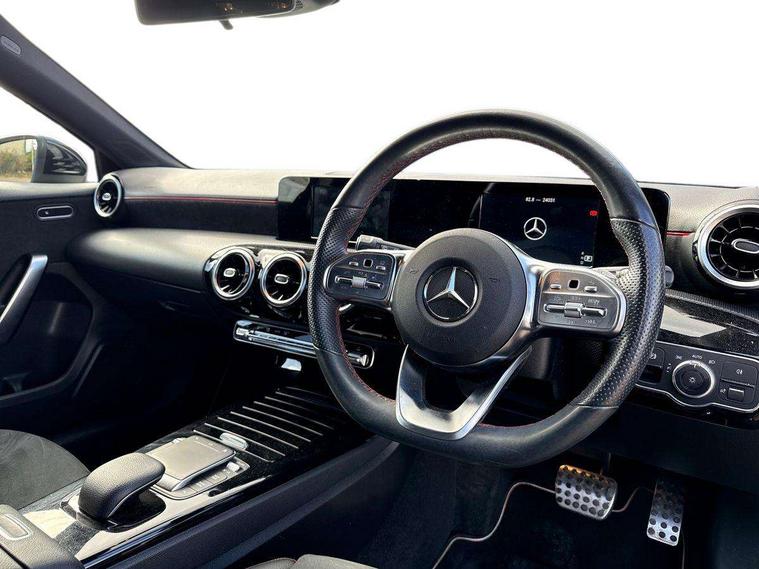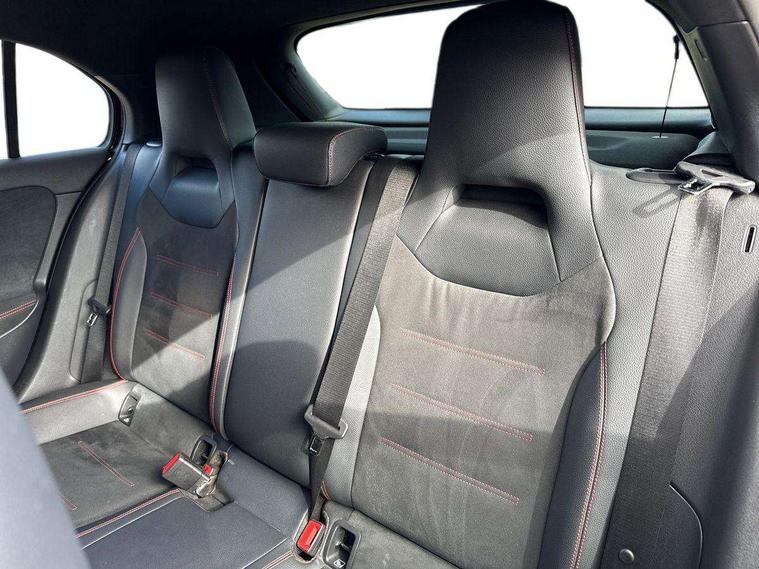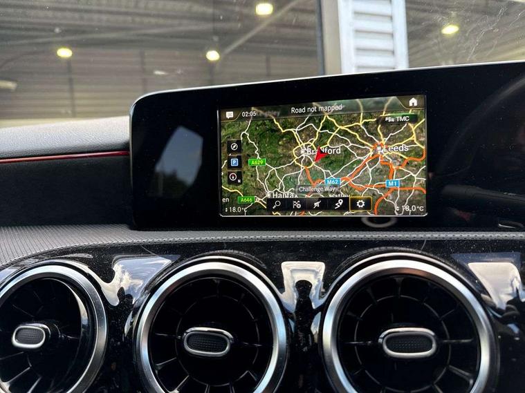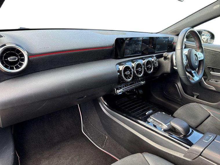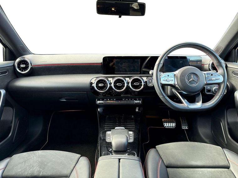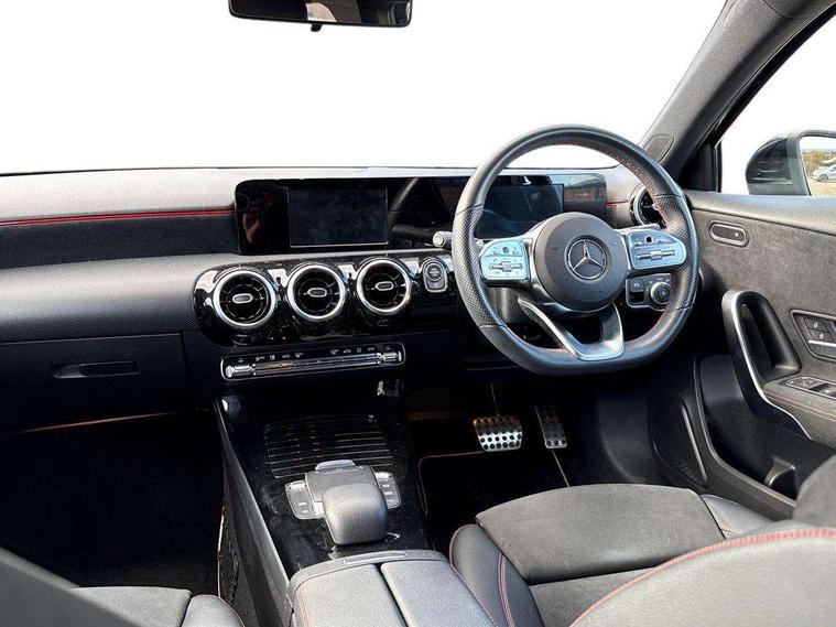 180 degree rear view camera with parking guidelines, 7" colour screen in instrument panel, 7" touchscreen media display, Active lane keep assist, Attention assist, Brake pad wear indicator warning light, Car wash mode, Cruise control + speed limiter, Direct steering, Dual bluetooth interfaces, DYNAMIC SELECT with a choice of driving modes (ECO, Comfort, Sport and Individual), ECO start/stop function, Fluid level warning indicator for fuel, oil, coolant and washer fluid, Hard-disk navigation, Hey Mercedes Voice activation, Lamp failure indicator, Mercedes me connect including emergency call system, accident recovery, breakdown and maintenance management, Outside temperature gauge, Owners manual in English, Pre-installation for private car sharing, Pre-installation for Vehicle Monitoring, Pre-installation for Vehicle Setup, Preinstallation for Mercedes Benz link, Service indicator (ASSYST), Speed sensitive power steering, Trip computer, Lowered comfort suspension, Rear axle torsion beam, 2 USB ports (type C) in rear stowage compartment and one in front of center console, 6 speakers, DAB Digital radio, MBUX multimedia system with DAB digital radio and touchpad including satellite navigation, Mercedes-Benz sound system - 100W, 4 Electric Front and Rear windows, Adaptive brake lights, AMG bodystyling - Front apron with splitter in chrome, rear apron with chrome trim and chrome visible trim elements in tailpipe, Black weather strip, Body colour bumpers, Body colour door handles, Body colour side skirt, Body coloured door mirrors, Chrome beltline trim, Diamond radiator grille with chrome pins and silver louvre + chrome insert, Electric adjustable and heated door mirrors with integrated LED side indicators, Exhaust system - Twin visible tailpipes in polished stainless steel, Headlamp assist automatic headlamp activation, Heated glass rear windscreen + timer control, LED high performance headlamps with integrated LED daytime running lights, LED tail lamp, LED third brake light, Privacy glass, Radio aerial, Rain sensing windscreen wipers with two sensitivity settings, Rear fog lights, Rear wiper, Window line trim strip in chrome, 3 Spoke flat bottom leather multi function steering wheel with perforated leather in grip area, 40:20:40 split folding rear seats, Artico man-made leather/Microfibre Dinamica upholstery with red contrast stitching, Auto Mercedes-Benz child seat recognition sensor, Black air vents with surround in silver chrome, Black roof lining, Brushed stainless steel sports pedals with rubber studs, Controller on centre console with chrome surround, Floor mats with stitched edging and AMG lettering, Front centre armrest with storage compartment, Front door sills with Mercedes Benz lettering, Front seat backs luggage nets, Front seat cushion length adjustment, Galvanished gear shift paddles on steering wheel, Heated front seats, Height/reach adjustable steering column, Interior mirror with reading lamps in black and frameless, Manual height adjustable front seats, Rear head restraints, Seat occupancy sensor for front passenger seat, Sports seats with integrated headrests, Stowage compartment in centre console with retractable cover, Sunvisors with illuminated vanity mirrors, Touchpad on center console, Twin front cupholders, Two zone thermotronic luxury automatic climate control, Light and sight pack - A Class, Seat comfort pack - A Class, 3 rear 3 point seatbelts, ABS with Brake Assist, Active bonnet, Active brake assist includes forward collision warning system with autonomous braking, Adaptive brake assist with hold function and hill start assist, Childproof locks manually operated for rear doors and electrically operated for rear power windows, Crash responsive emergency lighting, Driver and passenger head and side airbags, Drivers knee airbag, Dual stage driver/passenger airbags, Electronic parking brake, ESP curve dynamic assist, ESP with ASR, Front and rear seatbelt reminder, Front brake callipers with Mercedes Benz lettering, ISOFIX and top tether child seat fixing points in two outer rear seats, Tyre pressure monitoring system, Warning triangle and first aid kit, Window airbags, Alarm system/interior protection/immobiliser, Keyless Go, Remote central locking and crash sensor with emergency opening function, Urban guard vehicle protection system with immobiliser and interior protection, Black seatbelts, Dinamica microfibre trim in black, 18" AMG 5 twin spoke light alloy wheels in titanium grey with highsheen finish, Summer tyres, Tirefit sealant kit,