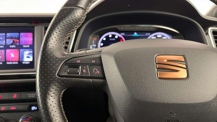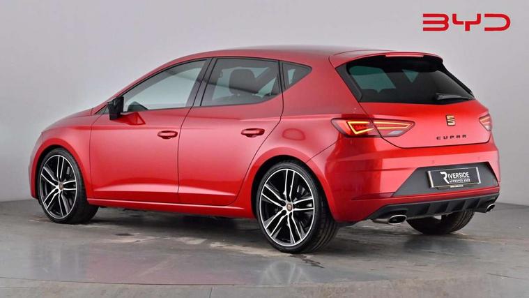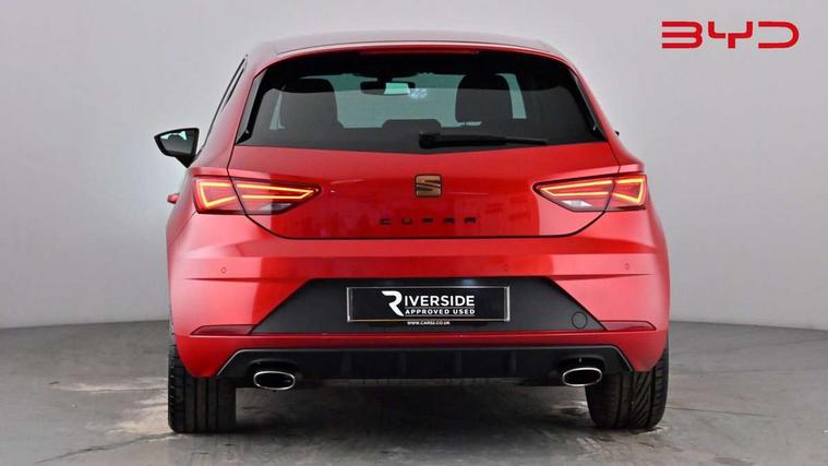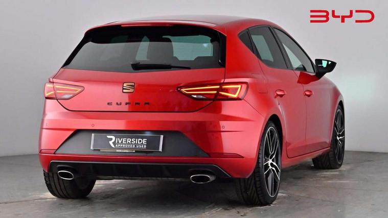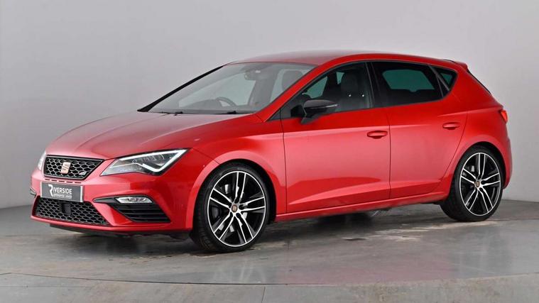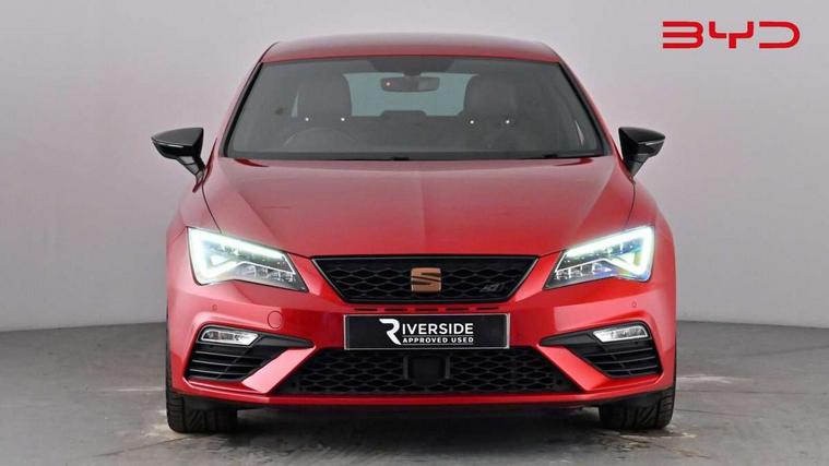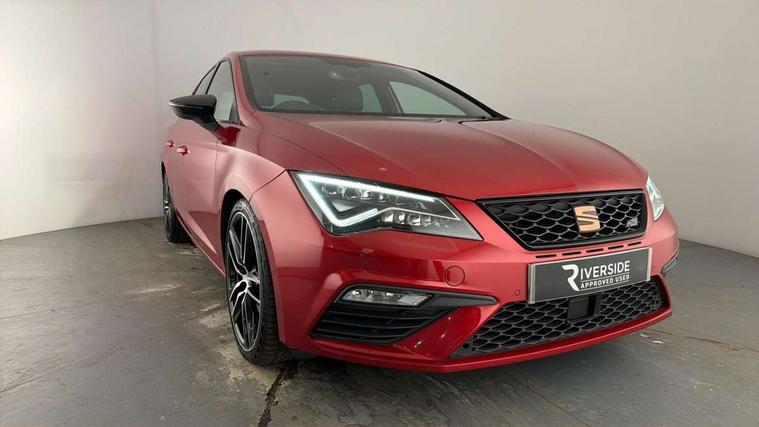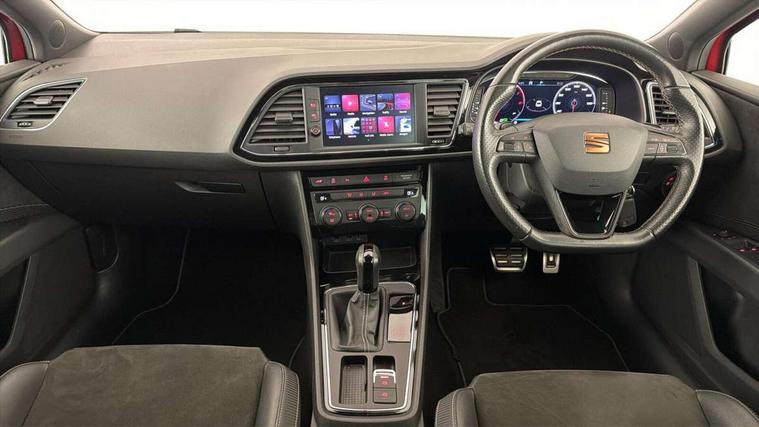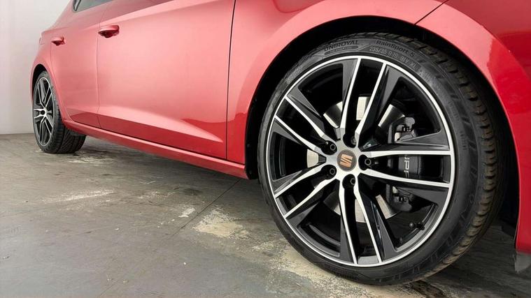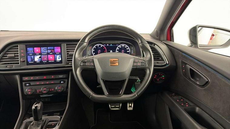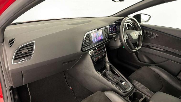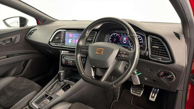 CUPRA performance interface, Digital cockpit, Electro-mechanical progressive power assisted steering, Front and rear parking sensors, Front assist with pedestrian protection, Full Link Smartphone Integration with Mirror Link, Apple Car Play, Google Android Auto with USB Type C cable for Apple and Android compatibility, Media system plus with 8" display, 4 USB, 8 speakers, CD, voice control, DAB, bluetooth and handsfree, steering wheel mounted audio and phone control, Navigation system 3D map display, high resolution colour driver display, two SD card slots, RPM, trip computer, outside temp gauge, instrument light brightness, low fuel warning light, lights on reminder, gearshift indicator, SEAT drive profile CUPRA with 4 mode (Cupra/Normal/Sport/Individual), throttle response, sound actuator and gearshift, SEAT logo boot release, Service interval indicator, Dynamic chassis control, Lowered sports suspension, Auxiliary input socket, SEAT USB media cable, Black front grille, Body colour door handles, Body coloured bumpers, Dark tinted rear windows, Electric folding door mirrors, Electric front/rear windows, Electrically adjustable and heated door mirrors, Exclusive Cupra front and rear bumpers, Full LED headlights with LED day time running lights + LED rear tail lights + LED licence plate lights and LED front and rear fog lights, Gloss black exterior mirrors with integrated LED indicators, Gloss black front grille frame, High gloss black finish B and C pillars, Illuminated aluminium front door sill with CUPRA logo, Rear wash/wipe, Visible dual exhaust pipes, 12v power point in centre console, 60/40 split folding rear seat with armrest, Additional heating and ventilation outlet in rear of centre console, Aluminium pedals, Black interior roof, Boot storage net, Cargo rings in boot, Driver and passenger seat height adjust, Driver and passenger sun visor, covered and illuminated mirror, driver sun visor with card holder, Driver seat lumbar adjustment, Dual zone climate control, Dust/pollen filter, Flat bottomed perforated leather steering wheel with white stitching and CUPRA logo and leather gear knob, Front and rear head restraints, Front centre armrest with storage compartment, Front cupholders x 2, Front passenger seat lumbar adjustment, Front seatback storage pockets, Front sport seats in microsuede, Front/rear floor mats, Height adjustable front and rear headrests and third rear headrest, Height/reach adjust steering wheel, High centre console with integrated box & cup holder, rear air outlet, with armrest in front seats, Interior copper and black detailing, ISOFIX points in outer rear seats with top tether anchorage points, Luggage tie-down hooks, Multi-colour ambient interior lighting, Steering wheel gearshift paddles, Storage box under drivers and passenger seat, Convenience pack+ - Leon, 3 point seatbelts on all rear seats, ABS, traction control system and front differential lock system, Child proof door locks, Driver and front passenger airbags with front passenger airbag de-activation, front side, curtain, driver knee airbags, EBA, Electric handbrake, Electronic parking brake with auto hold, ESC with switch off key, Front and rear black brake calipers with cupra logo, Front seatbelt pretensioners, Front seatbelt reminder, Hill hold control, Multi-Collision braking, Tyre pressure monitoring system, 2 folding remote keys with window open/close function and boot opening/door mirror folding function, Central locking fuel filler cap, Engine immobiliser, Locking wheel bolts, Remote central locking + deadlocks, Volumetric alarm with back up horn, Gloss black interior detailing, 19" Cupra Machined alloy wheels 30/2, Space saver spare wheel,