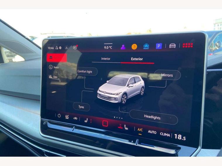Activated carbon canister, Adaptive cruise control (ACC), Advanced driver attention and drowsiness monitor, Dynamic road sign display, E-Sim card for online connectivity, eCall emergency call system, Multi-color Digital cockpit pro, selection of different info profile possible, Multifunction front facing camera for distance control, Navigation system, Oncoming vehicle braking when turning including swerve support, Speed limiter, Speedo, rev counter, electronic odometer, trip, service interval display, exterior temperature and fuel gauge, Voice enhancer and voice control, Warning signal and warning light for front and rear seatbelts not fastened, We connect plus preparation, We connect preparation, Wireless app connect, Hybrid propulsion system, Petrol Particulate Filter, Start-stop system with battery regeneration (recuperation - energy recovery during braking), XDS electronic differential lock for improved traction and handling, 2 USB C ports in front, 2 USB charging sockets on the centre console in the rear charging capacity upto 45W, Digital radio reception (DAB), Diversity antenna for FM reception, Gaming platform via car app, Infotainment system with 12.9" display, Mobile phone interface with inductive charging feature, 3rd brake light, Automatic headlamp activation with Coming home and Leaving home feature, Body colour door handles, Body colour door mirrors, Exterior mirrors convex on the left and aspherical on the right, Front and rear electric windows, Heat insulating windshield made of laminated glass, LED separate daytime running light, Rear exhaust tailpipe, Rear fog light on one side and reversing lights on both sides, Rear side wing doors, Rear tinted glass 65% light absorbing from B pillar backwards, Rear windscreen washer and wiper with interval delay, Remote electrically foldable door mirrors, puddle lights and reverse activated passenger's door mirror, Standard bumpers, Welcome light with surround lighting, 12V socket in front centre console, 12V socket in luggage compartment, 3 rear head restraints, 3 seat bench in 2nd row, Chrome plated radiator grille inserts, air vent surrounds and light switch surrounds, Front centre armrest, Front head restraints, Front seat lumbar support adjuster, ISOFIX anchors for child seats on outer rear bench seats and on front passanger seat compatible for i-Size, Luggage compartment lighting, Manual height adjustable front passenger seat, Manually height adjustable driver seat, Plastic gear knob, Rear cupholder and loadthough, Single front passenger seat, Soul black instrument panel, Split folding backrest with centre armrest and unsplit rear seat bench, Standard pedal cluster, Storm grey roof lining, Sun visors with illuminated vanity mirrors, Technology park and comfort pro package - Golf Hatchback, 3 point height adj front seatbelts + pretensioners, 3 rear three point seatbelts, ABS, Autonomous emergency braking front assist with pedestrian and cyclist monitoring, Child locks on rear doors, Driver and front passenger airbag with front passenger airbag deactivation, Electronic parking brake with auto hold, ESC (Electronic Stability Control), Extended pedestrian protection measures, Hill start assist, Rear disc brakes, Two tone horn, Tyre pressure loss indicator, Volkswagen roadside assistance, Anti theft wheel bolts, Preparation for alcohol interlock, Nature cross brushed decorative inserts for dashboard and front door panels,