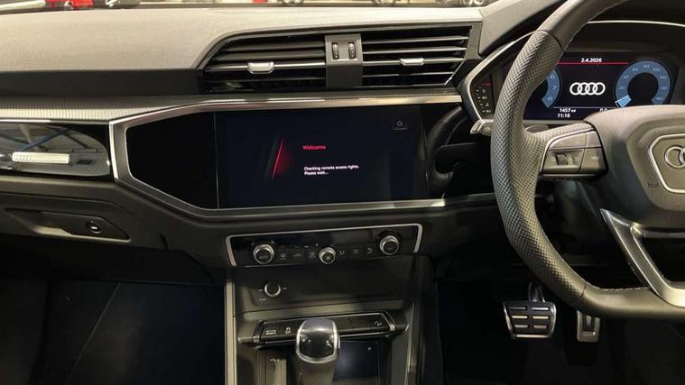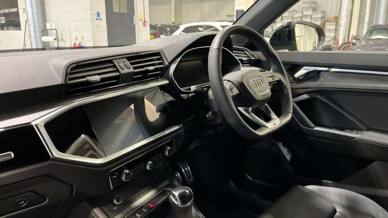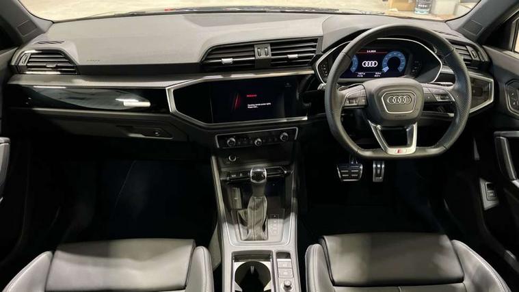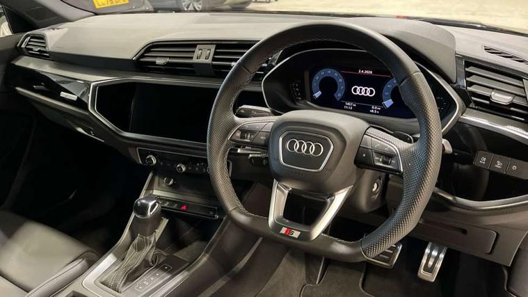 Amazon alexa Integration, Audi connect safety and service, Audi drive select, Audi lane departure warning, Audi Virtual Cockpit - 10.25" display, Bluetooth interface, Camera based traffic sign recognition, Distraction and Fatigue warning, Legal emergency call, MMI Navigation Plus with high resolution 10.1 inch touchscreen colour display, Power operated tailgate, Progressive steering, Service interval indicator, Smartphone interface includes wireless Apple carplay/Android Auto, Start stop system with recuperation, Voice control system with natural language interaction, Sports suspension, 2 USB-C ports with charge and data functions, 6 passive loudspeakers, DAB digital radio module, Acoustic windscreen, Anthracite black radiator grille, Audi Beam uses LEDs to project the Audi logo onto the ground as you exit your Q3, Auto dimming door mirrors, Auto dimming frameless rear view mirror, Black roof rails, Electrically folding, adjustable and heated door mirrors with integrated LED side indicators and kerb view function for passenger side, Front and rear electric windows, Front fog lights, Grille vertical bars in aluminium silver/Matt, High gloss black finish B and C pillars, LED Dynamic rear indicators, LED headlights with LED daytime running lights, LED rear lights, LED third brake light, Privacy glass dark tinted rear and rear-side windows (from B-pillar backwards), Rain and light sensors, Rear diffuser grille in grained matt black, Rear diffuser strip in matt anthracite black, Rear side wing doors, Rear wiper, S line bumpers in contrasting Manhattan grey, Variable front intermittent wipers, 12V socket in rear centre console, 3 seat bench in 2nd row, 40:20:40 folding with manual adjustment for 60:40 forwards/backwards position and backrest angle, Adjustable rear seat bench/backrest with centre armrest and cupholder, Black carpet mats, Black cloth headlining, Dual zone electronic climate control, Electric lumbar support, Front and rear black floor mats with contrast stitching in rock grey, Front and rear headrests, Front centre armrest, Height and reach adjustable steering wheel, Illuminated door sill trims with S logo, ISOFIX child seat mounting for front passenger with airbag deactivation and outer rear seat including top tether attachment point for outer rear seats, Luggage compartment sill protection in stainless steel, Manual front seats with height adjustment, Perforated leather gearknob, Single front passenger seat, Stainless steel pedals, Twin leather upholstery with front sport seats + S embossing, Black styling pack - Q3, Non smoking pack - Q3, 3x3 point rear seatbelts, 6 airbags - Driver, front passenger, curtain and side windows, Audi pre-sense front with pedestrain and cyclist recognition, Electrically operated child locks on rear doors, Electromechanical parking brake, Electronic stabilisation control including ABS, ASR and EDL, Front seatbelt reminder, Hill descent control, Hill hold assist, Pre sense basic, Seatbelt monitoring, Tyre pressure warning, Warning triangle and first aid kit, Anti theft wheel bolts, Immobiliser, Remote central locking, Thatcham approved category 1 anti theft alarm, Aluminium look interior elements, Detail dashboard around MMI touch colour display in glass look, black with surround in aluminium look, Leatherette door armrest, Piano black inlay,