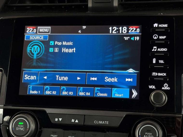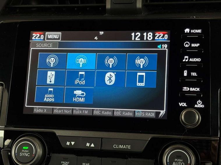7" touch screen, Adaptive cruise control, Adaptive motion for electric power steering, Apple car play/Android Auto, Blue dashboard illumination, Bluetooth hands free telephone connection, Easy fuel capless refuelling system, Economy mode, Electric power steering wheel with variable gear ratio steering, Emergency stop signalling system, Forward collision warning, Front and rear parking sensors, Honda CONNECT with GARMN Navigation + 7" touchscreen, AM/FM, internet radio, aha app integration and internet browsing, Idle stop, Intelligent speed limiter, Lane departure warning system, Lane keep assist, Multi-information display, Rear parking camera, Road departure mitigation, Traffic sign recognition, Vehicle stability assist, 'Shark fin' mobile antenna, 180w Power audio system, 2x USB and HDMI, 8 Speakers, Auxiliary socket for external MP3 player, Digital Audio Broadcast (DAB) Tuner, Steering wheel mounted audio controls, Automatic coming/leaving home lighting function, Automatic headlights with dusk sensor, Automatic rain sensing wipers, Black grille, Body colour door handles, Body coloured bumpers, Chrome window surround, Electric adjustable heated door mirrors, Electric front/rear windows/one touch operation, Electrically folding door mirrors, Fuel filler cap, Halogen front fog lights, High beam assist, LED daytime running lights, LED Headlights, LED rear lights, Power foldback door mirrors, Privacy glass, Rear spoiler, Rear wiper, Single exhaust tailpipe, 4 Cargo net hook, 60/40 split folding rear seat, Alloy pedals, Ambient light in roof, Blue meter illumination, Centre console storage and sliding armrest, Cloth upholstery, Driver and front passenger seat electric lumbar adjustment, Driver's seat height adjustment, Dual climate control air conditioning system, Front accessory power socket, Front map lights, Front/rear courtesy lights, Gear shift indicator, Glovebox light, Isofix points, Isofix system on outer rear seats, Leather gear knob, Leather steering wheel, Luggage floor box, Passenger seat back pocket, Rear accessory power socket, Rear air vents, Rear armrest with cupholder, Shift indicator lighting (SIL), Sunvisors with illuminated vanity mirrors, Three height adjustable rear head restraints, Tilt/telescopic adjustable steering wheel, Tonneau cover, Trunk light, 5 three point seatbelts, ABS+EBD+Brake assist, Airbags - driver and front passenger, Anti-whiplash front headrests, Collision mitigation braking system, Deflation detection system, Driver SRS airbag (single stage inflation), Electronic parking brake with auto hold, Front and rear curtain airbags, Front and rear seat belts with emergency locking retractor (ELR), Front seatbelt pretensioners, Front side airbags, Hill start assist, Low speed safety system, Passenger airbag deactivate switch, Tyre pressure warning, Immobiliser, Mirrors and windows key fob, Remote central locking with 2 jack knife keys, Security alarm, Selectable door unlock, Superlocking, Ultrasonic security sensor, Black instrument panel, 17" Grey alloy wheels, Tyre repair kit,