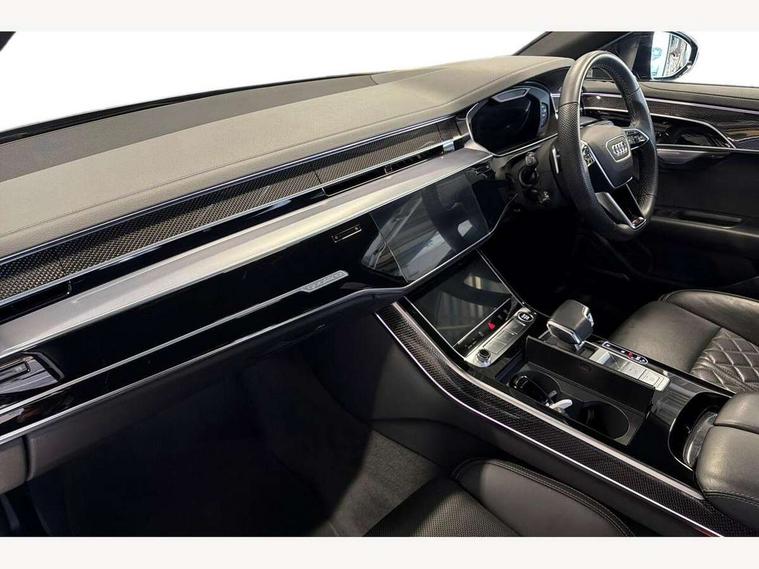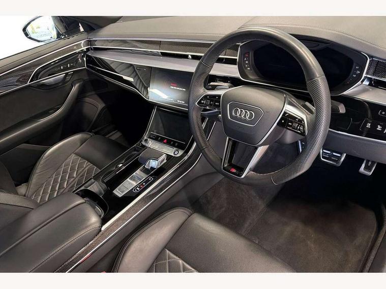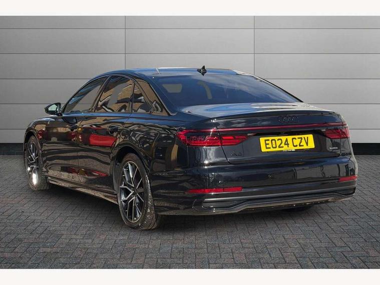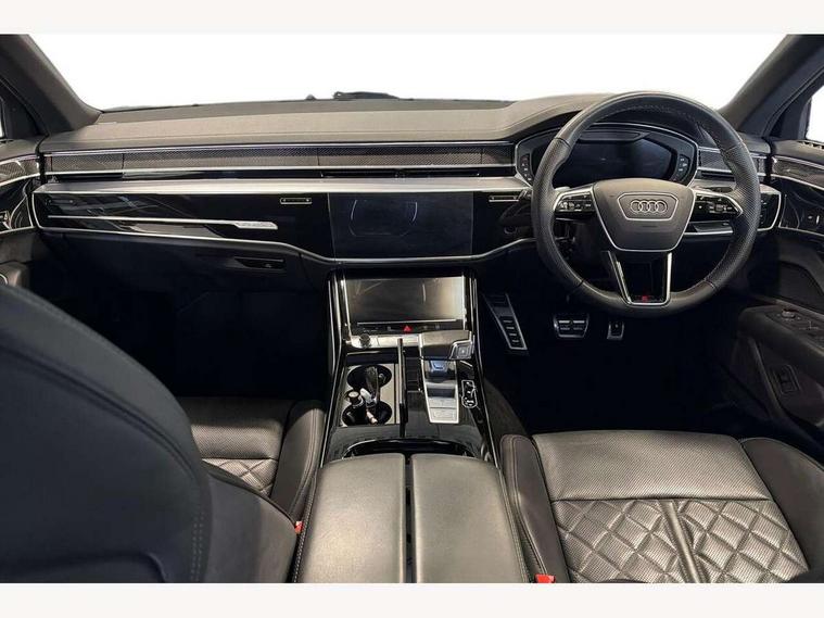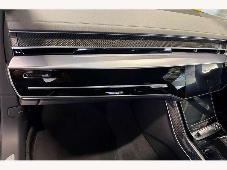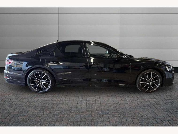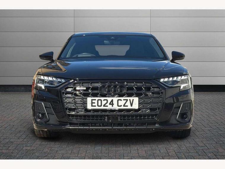 'Lights On' Reminder warning buzzer, Adaptive cruise control with cruise assist, emergency assist, efficiency assist, swerve assist, turn assist and speed limiter, Audi connect safety and service (e-call), Audi drive select, Audi parking system plus with front and rear sensors, Audi smartphone interface with app store includes wireless Apple carplay, Android auto and Amazon alexa integration, Audi virtual cockpit, Bluetooth interface, Camera based traffic sign recognition, Convenience key, Electro - mechanical power assisted steering, Head up Display, MMI navigation plus with MMI touch + Twin touch screens with haptic feedback, Operating buttons in black, glass look with haptic feedback including extended aluminium look, Power door closure, Power operated tailgate, Rear view camera, Remote fuel filler release, Service interval indicator, 24 litre AdBlue tank, 48V Mild hybrid technology, 8 speed transmission with hill hold assist, 82 litre fuel tank, Adaptive air suspension, Diesel particulate filter, Quattro all wheel drive with self locking centre differential, Audi music interface, Audi sound system, DAB digital radio module, MMI radio plus, USB connection, Acoustic double glazing, All-weather, manoeuvring, position, static cornering, turning and motorway lights with automatic dynamic headlight range control, Audi space frame, Auto dimming rear view mirror, Body colour bumpers, Electric front windows, Electric rear windows with isolation switch, Electric sunblinds for rear window and rear door windows, Electrically adjustable heated folding + automatically dimming exterior mirrors with memory function and integrated LED indicators, Front wash/wipe with interval delay, HD matrix LED headlights with dynamic light presentation and dynamic indicators, Headlight cleaning system, Heat insulating darkened glass in side and rear windows, Heat insulating glass windscreen, Heated rear window, Heated windscreen washer jets, High beam assist, LED brake lights, LED daytime running lights, LED third brake light, OLED rear lights with changeable rear light signature, Privacy glass, Rear boot, Rear side wing doors, Welcome/leaving lighting, 12V socket, 2 zone automatic air conditioning, 3 seat rear bench with centre armrest in 2nd row, 4 way electric lumbar support for driver and front passenger, Audi phone box light, Black cloth headlining, Centre console with cupholders, Comfort centre armrest front, Door pockets with bottle holder, Driver and front passenger side sunvisors with illuminated vanity mirrors, Dust/pollen filters, Electric front seats with memory function, Front floor mats, Glove compartment cooling, Heated front seats, Height/reach electric steering column with easy exit function, Illuminated door sill trims with aluminium inlays and S diamond emblem, Isofix child seat mounting points on outer rear seats, Leather gearknob, Passenger footwell storage net, Reading lights, Rear floor mats, Rear headrests, Roof mounted sunglasses holder, Single front passenger seat, Stainless steel pedals and footrest, Valcona leather upholstery with front sports seats in diamond quilted with S embossed logo, Black exterior styling pack - A8 Black Edition, Chrome exterior pack - A8, Extended LED Interior multi coloured light pack - A8, 3 point seatbelts on all rear seats, ABS/EBD, Active front headrest system, ASR traction control, Audi pre sense basic, Audi pre sense front, Black brake calipers, Driver/Front Passenger airbags, EDL traction control, Electromechanical parking brake, ESP, Extended pedestrian protection measures, Front and rear disc brakes, Front and rear side airbags with head airbag system, Front passenger airbag deactivation, Rear child proof door locks, Seatbelt reminder + electric contact in buckle + advanced safety equipment, Tyre pressure loss indicator, Warning triangle and first aid kit, Anti theft alarm tow away protection, Anti-theft wheel bolts and wheel loosening detection, Remote central locking, Carbon vector upper inlays, Dark matt brushed aluminium lower inlays,