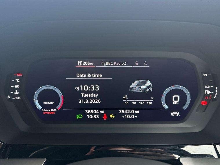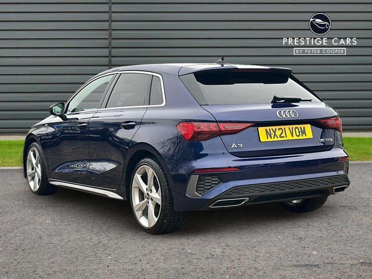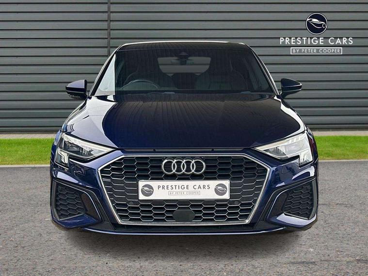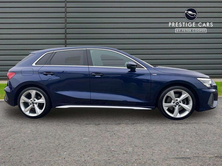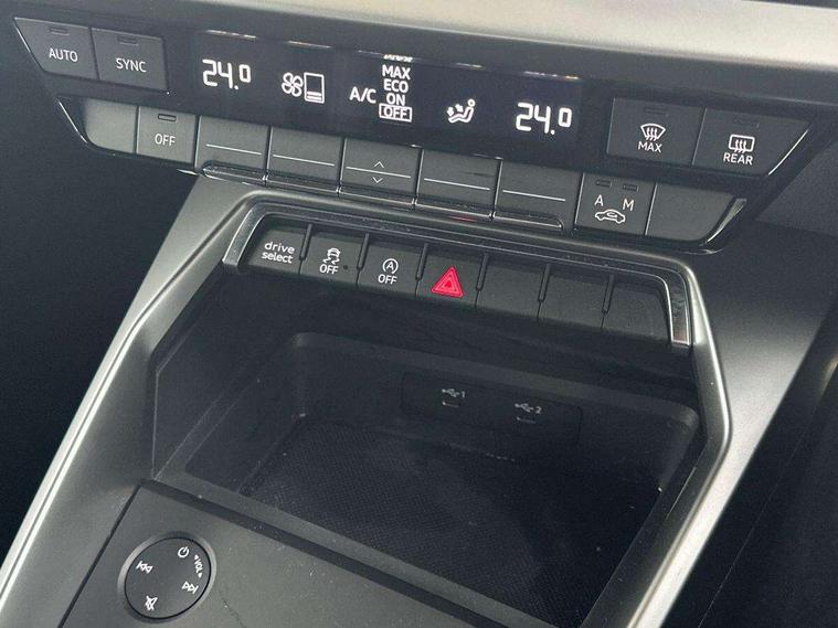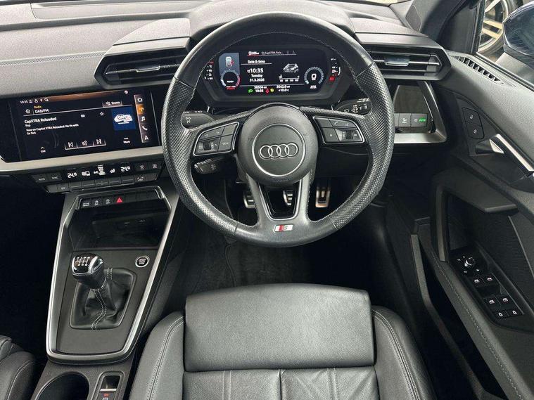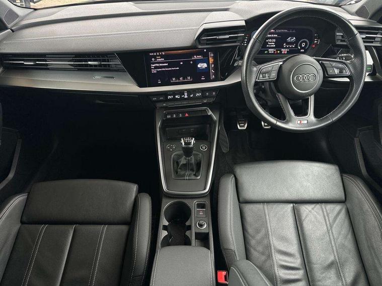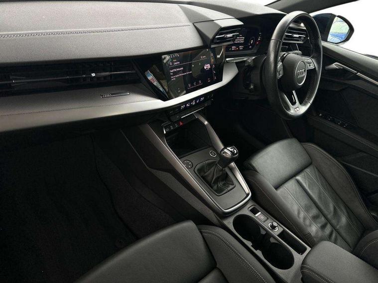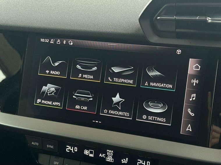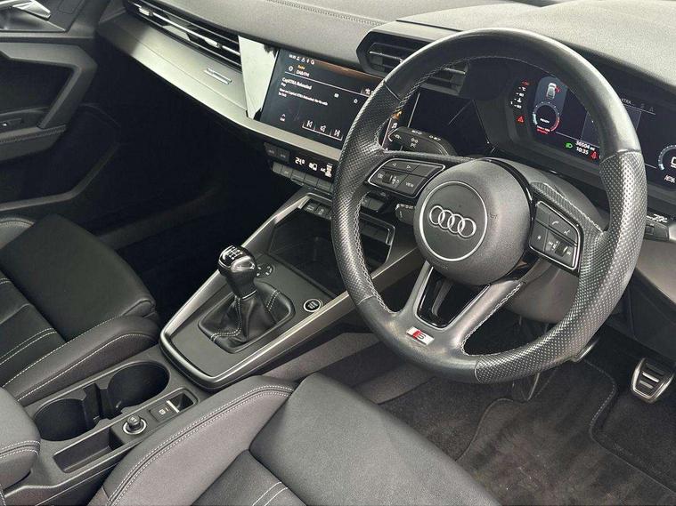 Audi connect emergency call and service, Audi drive select (Auto, Comfort, Dynamic, Efficiency and Individual), Audi smartphone interface, Audi Virtual Cockpit - 10.25" digital and colour instrument cluster, Automatic start/stop system with recuperation, Bluetooth interface, Collision avoidance assistant, Cruise control, Electromechanical power speed sensitive steering, Lane departure warning system, MMI Navigation Plus with high resolution 10.1" colour touch screen display, Rear parking sensors, Service indicator, Trip computer, Voice control system with natural language interaction, 2xUSB-C connection with data and charging functions, 6 passive loudspeakers, DAB Digital radio, Acoustic glass windscreen, Aluminium window trim, Auto dimming frameless rear view mirror, Electrically adjustable/heated/folding/dimming door mirrors with kerb view includes integrated LED indications + kerb view function for passenger side, Front electric windows, Illuminated aluminium inserts front door sills with S logo, LED daytime running lights, Light and rain sensors, Privacy glass - dark tinted rear window, rear door and side windows, Rear electric windows, Rear side air outlets in grained matt black, Rear wiper, S line bumpers, S roof spoiler, 12V socket and storage compartment in front centre console, 40/20/40 split folding rear seat bench with cupholder, Black cloth headlining, Dual zone electronic climate control, Front and rear centre armrest in leather, Front and rear headrests, Front/rear floor mats, Height and reach adjustable steering wheel, Interior lighting - glove compartment light and right hand side, Luggage compartment floor covering, Manual boot compartment lid, Manually adjustable front seats, Seat side bolsters, Stainless steel pedals and front footrest, Twin leather upholstery with front sports seats S embossed logo, Aluminium interior elements pack - A3 Sportback, S line styling pack - A3 Sportback, 3x3 point rear seat belts, Driver and front passenger airbag with passenger airbag deactivation, Electronic Stabilisation Control (ESC) including ABS, ASR and EDL, First aid kit with warning triangle and 2 safety vests, Front side airbags with head airbags and interaction airbag, Hill hold assist, Pre-sense front with pedestrian and cyclist detection, Seatbelt monitoring, Tyre pressure loss indicator, Anti theft alarm, Anti-theft wheel bolts, Electronically operated child lock, Immobiliser, Remote control central locking, Accent surfaces in the dashboard and centre console in platinum grey silk effect paint finish, Dark spectrum aluminium inlays,