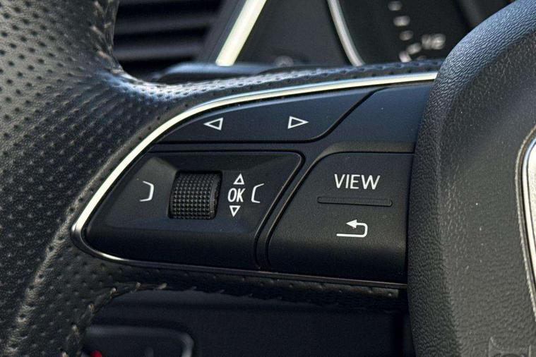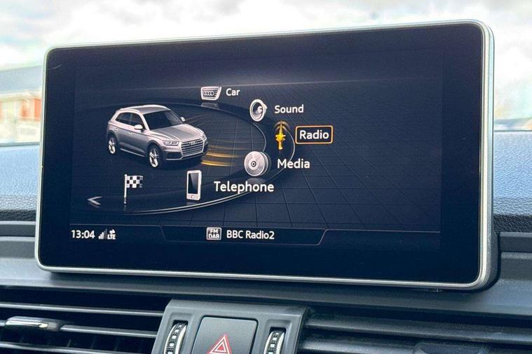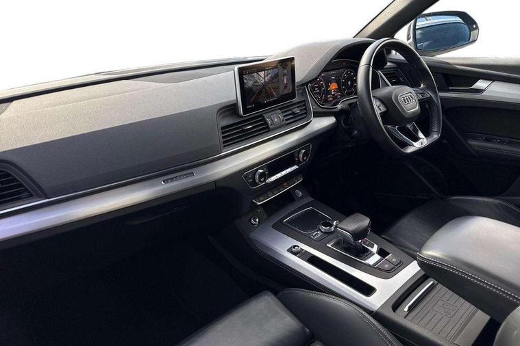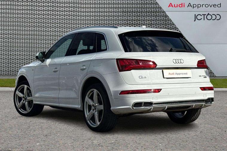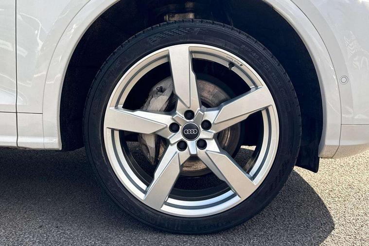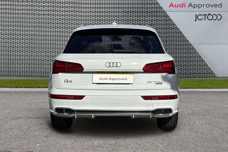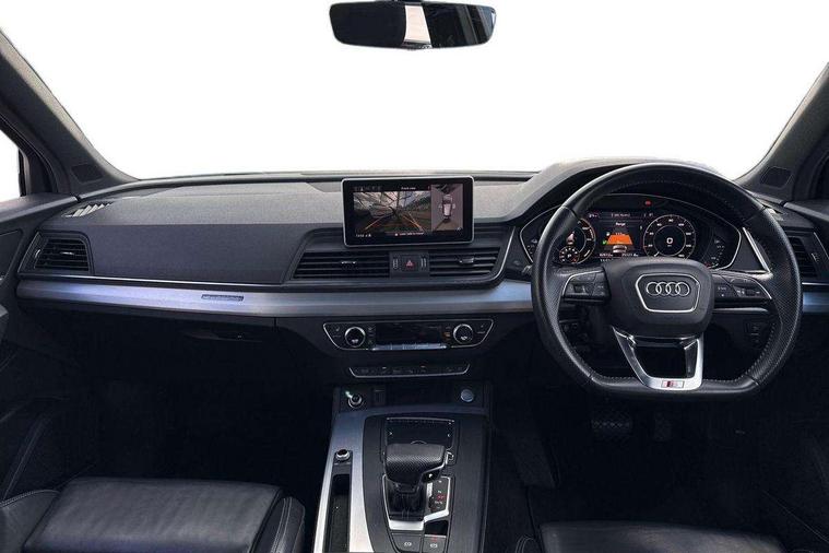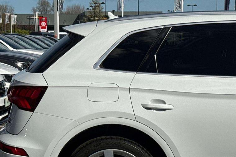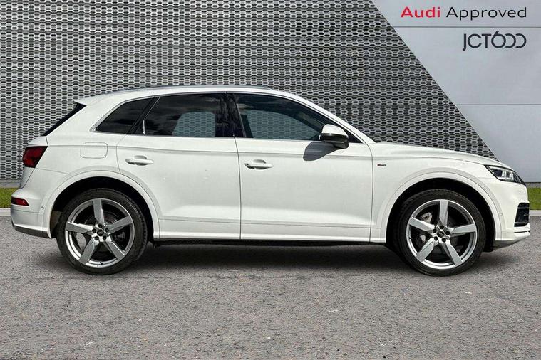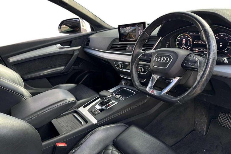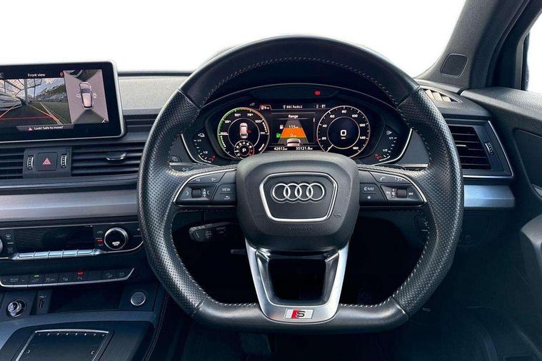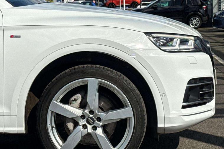 Audi connect safety and service (e-call), Audi drive select, Audi phone box with wireless charging, Audi smartphone interface, Audi virtual cockpit - 12.3" high resolution LCD digital instrument cluster display, Automatic start-stop system with coasting functionality and efficiency programme, Electro - mechanical power assisted steering, MMI navigation plus with 8.3" colour MMI screen and MMI touch, Mobile telephone preparation - bluetooth interface, Power tailgate, Service interval indicator, Voice control system, 3 pin 10 amp domestic charging cable, Dynamic suspension, Mode 3 32amp charging cable - Type 2, Quattro on demand, 2x SD card slot, CD player, DAB Digital radio, MMI radio plus with 7" colour MMI screen and MMI controller, Acoustic windscreen, Aluminium roof rails, Audi Beam uses LEDs to project the Audi Sport logo, Auto dimming rear view mirror, Automatic headlight levelling, Body colour bumpers, Body colour door mirrors, Body colour S Line side skirts, Body colour S specific rear diffuser, Body colour underbody protection, Chrome exhaust tailpipe, Chrome rear bumper inserts, Electric adjustable/heated/folding door mirrors, Front and rear electric windows, High beam assistant, LED headlights with LED rear lights + dynamic rear indicators, Light and rain sensor for auto activation of lights and windscreen wipers, Loading sill protector in stainless steel, Privacy glass with front acoustic glazing, Rear wiper, S air inlet in titanium black, S front and rear bumpers, S Line badges on the front wings, S Line rear spoiler, Twilight grey matt radiator grille with matt aluminium horizontal chrome struts, 2 x USB charging port with aux input socket, 3 rear headrests, 3 spoke flat bottom high multi-function leather steering wheel, 4 way electric lumbar support for driver and front passenger, 40:20:40 split folding rear seat with rear centre armrest, Black cloth headlining, Contrast stitching on seats, steering wheel and gear lever gaiter, Deluxe 3 zone electronic climate control, Fine Nappa leather upholstery with diamond stitching, Front centre armrest, Front sport seats with S embossed logo, Front/rear floor mats, Fully electrically adjustable driver's seat, Fully electrically adjustable front passenger seat, Heated front seats, Height adjustable front head restraints, Height/reach adjustable steering column, Illuminated door sill trims with S logo, ISOFIX child seat mounting and top tether, Luggage compartment carpet, Massage function for front seats, Perforated leather gearknob, Rear seat bench plus, Removable luggage compartment floor, Sunvisors with vanity mirrors, Tool kit, Trunk roller cover, Extended leather pack - Q5, High gloss pack - Q5, Non Smokers pack, 3 point seatbelts on all seats, 6 airbags - Driver, front passenger, curtain and side airbags, Electromechanical parking brake, Electronic stabilisation control including ABS, ASR and EDL, Front passenger airbag deactivation, Hill descent control, Hill hold assist, Multi collision brake assist, Pop-up bonnet for pedestrian protection, Pre sense city, Seat belt force limiter, Seatbelt monitoring, Tyre pressure warning, Warning triangle and first aid kit, Anti theft alarm, Anti-theft wheel bolts, Keyless Go access/ignition system, Remote central locking, Matt brushed aluminium inlays, Tyre repair kit,