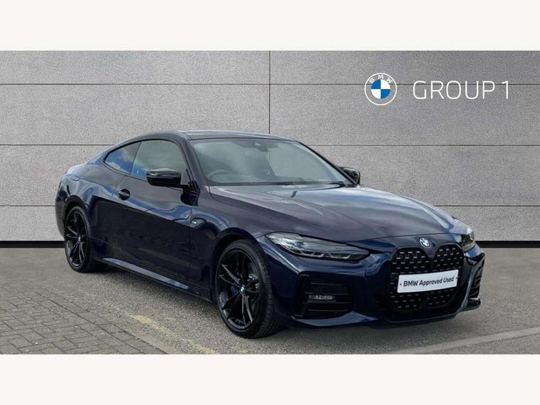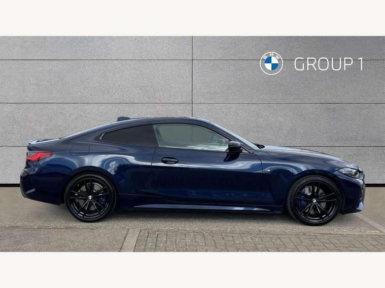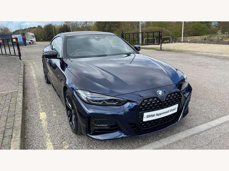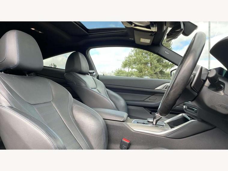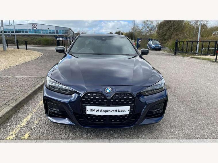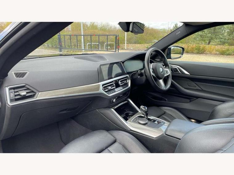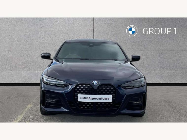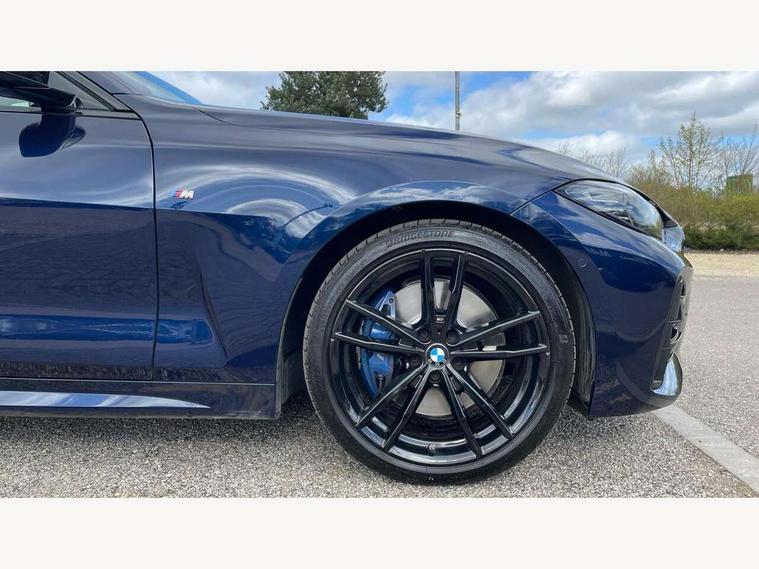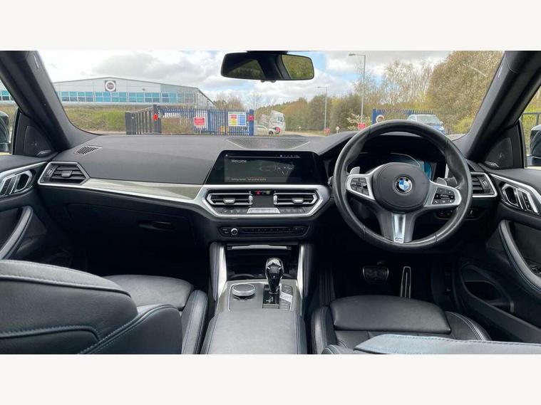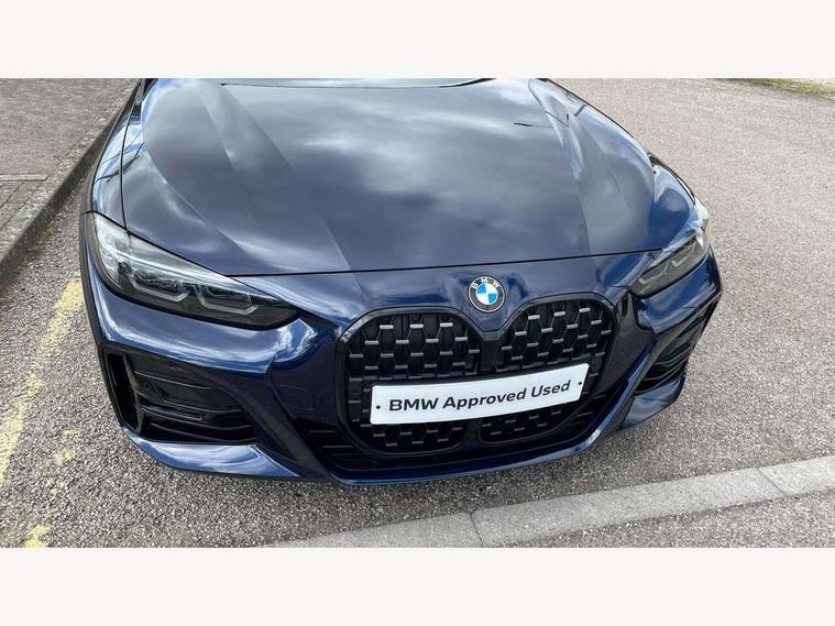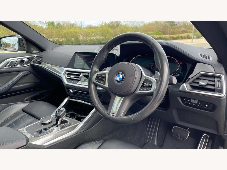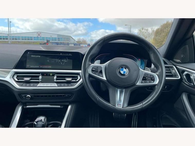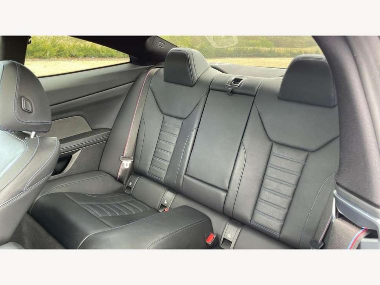 Active guard plus, Attentiveness assist, Auto start-stop, BMW ConnectedDrive online services, BMW iDrive controller on centre console, BMW Live Cockpit Professional Nav with 12.3" instrument display + 10.25" display, Intelligent Voice Assist, BMW OS 7, HDD, 2USB, 4G LTE connect, BMW service history, BMW Teleservices, Brake pad wear indicator in front and rear, Check Control warning system for monitoring of lights and door/luggage compartment open warning, Condition based service, Electric power steering, Electric power steering with Servotronic steering optimised at all speed ranges, Gearshift time display in manual mode, Instrument cluster with speedometer with mph readout, tachometer, fuel gauge and oil temperature gauge, Integrated owners handbook, Oil sensor for level and grade, warning by check control system, On board computer - average speed, fuel consumption, outside temp display with acoustic warning, clock/date, service interval, odometer/trip meter, Optimum shift indicator, Variable sport steering, 8 speed automatic steptronic transmission with gearshift paddles, Active sound design, Adaptive M suspension, Balanced 50/50 weight distribution, Double VANOS, Drive performance control - ECO PRO, comfort and sport modes, Electronic differential lock control (EDLC), High precision injection, Low centre of gravity, Petrol Particulate Filter, Sprint mode, Stroke dependent dampers, VALVETRONIC engine management, DAB tuner, Electronic service booklet, Acoustic glazing, Adaptive LED Headlights, Automatic headlight beam throw control with load dependent regulating reaction, dynamic compensation of braking dive and acceleration squat, Automatically dimming electrochromatic rear view mirror, Black mirror caps, BMW emblem on engine compartment lid and tailgate, BMW Individual high gloss shadow line with extended contents, BMW individual lights shadow line, BMW Individual metallic paint work, BMW kidney grille with mesh grille front side of the nuggets in matt aluminium and frame in chrome high gloss, Body colour fuel filler flap, Body colour roof fin, Brushed aluminium inserts in the front door sill finishers with BMW designation, Dynamic brake lights, Electric windows - front and rear, with open/close fingertip control, anti trap facility and comfort closing function all round, Exhaust tailpipe - split left and right, Exterior mirrors - electrically folding with anti-dazzle, Fading support, Front and rear bumper system, Front apron plastic in body colour, Green tinted heat protection glazing, Illuminated bow type door handles in body colour drivers side with door lock, Interior rear view electrochromatic mirror with automatic anti dazzle function, LED front fog lights, Licence plate panel integrated into front bumper and tailgate, Lightweight engineering, M designation on front side panels, left and right, M rear spoiler in high gloss black, Model designation on right side of tailgate, One piece front bumper cover including towing eye cover in body colour, Preparation for high beam assistant, Rain sensor, Side frame decorative moulding black matt, Sun protection glass, Two part LED tailights in L-shape with components in smoked glass, brake light, LED turn indicator and rear fog light, Visible VIN plate, Welcome lights in interior and door handle area, Widened track and increased camber values for max transverse dynamics, agility and steering precision, Window recess cover black high gloss, Windscreen wipers with integrated washing jets, 12V power socket in front centre console, 2 front cupholder in centre console with clamping elements and matt black inlay, 2 Rear seat headrests, 3 spoke M leather multifunction steering wheel, 3 zone automatic air conditioning, 4 pieces lashing eyelets in luggage compartment, 40:20:40 split folding rear seat and rear centre armrest with two cupholders, Ambient lighting with welcome carpet light, Anthracite headlining, Armrest integrated in front and rear door trim + front centre console armrest, Four grab handles integrated in roof lining, Front and rear door exit lighting (left / right), Front and rear door pockets, Front and rear footwell lights, Front and rear reading lights, Front headrests, Front seat backrest width adjustment, Front sport seats, Heated driver and front passenger seats, Height adjustable mechanically and infinitely variable steering column, Illuminated armrest storage compartment, Illuminated glove compartment with separate small compartment, Luggage compartment light, Make-up mirror lights, Storage compartment in rear centre console, Sunvisors with vanity mirrors and ticket pocket, Toolkit located in luggage compartment, Velour front floor mats, Connected professional package - 4 Series, M sport exterior styling pack - 4 Series, 2 x 3-point rear seatbelts, Battery safety cut-off, BMW emergency call, Brake energy regeneration, Braking pre-tensioning, Child proof locking system in rear door, Child seat ISOFIX attachment for the two outer rear seats, Coasting in idle in ECO PRO mode, Cornering brake control (CBC), Crash sensor activating of airbags, Unlocking doors, hazard warning lights, interior light, safety battery terminal, Driver and front passenger side airbags, integrated in the door side seat backrest bolsters for all seat variants, Driver/Front Passenger airbags, Dry braking, Dynamic brake control, Dynamic stability control + (DSC+) - Anti-lock Braking System (ABS) with brake assist and cornering brake control + Automatic Stability Control (ASC), Dynamic Traction Control - DTC, Electric parking brake including automatic hold function and automatic release of the parking brake when driving off, Front and rear ventilated brake disc, Front passenger manual airbag deactivation, Head airbags for all 4 outer seats, Hill start assistant, M Sport seatbelts, Seat belt security check for driver and front passenger, Seat belt with belt stopper, pyrotechnic belt tensioners and belt force limiters, Side impact protection, Tyre pressure mon