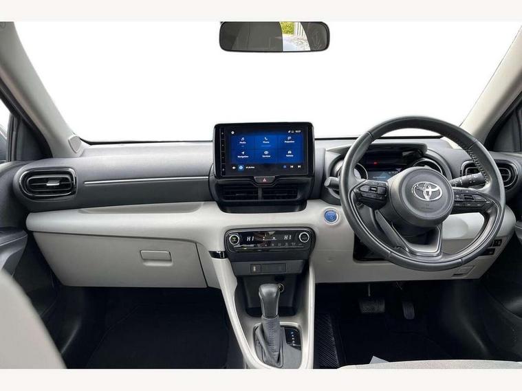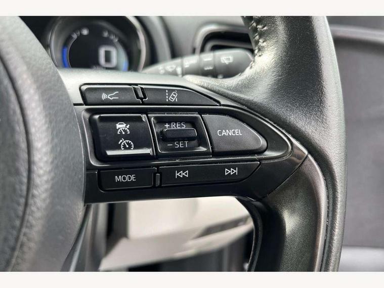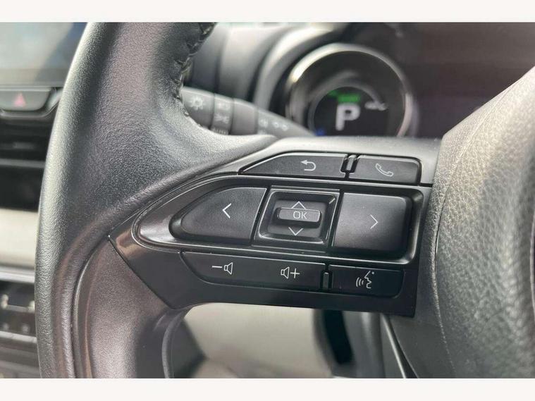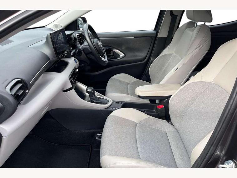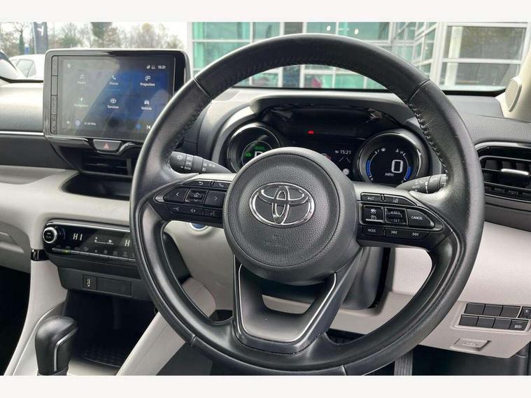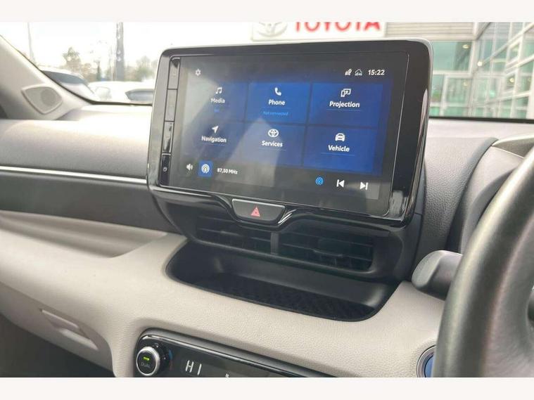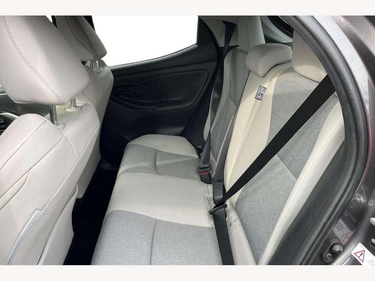 Adaptive cruise control, Adjustable speed limit with speed warning, Blind spot monitoring, Bluetooth connectivity, Colour binocular inspired displays with digital speedometer, E-call, Electric power steering, Hybrid energy display, Multi information display switches on steering wheel, Reversing camera, Smartphone integration with Apple CarPlay and Android auto, Tailgate, Touch 2 navigation system, Voice recognition, Vehicle Stability Control (VSC), 6 speakers, 9" HD multimedia display touch screen with Toyota smart connect, USB connection, Acoustic windscreen glass, Auto windscreen wipers, Automatic headlights, Automatically retractable door mirrors, Body coloured door mirrors, Electric adjustable heated door mirrors, Follow me home headlights, Front auto power windows with anti jam protection, Full LED rear lights, LED daytime running lights, LED front fog lights, LED front light guide, LED Headlights, LED High mounted stop lamp, LED Indicators, LED rear light guide, Manual headlight levelling, Painted chequered front grille, Rain sensor, Rear auto power windows with anti jam protection, Rear privacy glass, Rear side wing doors, Rear spoiler, Rear wiper, Satin lower front grille, Shark fin antenna, Turning signal integrated indicators in door mirrors, Variable front intermittent wipers, 3 adjustable rear headrests, 3 seat bench in 2nd row, 3 spoke leather steering wheel, 60/40 split folding rear seat, Active headrests, Adjustable boot height, Coat hooks in rear grab handles, Cup holders (2 front & door), Data Communication Module (DCM) connected services, Dual zone automatic air conditioning, Fabric seat with partial synthetic leather upholstery, Front armrest, Front sport seats, Glovebox, Grey roof lining, Height adjustable driver's seat, Height adjustable passenger seat, Isofix seat fixing, Leather gearshift, Map pockets on the backs of the front seats, Pollen filter, Shopping bag hooks, Single front passenger seat, Tilt/telescopic steering column, Parking pack - Yaris, 3 point seatbelts on all rear seats, ABS+EBD+Brake assist, Electronic parking brake, Emergency brake light system (EBS), Front passenger airbag on/off switch, Front seatbelt reminder, Hill start assist control (HAC), Rear child proof door locks, Rear seat belt reminder, Supplemental Restraint System (SRS) 8 airbags: Driver & passenger's airbags, dual side curtain airbags, side impact airbags, front centre airbag, Toyota Safety Sense 2, Precollison + Night time Pedestrian & Cyclist Detection, Lane Trace Assist, Auto High Beam, Intelligent ACC & Road Sign Assist, Tyre pressure warning system, 2x Master key, Alarm/immobiliser, Keyless smart entry with push button start, Remote AC via MyT, Remote locking via MyT, Remote powered central double locking doors, Satin chrome interior styling, Soft touch instrument panel, Space saver spare wheel,