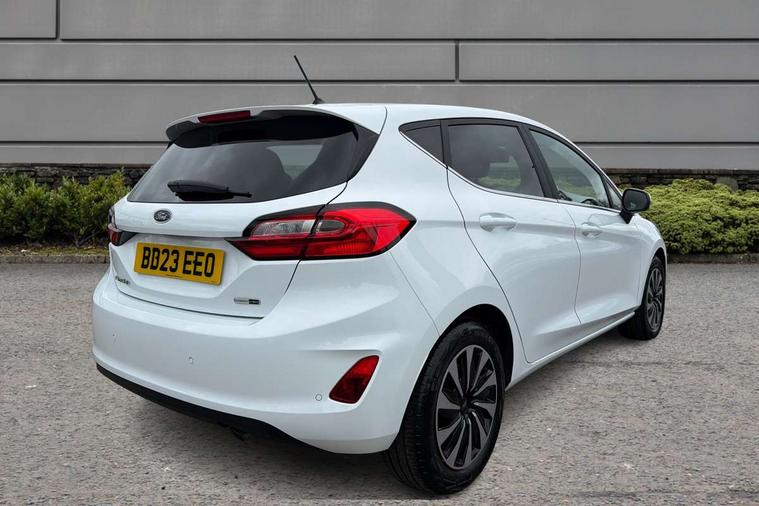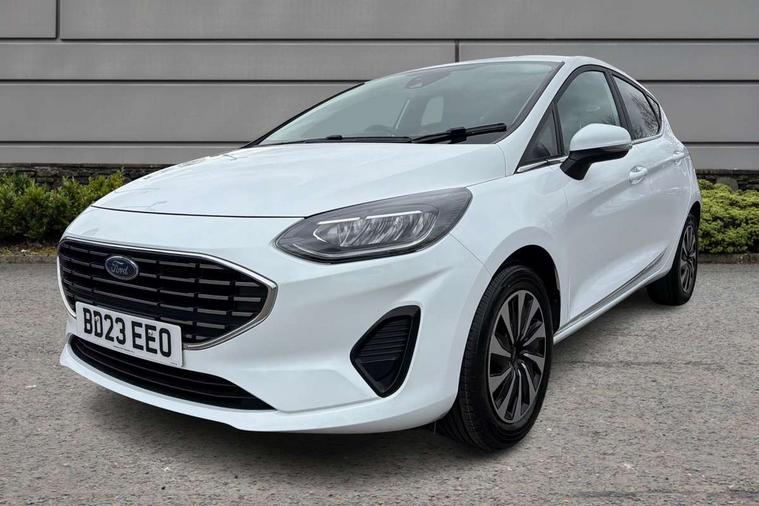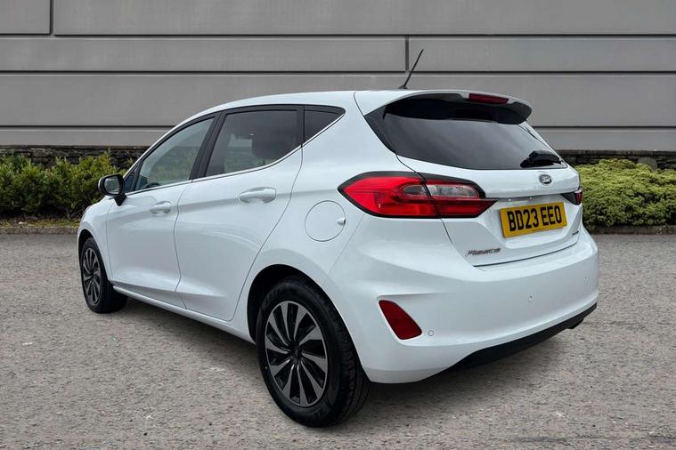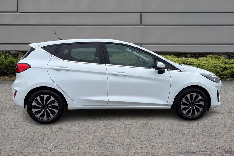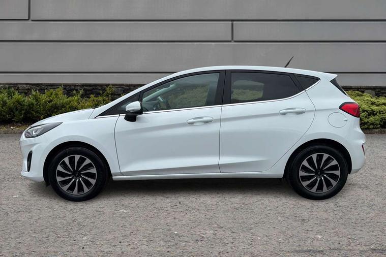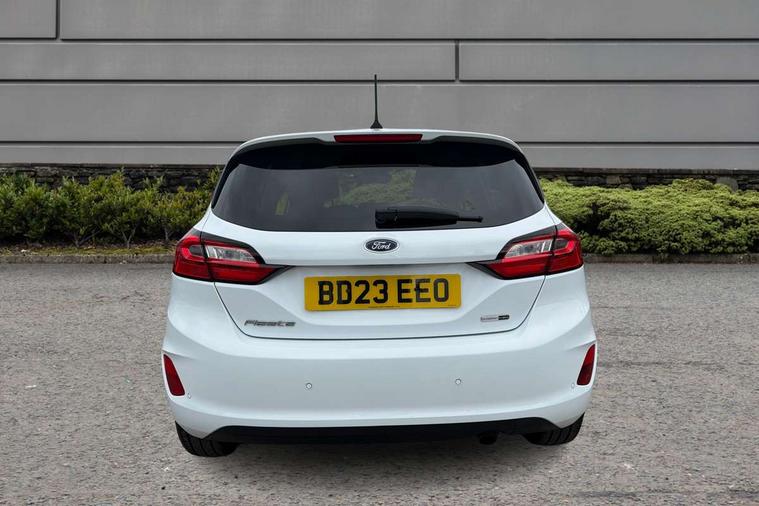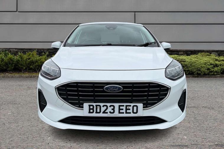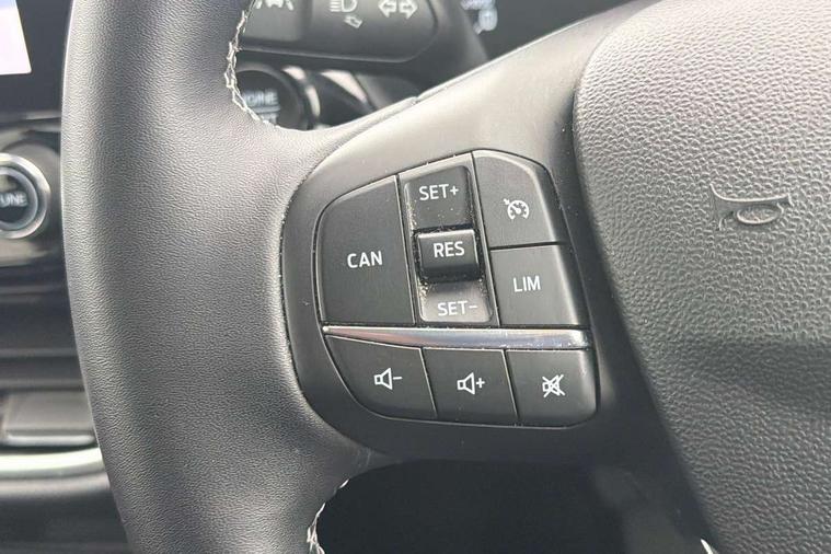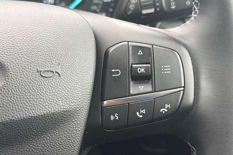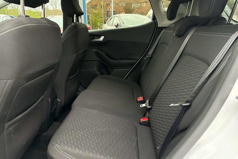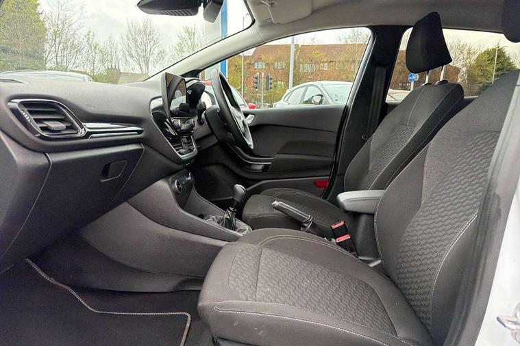 Bluetooth system, Electric power steering, Ford easy fuel, Ford SYNC 3 Navigation system incl 8" touchscreen, 7 speakers, FordPass connect, Apple carplay, android auto, voice control and emergency assistance, Rear parking distance sensors, Selectable drive modes (Normal, Sport, Track), Trip computer, 2 USB ports, Auxiliary input socket, DAB Digital radio, Steering wheel mounted controls, Body colour bumpers, Body colour door handles, Body colour rear spoiler, Body coloured electrically operated and heated door mirrors with side indicators, Chrome beltline trim, Chrome front grille, Chrome lower window surround, Cornering front fog lights, Electric front windows/one touch facility, Electric rear windows, Quickclear heated windscreen, Rain sensing wipers and auto dimming rear view mirror, Rear privacy glass, Rear wiper, 3 spoke leather trimmed steering wheel with audio control, 60/40 split folding rear seat, Adjustable head restraints, Boot carpet, Centre console with opening armrest, 2x cupholders, 12v and USB, Chrome inner door handles, Cloth upholstery, Footwell illumination, Front floor mats in velour, Front map reading lights, Front seat and rear pockets, Illuminated glovebox, Leather gaiter, Load area light, Luxury woven headliner, Manual 2 way passenger seat adjust, Manual 4-way driver seat adjust, Manual air conditioning, Overhead console with sunglasses holder, Pollen filter, Rake/reach adjustable steering wheel, Sensico wrapped steering wheel, NCAP Pack - Fiesta, 3 point seatbelts on all rear seats, ABS+EBA, Curtain airbags, Driver and passenger airbags, Drivers knee airbag, Electronic stability control with hill start assist, Front passenger airbag deactivation, Front side airbags, Seatbelt warning, Two tone horn, Tyre pressure monitoring system, Keyless start with 'Ford Power' starter button, MyKey system, Remote central locking & engine immobiliser, Thatcham Cat.1 alarm, 16" 10 spoke alloy wheels,