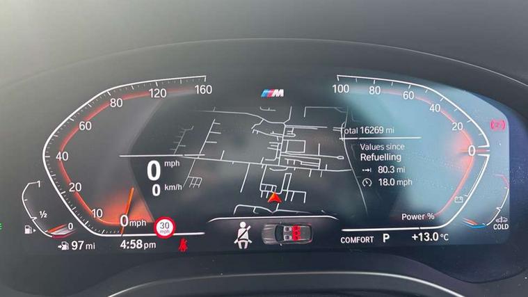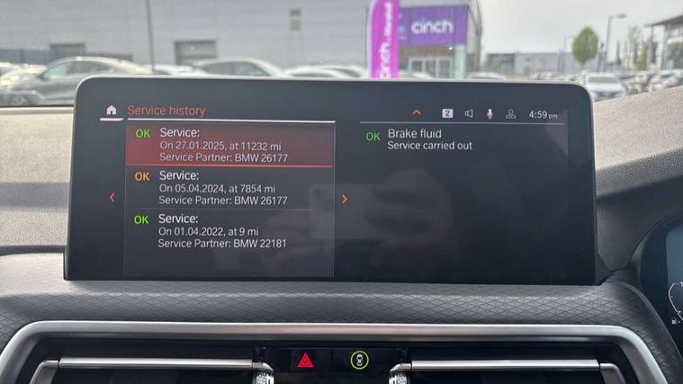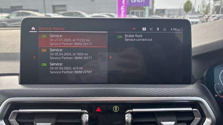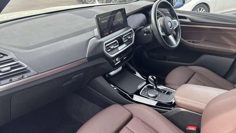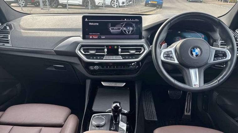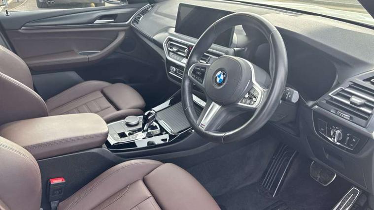 Active Guard, Attentiveness assist, BMW Live Cockpit Professional nav system including 12.3" instrument display + 12.3 high resolution control display, BMW Online services, BMW Teleservices, Brake pad wear indicator in front and rear, Check Control warning system for monitoring of lights and door/luggage compartment open warning, Condition based service - BMW service history, electronic service booklet, integrated owner's handbook, Connected drive services, Cruise control with brake function + speed limiter, Electric boot lid, Front/rear Parking distance control, iDrive Controller with 8 favourite buttons, Instrument cluster with speedometer with mph readout, tachometer, fuel gauge and oil temperature gauge, Lights on warning by audio warning signal when ignition is switched off, Oil sensor for level and grade, warning by check control system, On board computer - average speed+fuel consumption, service interval, clock/date, odometer/trip meter, outside temperature display and ice warning, Optimum shift indicator, Personal Profile - automatic lock when driving away selectable, Stop/start system, Variable sports power steering, Automatic transmission with gearshift paddles, Drive performance control with ECO PRO comfort + sport mode, Incorrect fuelling protection, M sport suspension, Multi-link rear suspension, Performance Control, BMW professional radio/CD/MP3, DAB tuner, Acoustic glazing, Automatic windscreen wipers and automatic headlight, Black finish on B pillars, Body colour door handles, Body colour electric adjust heated aspherical door mirrors, Body colour roof mouldings, Body coloured bumpers, Direction indicator, side repeaters, integrated in exterior mirrors, Dynamic brake lights, Exhaust tailpipes - dual, round, split left and right with chrome finisher, Fingertip control / anti-trap function on electric window, Folding wing mirrors with auto dimming, Follow me home headlights, Front and rear bumper system with replaceable deformation elements, Front and rear electric windows, Gloss chrome tailpipes finishers, Green tinted heat insulating glass, Heated windscreen washer jets, High beam assistant, High gloss black shadow line roof rails, High gloss shadowline exterior trim in decorative moulding side frame/recess cover/guide rail/B, C pillars/mirror frame and triangle with mirror base, High level 3rd brake light incorporating LED Technology, Interior rear view electrochromatic mirror with automatic anti dazzle function, LED tail lights, Lightweight engineering, M aerodynamic bodystyling, Model designation, Rear side wing doors, Rear wing door, Rear wiper, Shark fin antenna, Side exterior M designation badges, Visible VIN plate, Welcome lighting, Windscreen wipers with adjustable interval, 12V power socket in front centre console, 3 rear headrests, 3 zone automatic air conditioning, 4 lashing points to secure luggage, 40:20:40 split folding rear seat with loading system, 5 seats, Ambient lighting, Anthracite headlining, Automatic interior light when door is opened/ignition switched off or via remote key, Foldable storage floor with compartment, Four grab handles integrated in roof lining, Front and rear bottle holders integrated into door trim storage compartments, Front and rear side armrests integrated into door trim, Front centre armrest with storage compartment, Front footwell lights, Front head restraints, Front sports seats, Front/rear courtesy lights with soft on/off dimming, Front/rear reading lights, Heated front seats, Isofix rear child seat preparation, Leather gear knob, Luggage area underfloor compartment, Luggage compartment lighting, M sport leather steering wheel, Multifunction steering wheel, Parcel shelf removeable and storable under boot floor, Reach and rake adjustable steering column, Rear centre armrest with 2 cupholders, Removable / retractable luggage cover, Seat backrest width adjustment, Slope adjustable rear seats, Storage compartment in rear centre console and front/rear door trims, Sun visors with vanity mirrors and ticket pocket, Toolkit located in luggage compartment, Two front cupholders with removable oddments tray/lid, Vernasca leather upholstery, Connected pro pack - X3, Driving assistant pack - X3, ADB - Automatic Differential Brake, Anti-lock braking system (ABS) with brake assist, Automatic Stability Control (ASC), Battery safety cut-off, BMW emergency call, Brake drying, Brake energy regeneration, Braking pre-tensioning, Child locks on rear doors, Cornering brake control (CBC), Crash Sensor - activation of central locking release, hazard warning light and interior lighting, Deactivation of fuel pump in the event of a crash, Driver and front passenger front and side airbags with passenger deactivation and ITS front and rear head airbags, DSC+, Dynamic brake control, Dynamic Traction Control - DTC, Electromechanical parking brake, Hill descent control, Hill start assist, Seatbelt security check for front seats, Side impact protection, Three point seatbelts to all seats with front and outer rear pyrotechnic belt tensioners and seat belt force limiters, Two tone horn, Tyre pressure sensor, Ventilated front and rear disc brakes, Warning triangle and first aid kit, Central locking switch for all doors, fuel filler cap and luggage compartment, Electronic engine immobiliser, Locking wheel nuts, Remote control including two integrated key - one button for open/close all lockable content, windows and separate button for open luggage compartment, Remote control Thatcham category 1 alarm, Start/stop button with Comfort Go keyless engine start and auto Start/stop deactivation button, Low rolling resistance tyres,