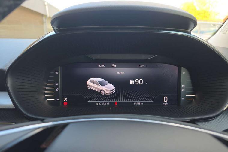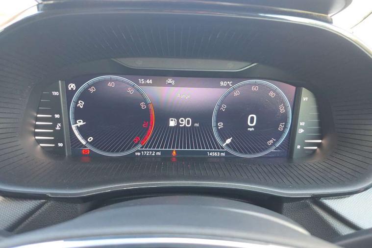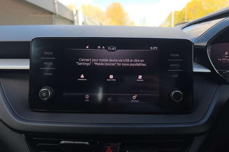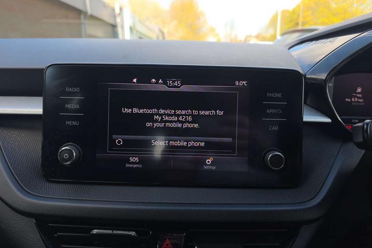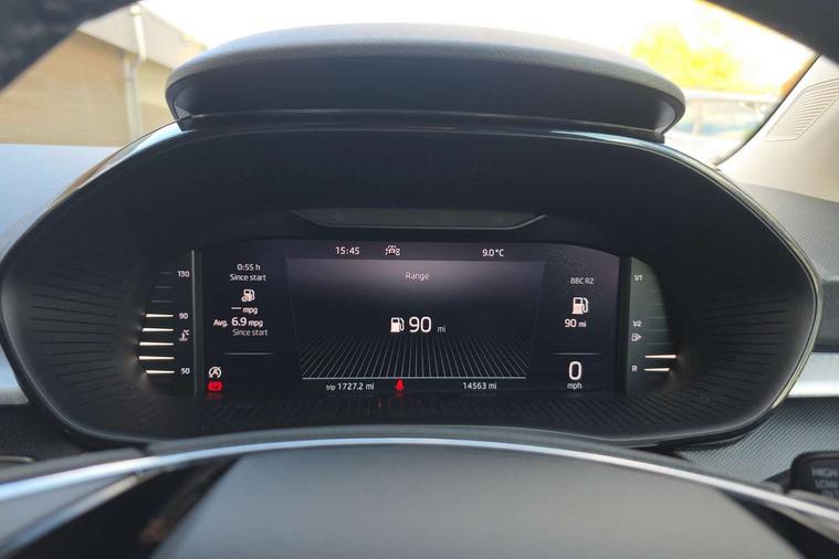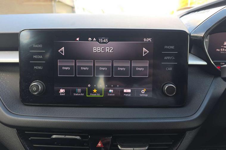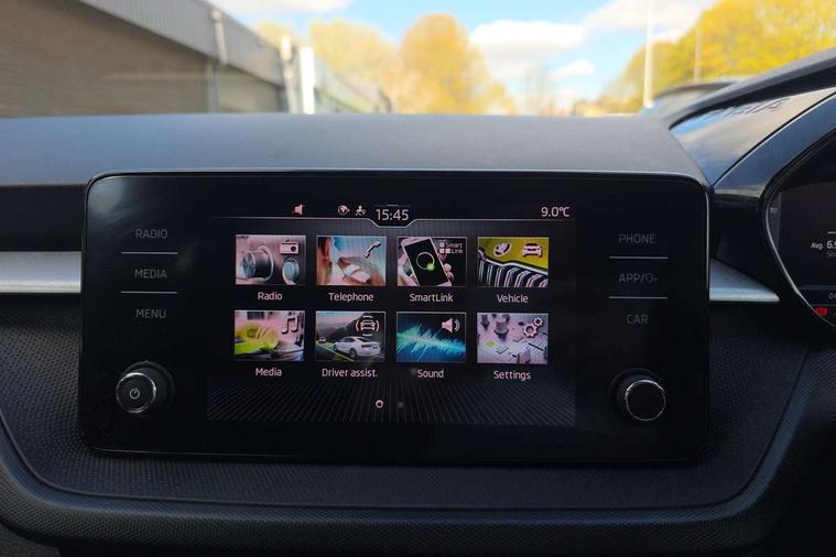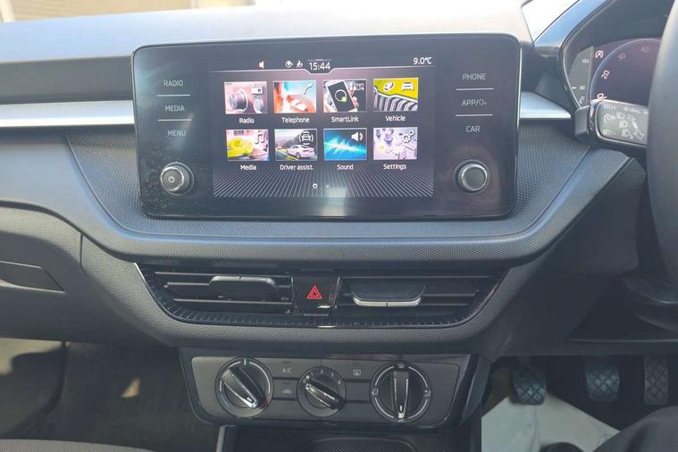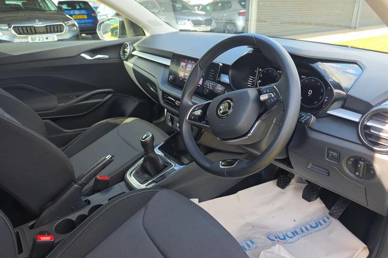 Bluetooth connection, Driver alert system - DAS, Electromechanical power steering, Exterior temperature gauge, Lane assist including road edge detection, Service interval indicator, Virtual cockpit with 10.25" colour display, 2x USB-C in the front (for data transmission and charging), 6 Speakers (4 in front and 2 in rear), Auxiliary socket for external MP3 player, Bolero radio with 8" colour display, DAB digital radio reception, Basic rear lights, Body coloured bumpers, Dimming rear view mirror with black frame, Door mirror integrated indicators, Electrically adjustable and heated door mirrors, Electrically adjustable front windows with function auto up/down, Front window wiper intermittent control, Headlight range control - Automatic, Ice scraper in fuel cap, LED daytime running lights with coming and leaving home feature, Mechanical adjustable rear windows, Privacy glass, Rear LED fog light, Rear side wing doors, Rear window wiper with washing nozzles, Roof colour door mirrors, Roof mounted spoiler, SKODA tailgate lettering in chrome, Third brake light, 3 rear headrests, Backrest split and folding, Central console with fixed cup holder and storage box, Chrome handbrake release button, Fabric upholstery, Gearshift knob/handle in leather, Grain satin black interior door handles, Hand brake lever handle in leather, Height adjustable front headrests, Height adjustable steering wheel, ISOFIX and TopTether anchorage points to the outer rear seats, ISOFIX and TopTether on the front passenger seat, Luggage compartment lighting, Pollen filter, Rear seat bench unsplit, Single front passenger seat, Storm grey headlining, Sun visors with mirror and airbag label on passenger side, Ticket holder, Umbrella in drivers door, 3-point height adjustable front seats belts with pretensioner and force limiter, Automatic warning lights in case of crash, Driver and passengers airbag with switch off function, e-Call+, ESC including ABS, MSR, ASR, EDS, HBA and XDS, Front and rear seat belt warning, FRONT ASSIST (AEB City and AEB Inter Urban), Front side airbags, Head airbags, One tone horn, Pedestrian protection, Three rear 3-points safety seat belts with pretensioner and force limiter including stop function for outer rear seat belts, Tyre pressure monitoring system, Anti-theft alarm system including immobiliser, interior monitoring, backup horn, and towing protection, Anodized cross line upper decorative trim, Colour Edition air vents, Grain satin black central console cover, Grain satin black lower decorative trim, Satin black door and side trim panel in front, Anti-theft wheel bolts protection, Super-low rolling resistance tyres,